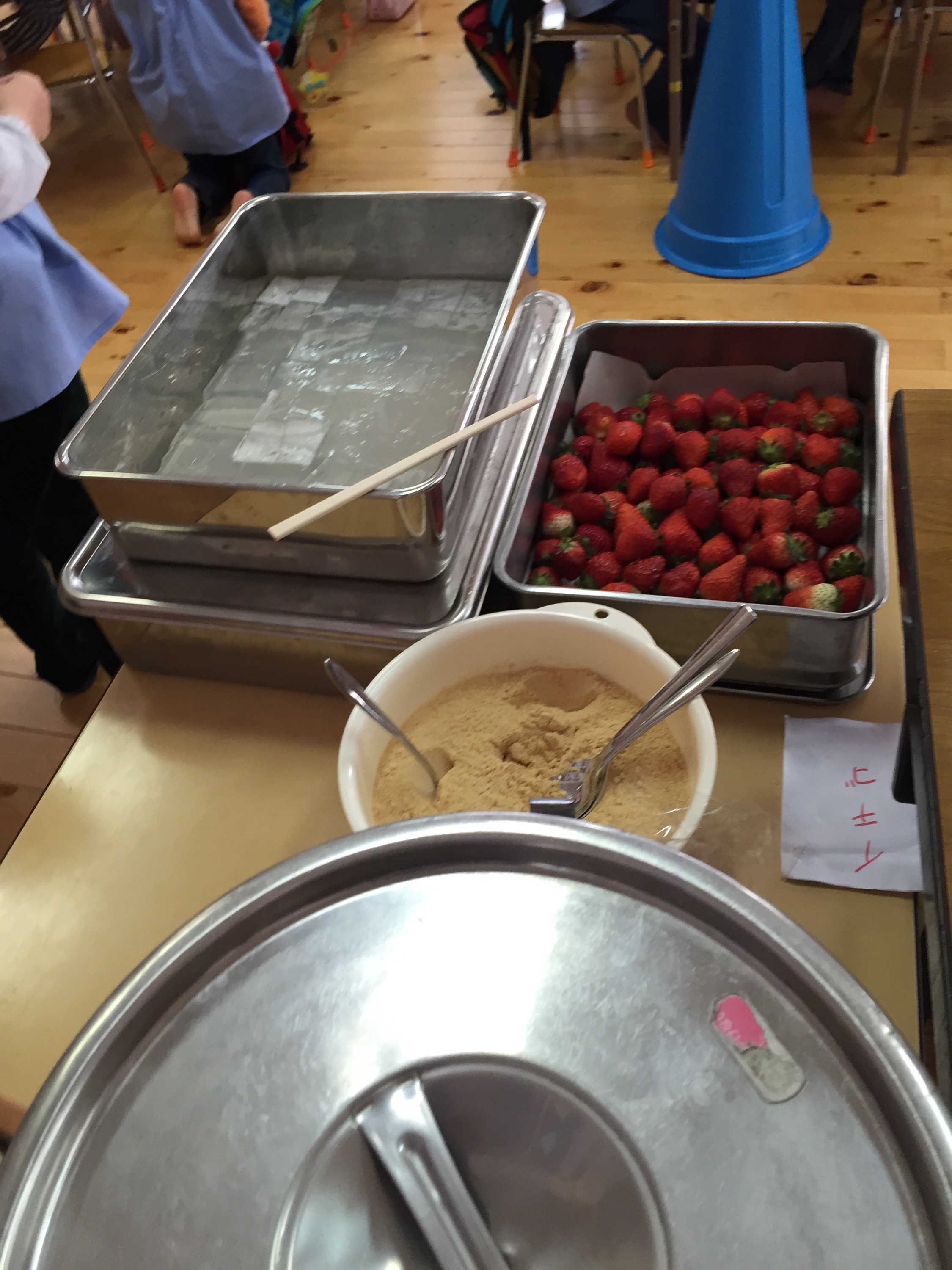 昼食は「なかよしランチ」ということで、ホールでみんなで給食を食べました♪そして、今日はいつも違うところが一つ。