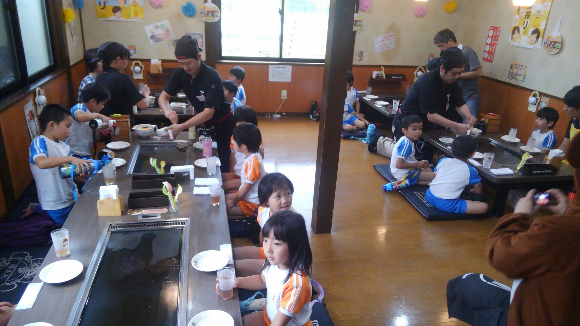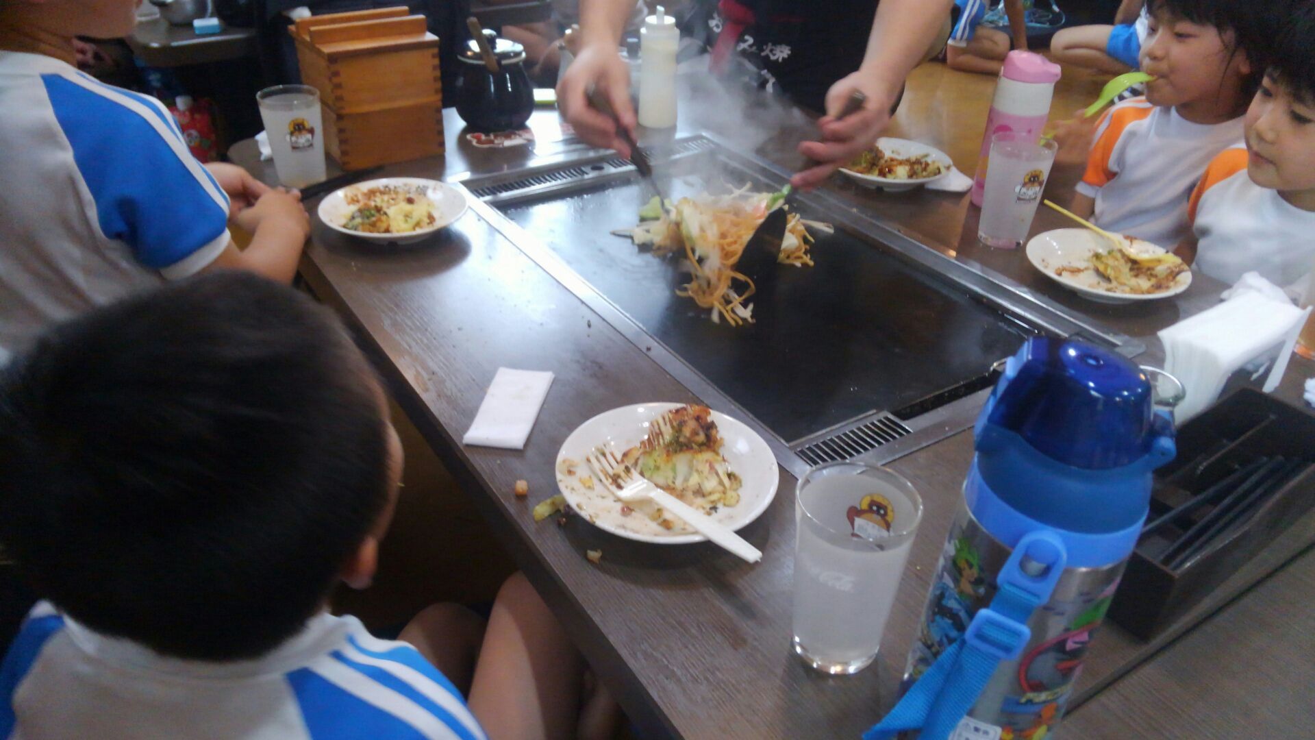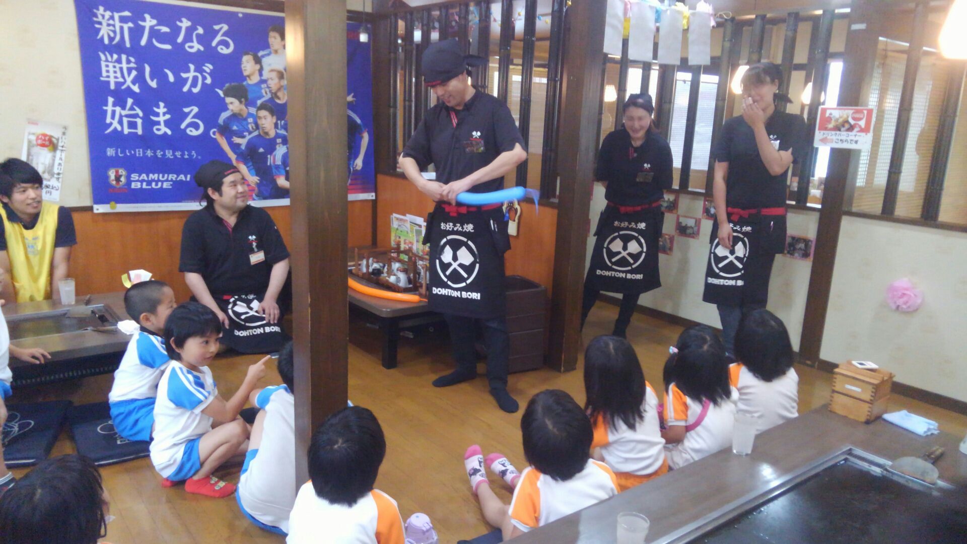 今日は年長さんが十文字にある「道とん堀」というお店からご招待を受けて、おいしいお好み焼きと焼きそばをごちそうになってきました🎵 バルーンアートのお土産もいただいたり、来週末に行われるキャンプに向けてのエールもいただいたりと、子どもたちも先生たちも、大喜び!楽しいおいしい時間を過ごしてきました♪