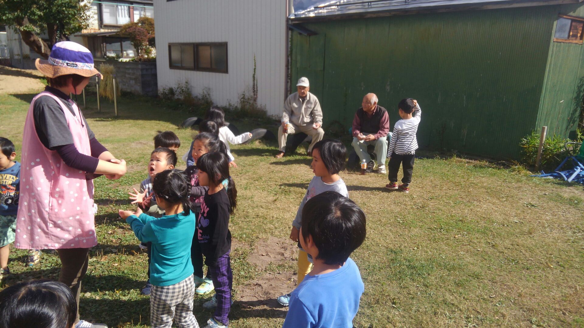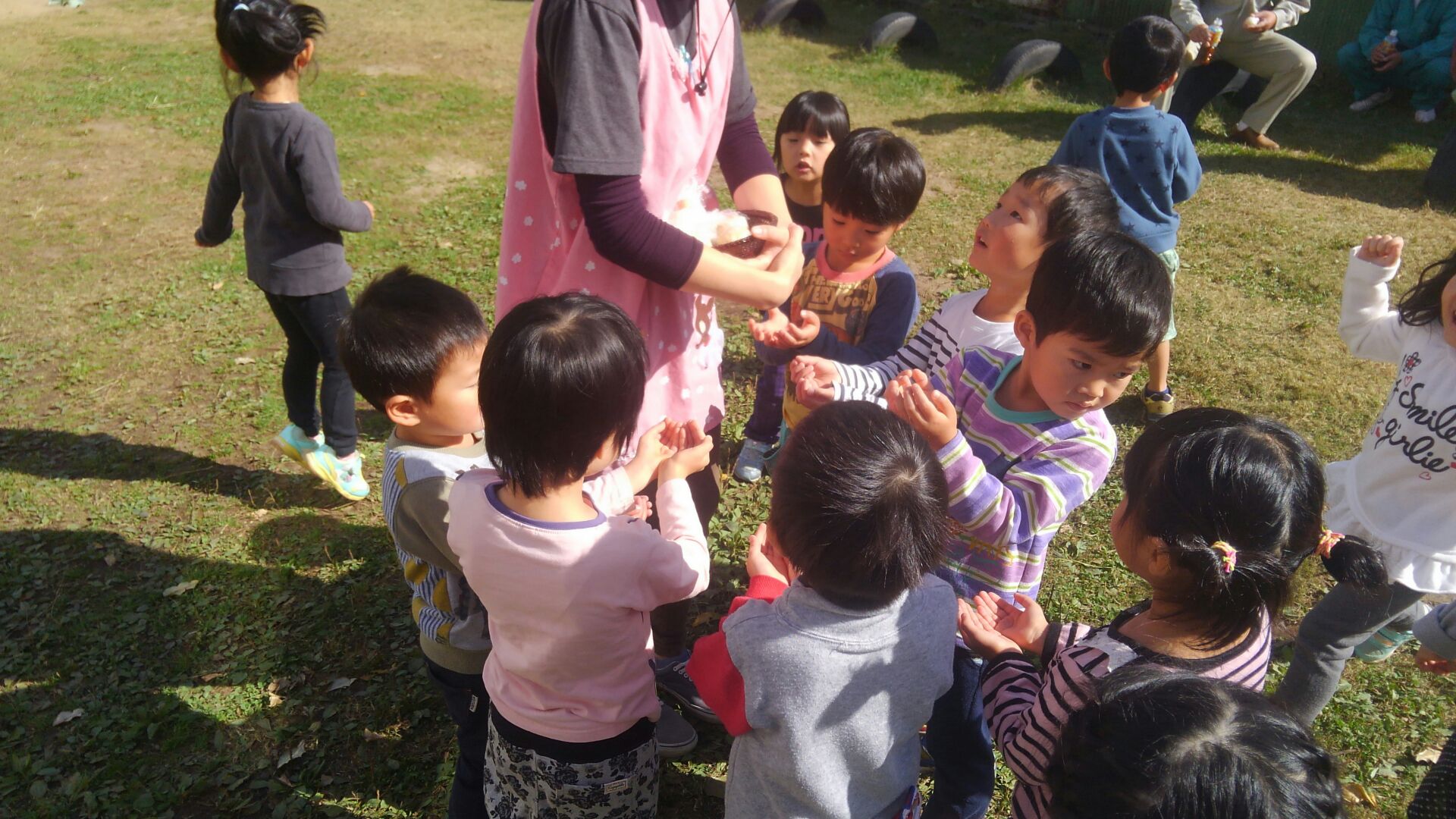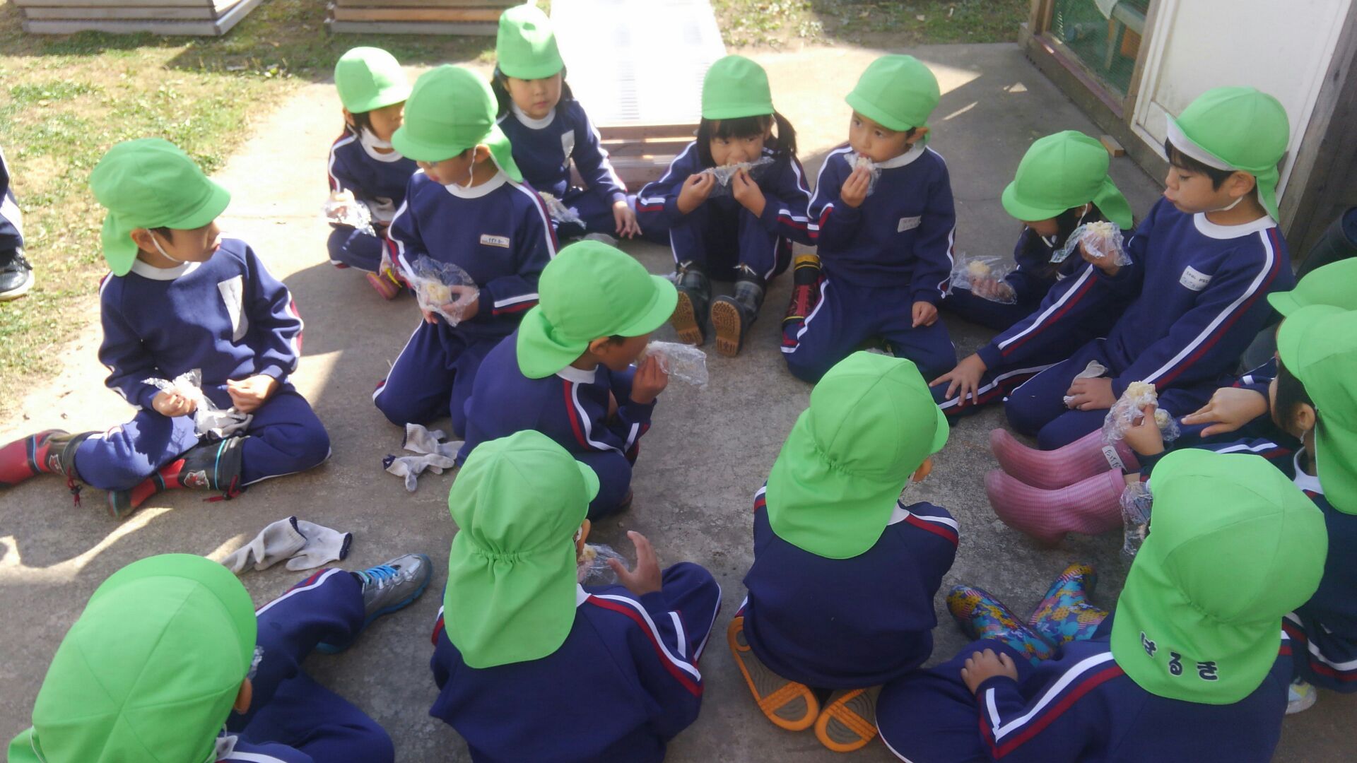 今日の冬支度の作業を手伝ってくださったおじいちゃん・おばあちゃんたちと年長さんに、年中さんが「手作りおにぎり」の差し入れをしてくれました♪ 作業を一段落して、お茶っこタイム⭐年中さんから、握りたてほやほやの温かいおにぎりをいただきました♪ お米を研ぐところから心を込めて作ってくれたおにぎりは、とても美味しく、力がもりもりわいてきました!後半の作業も、最後までがんばることができました♪