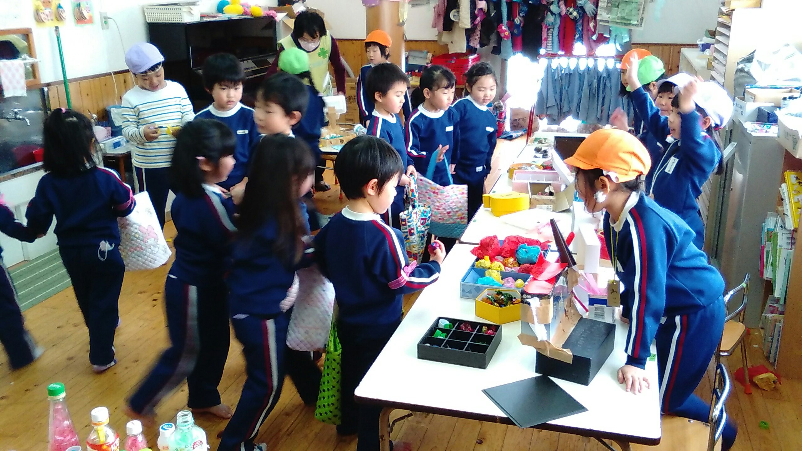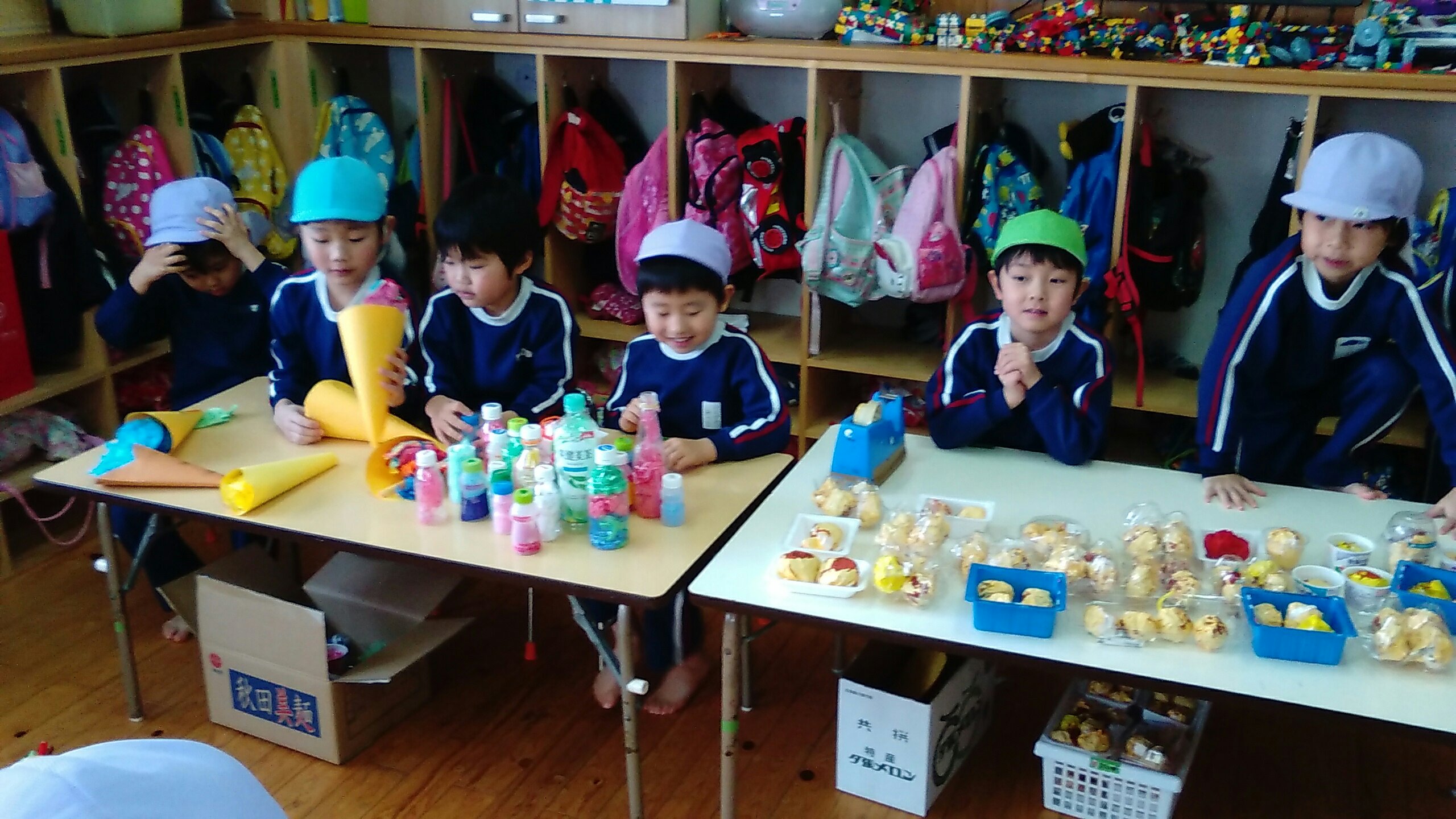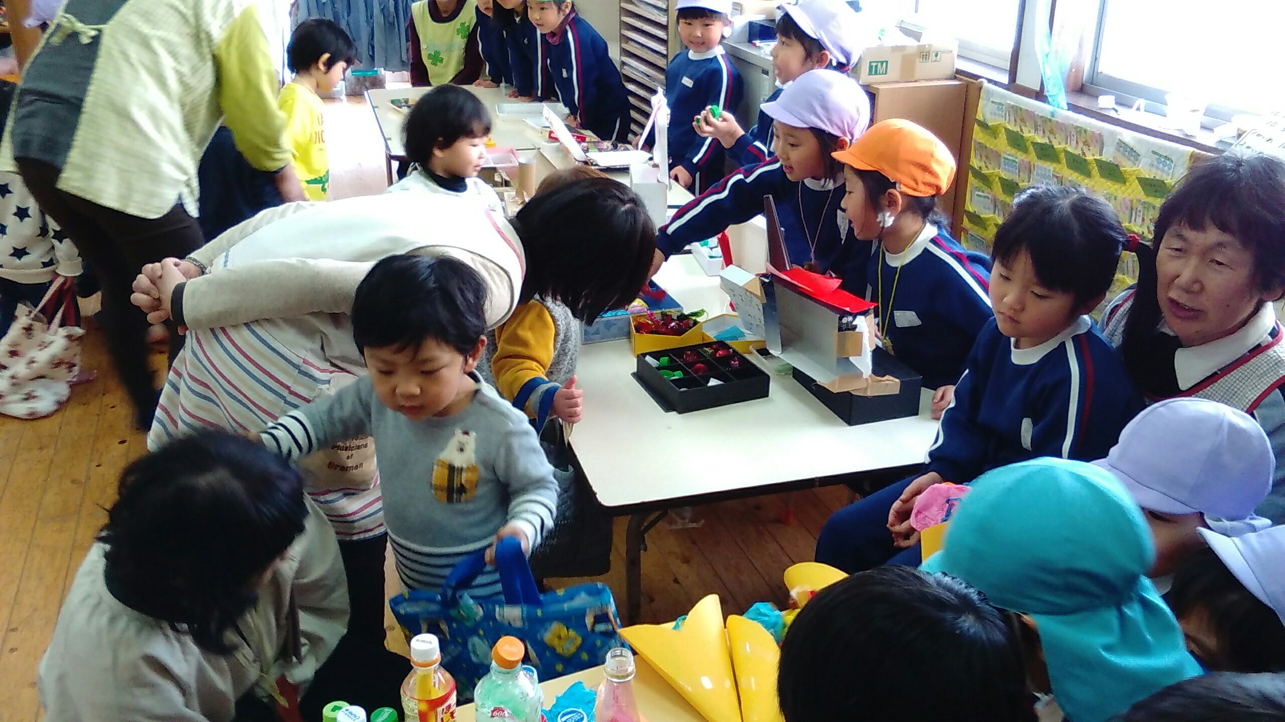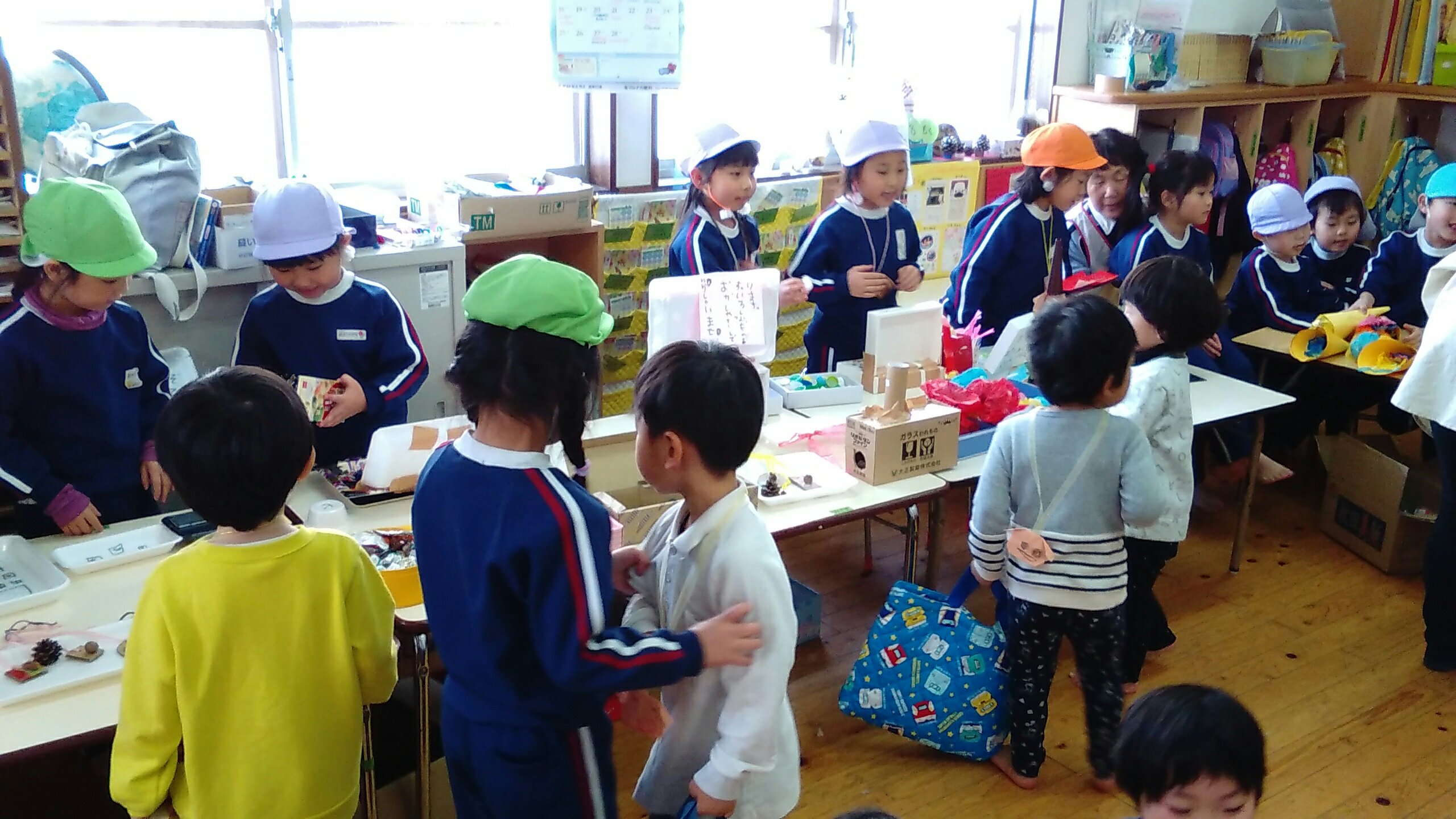 おみせやさんになったゆり組もすみれ組もたんぽぽ組も、元気よく