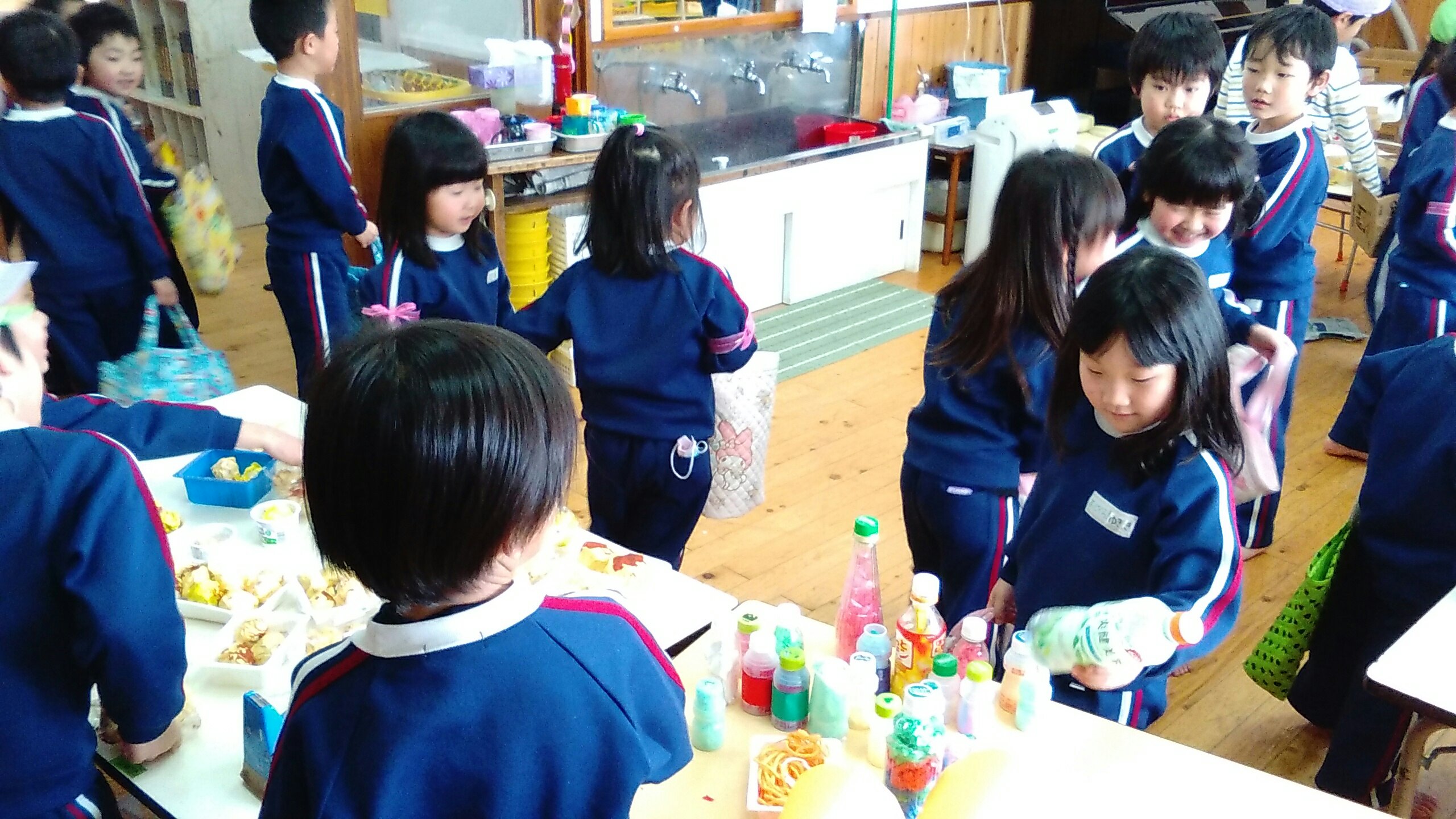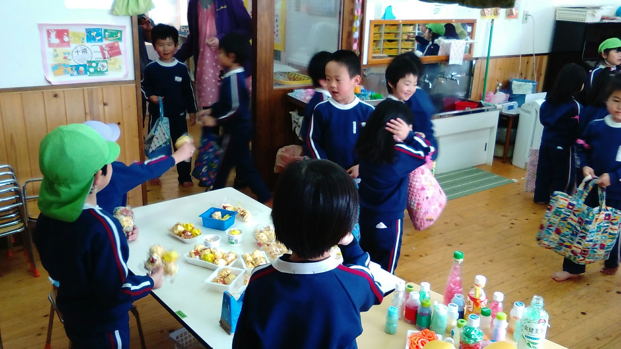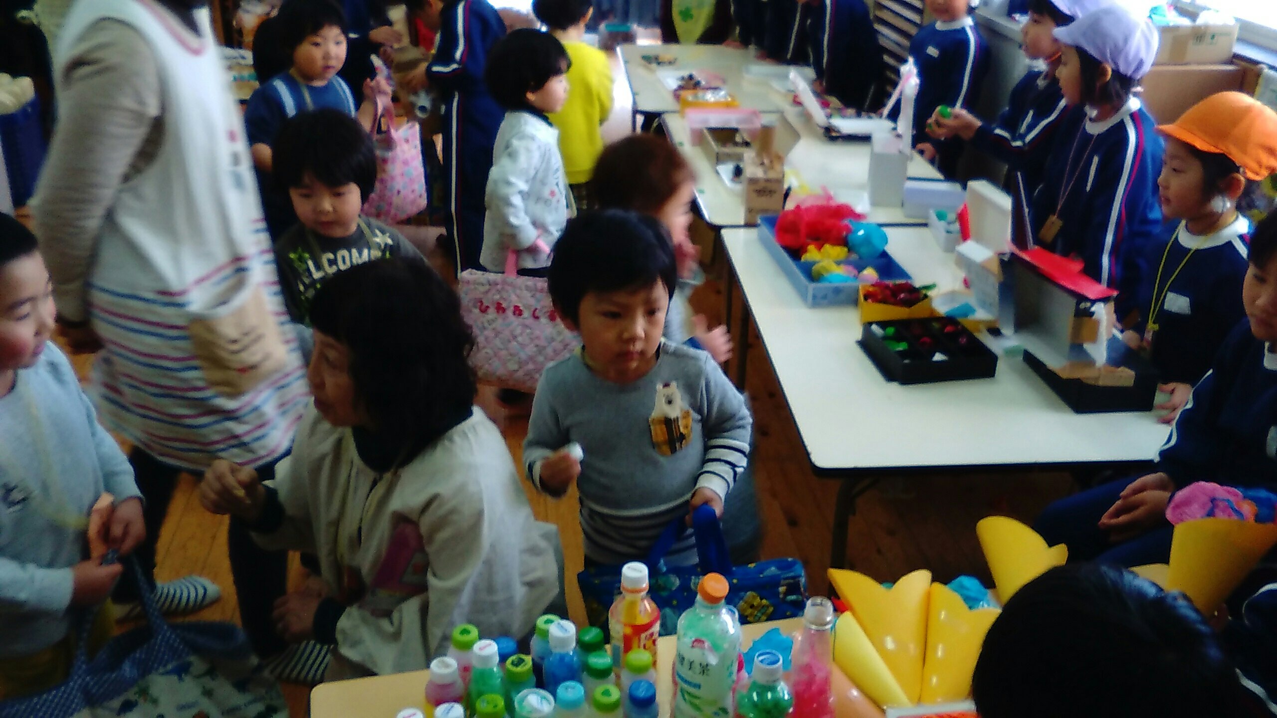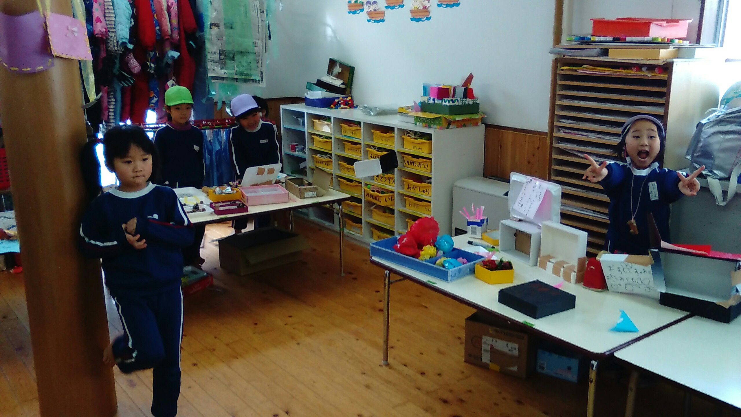 おみせやさんになったゆり組もすみれ組もたんぽぽ組も、元気よく