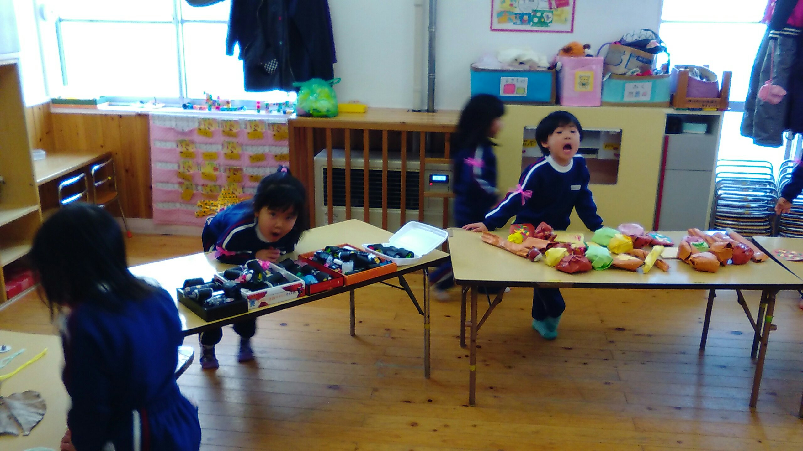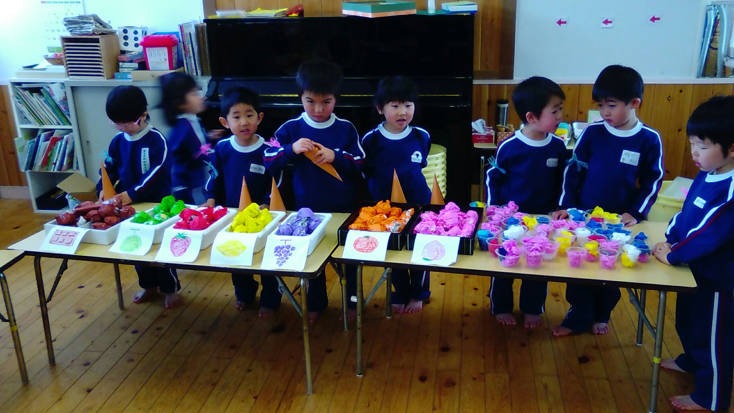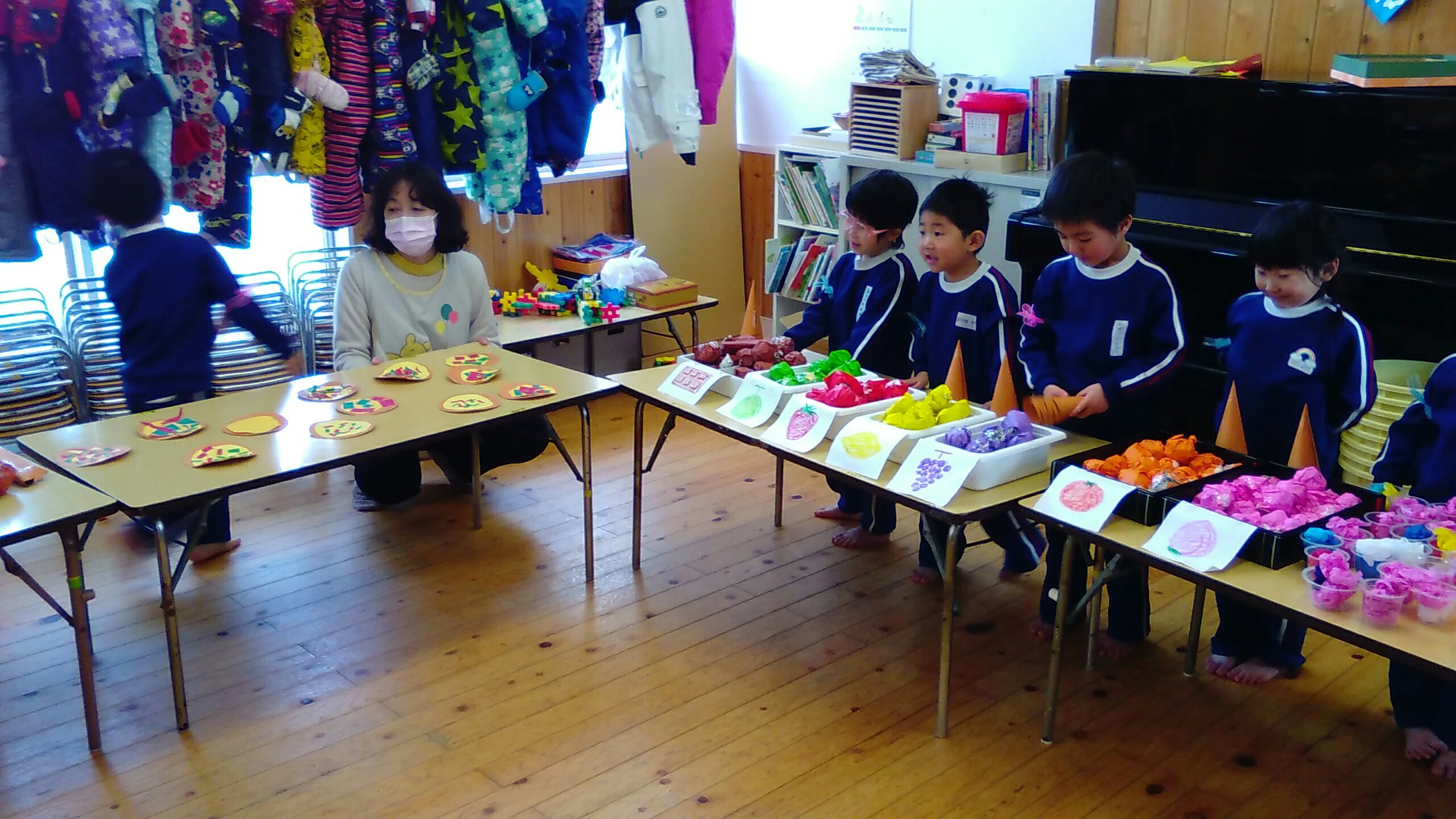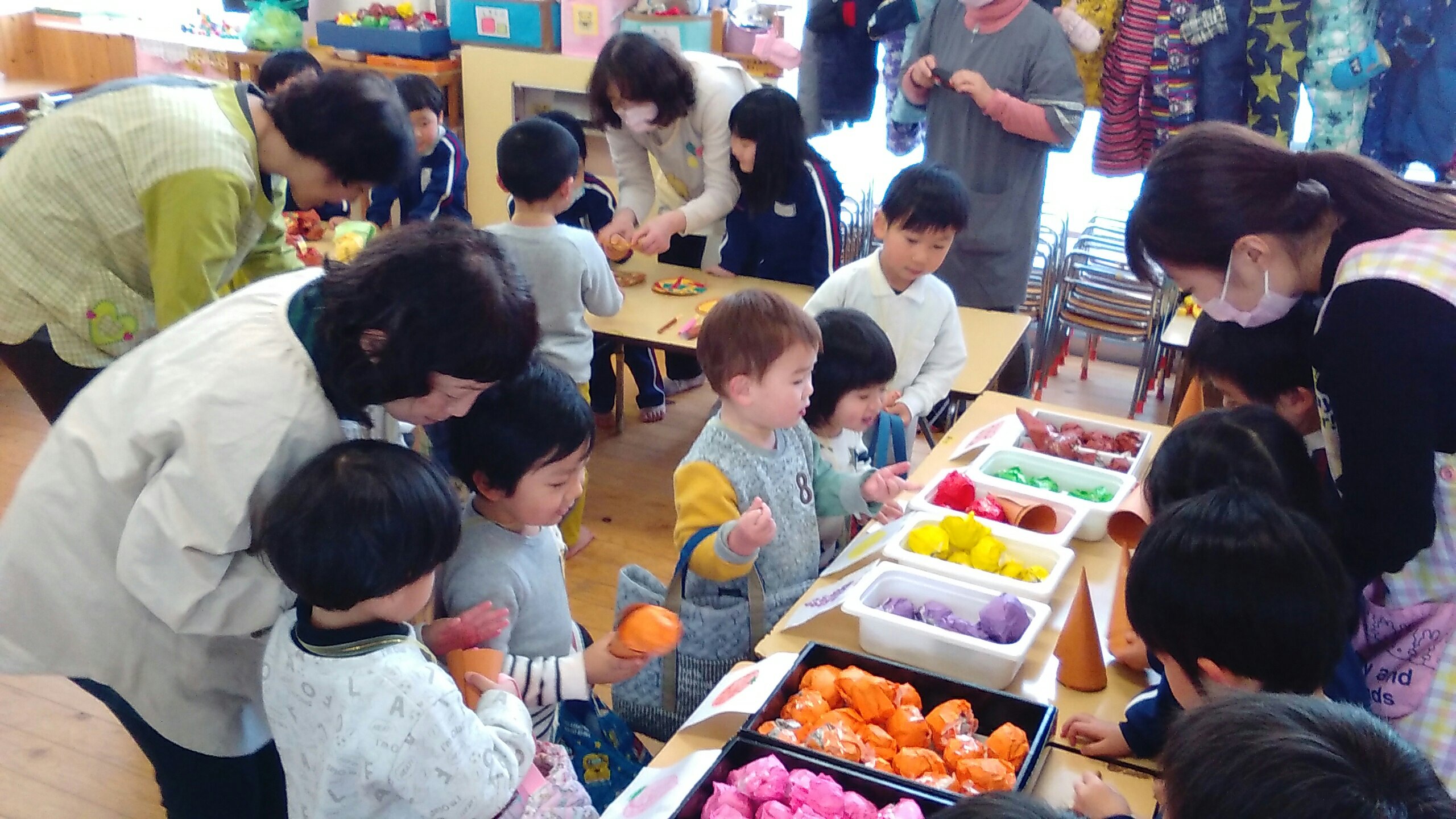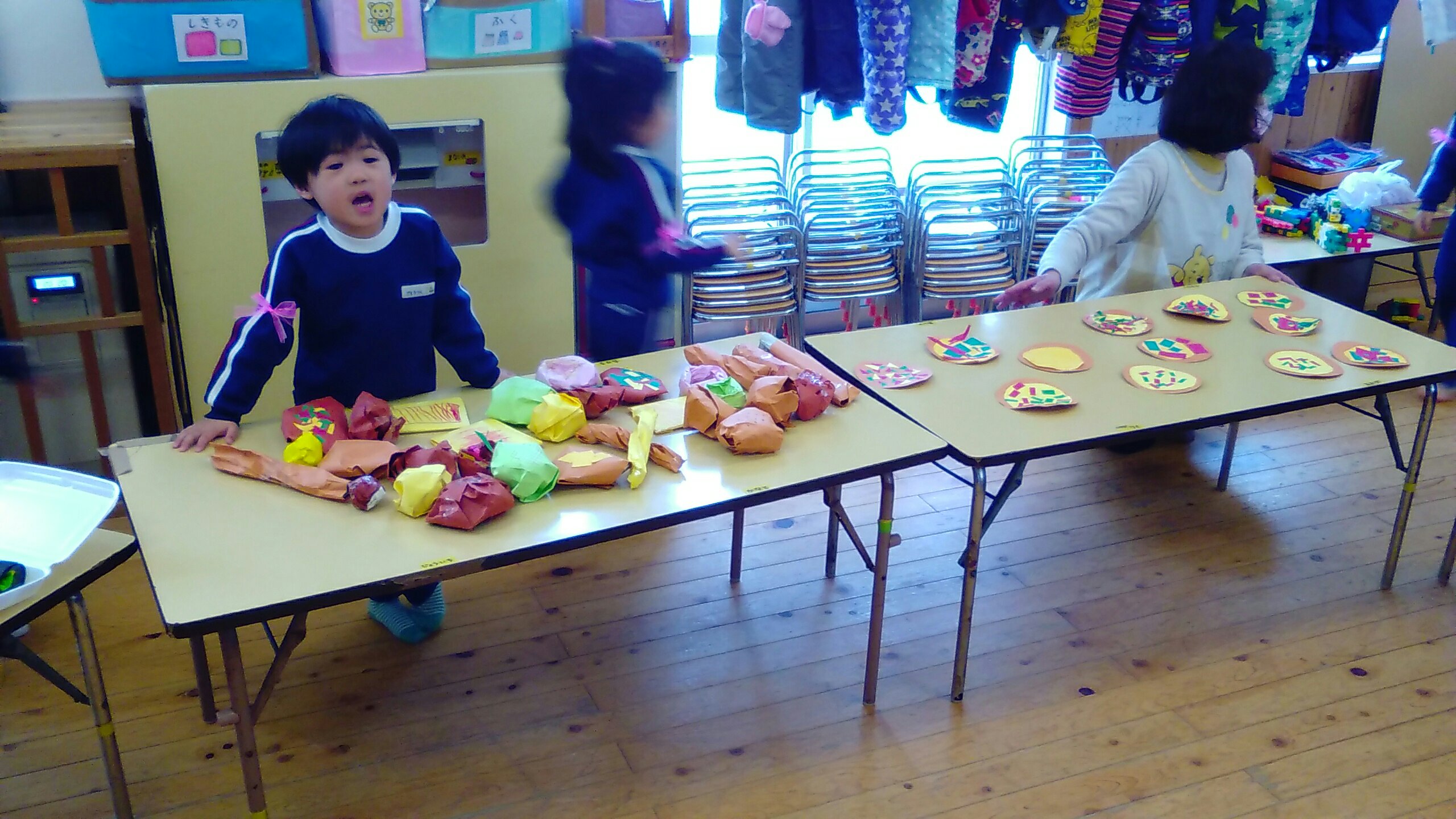 おみせやさんになったゆり組もすみれ組もたんぽぽ組も、元気よく