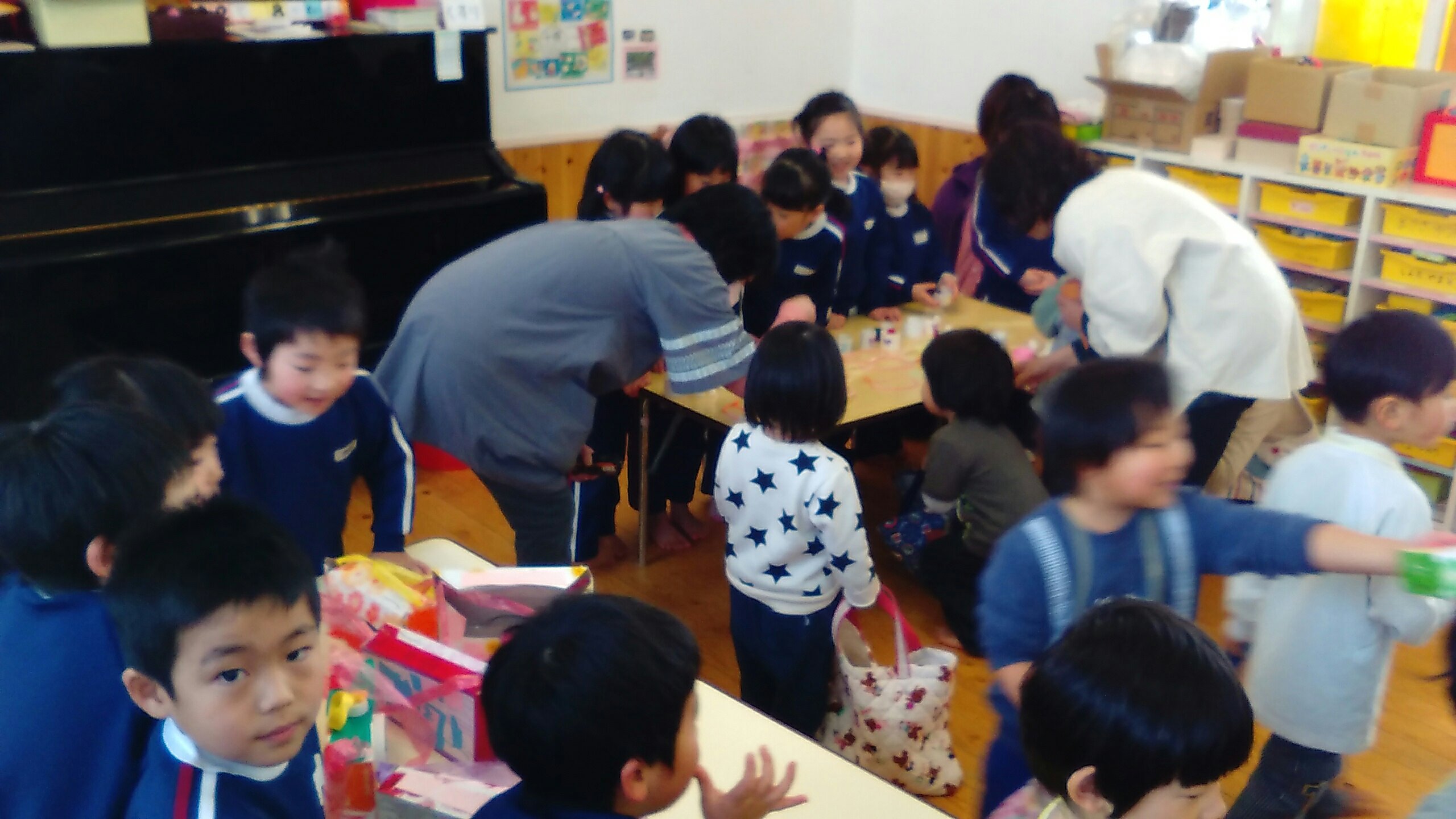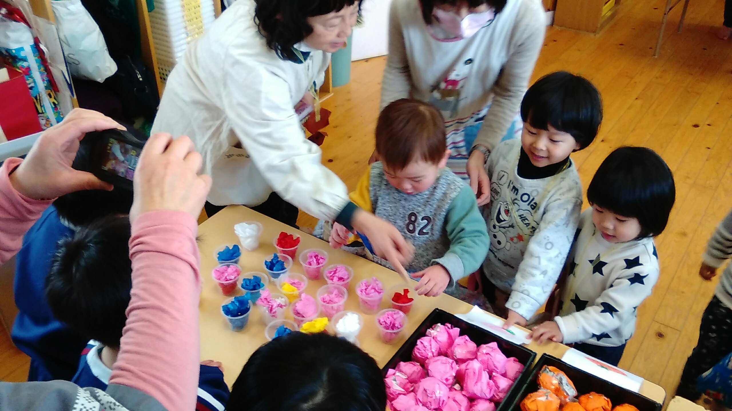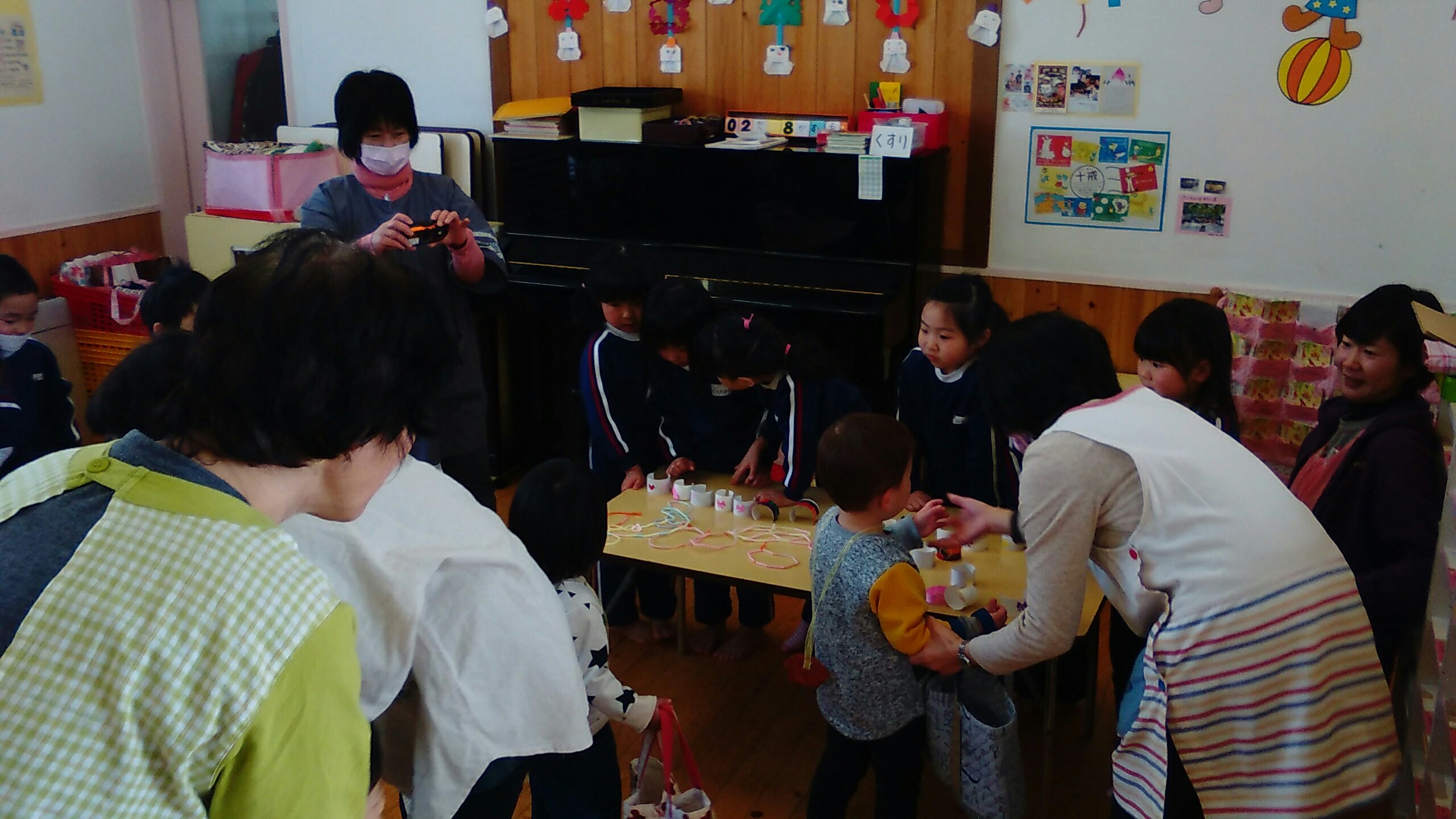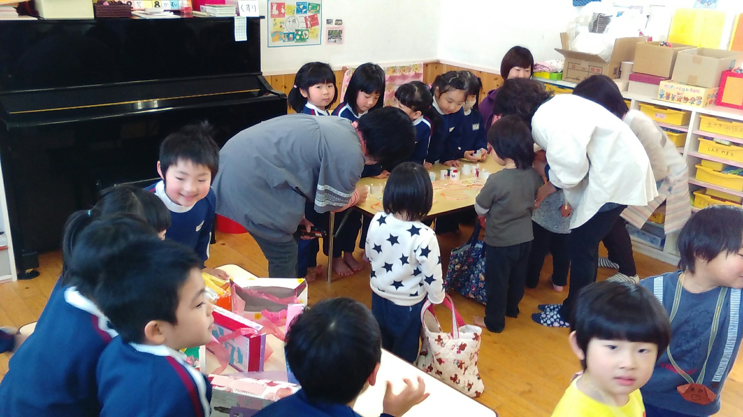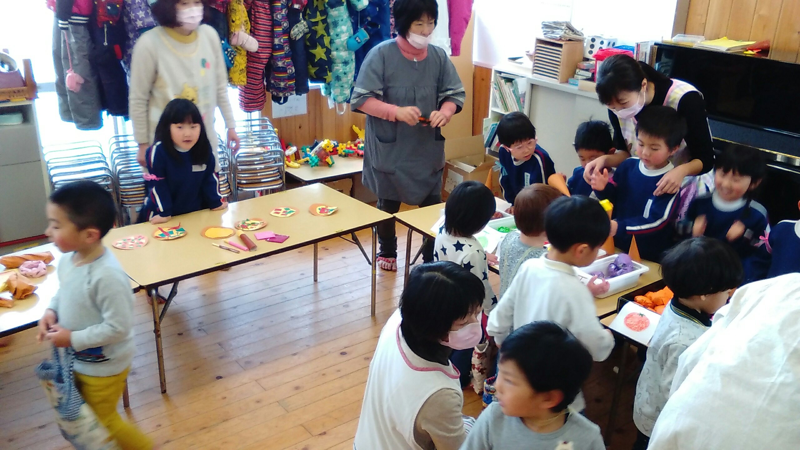 4月から入園する新しいお友だちをお迎えしての「新入園児歓迎会」の中でおみせやさんごっこをする予定でしたが、風邪などが流行っているため、在園しているもも組・二歳児さんと以上児クラスで楽しむことになりました。