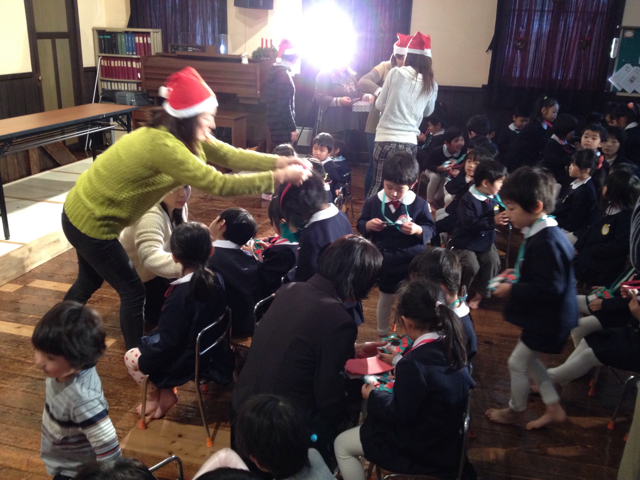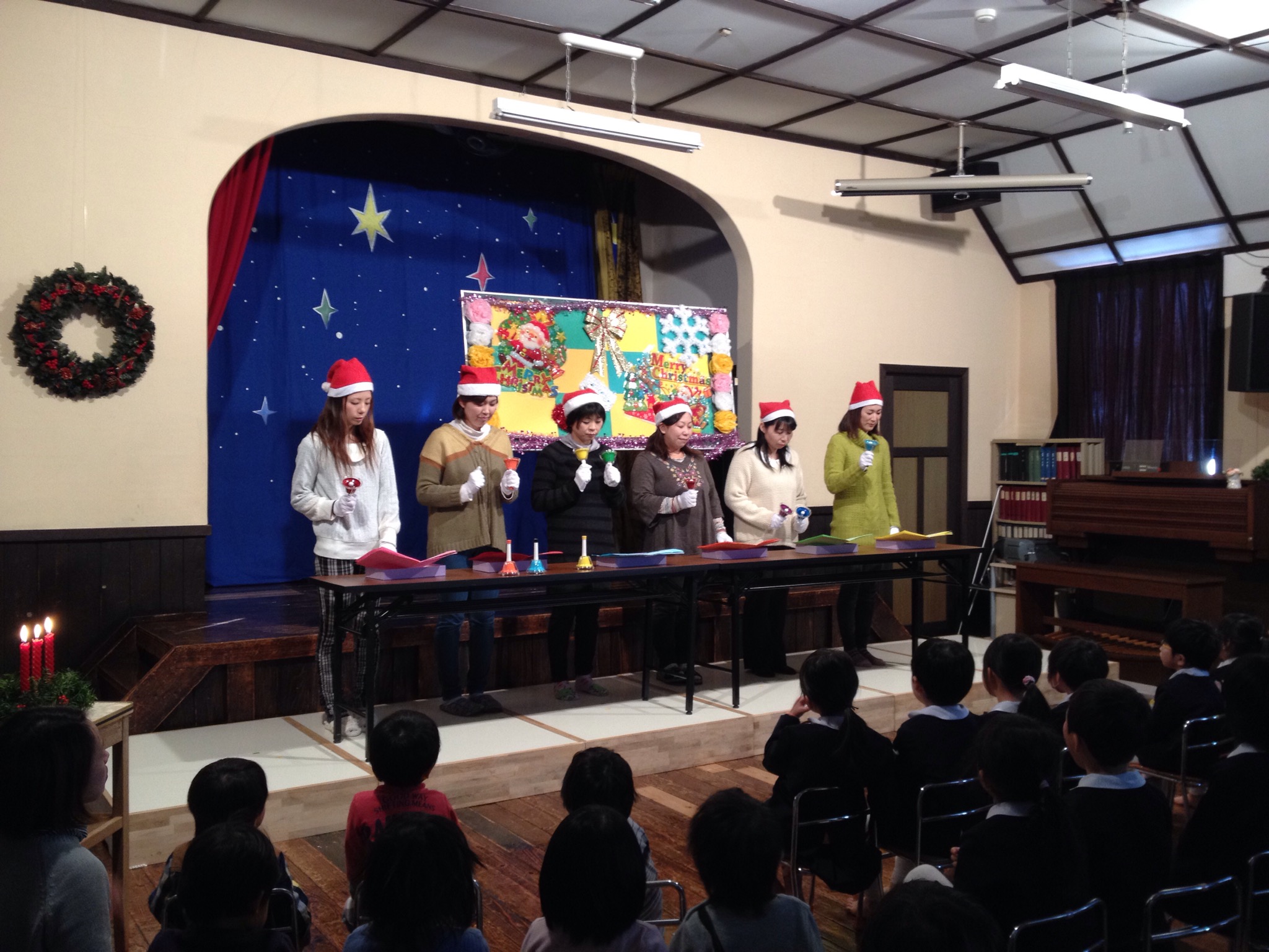 クリスマス礼拝の中で、保護者会のお母さんたちの出し物も披露されました♫ 子どもたちのために!!と、忙しい中、練習を重ねてくださいました。 綺麗なハンドベルの音色に、子どもたちも大喜び! 知ってる曲が流れると自然に、子どもたちも歌い出し、お母さんたちは更に緊張したようです(^^)
