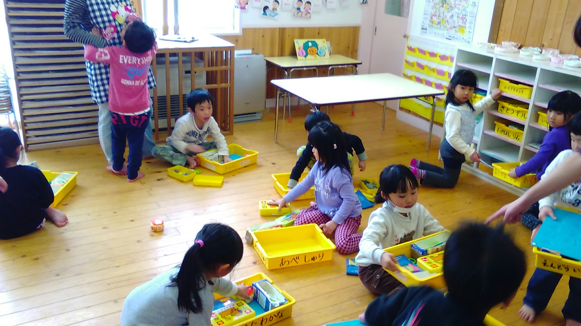今日は、すみれくみさん、たんぽぽくみさんが修了に向けて、自分のお道具箱を片付けたり、まとめをしたりしました。