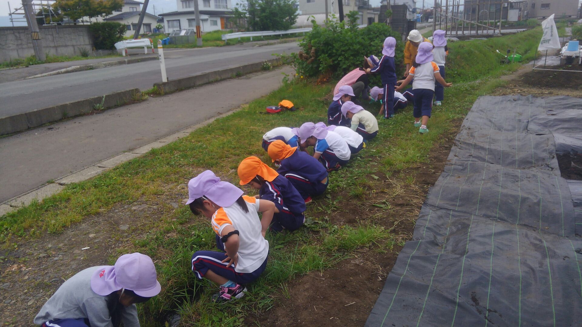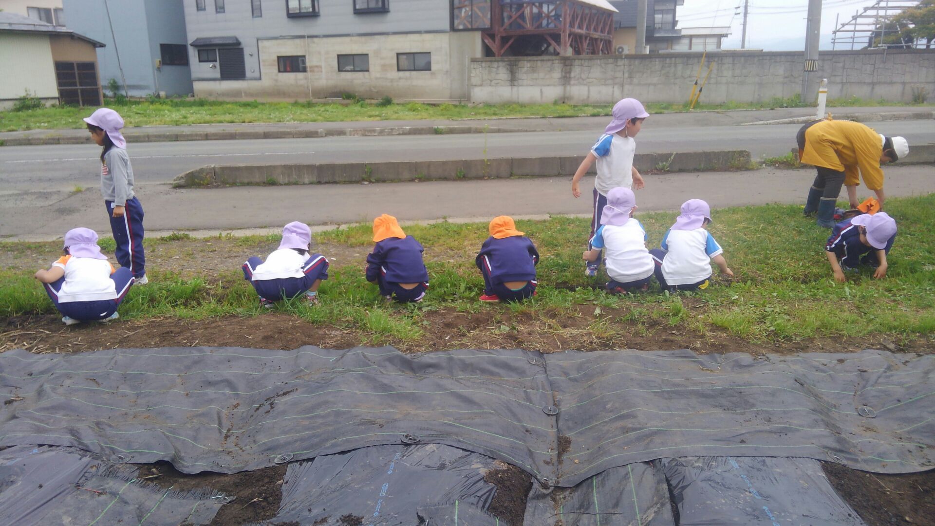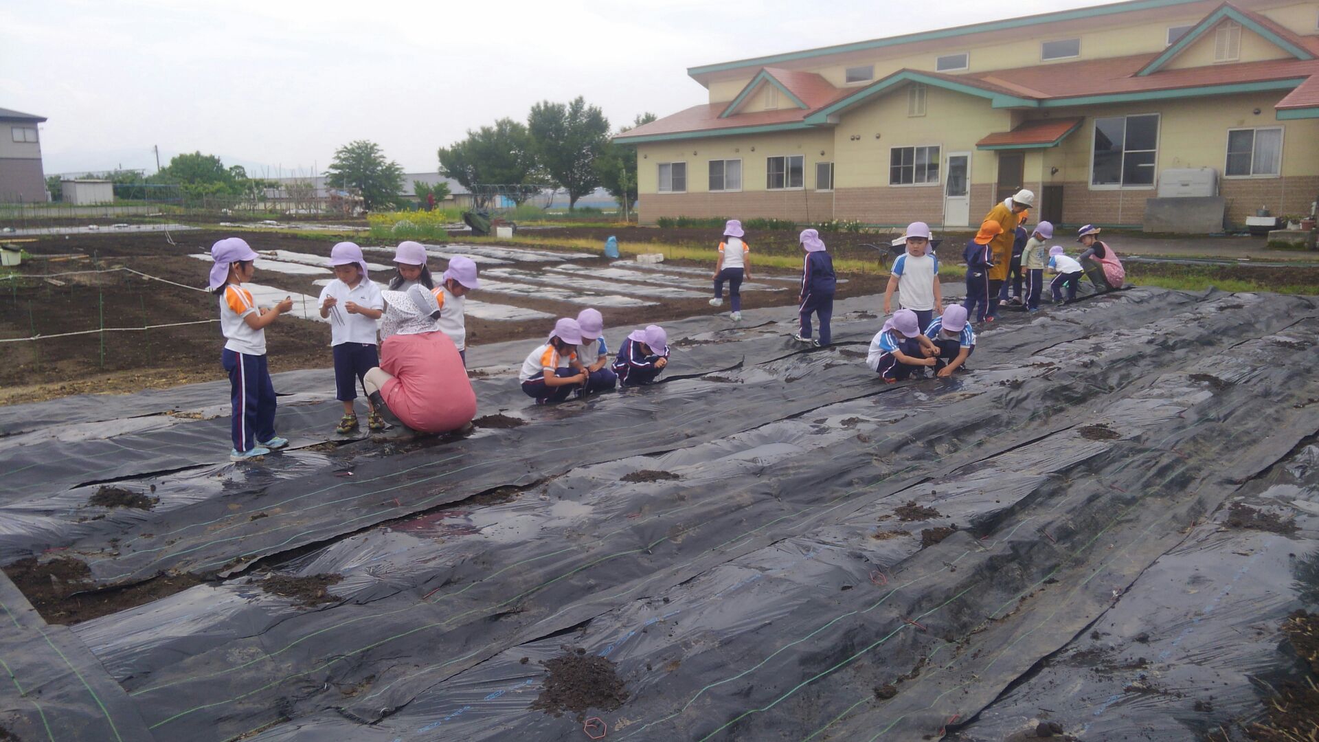前日の夕方、先生たちが畝作りをした間に、「除草シート」を張るお手伝いをしました。