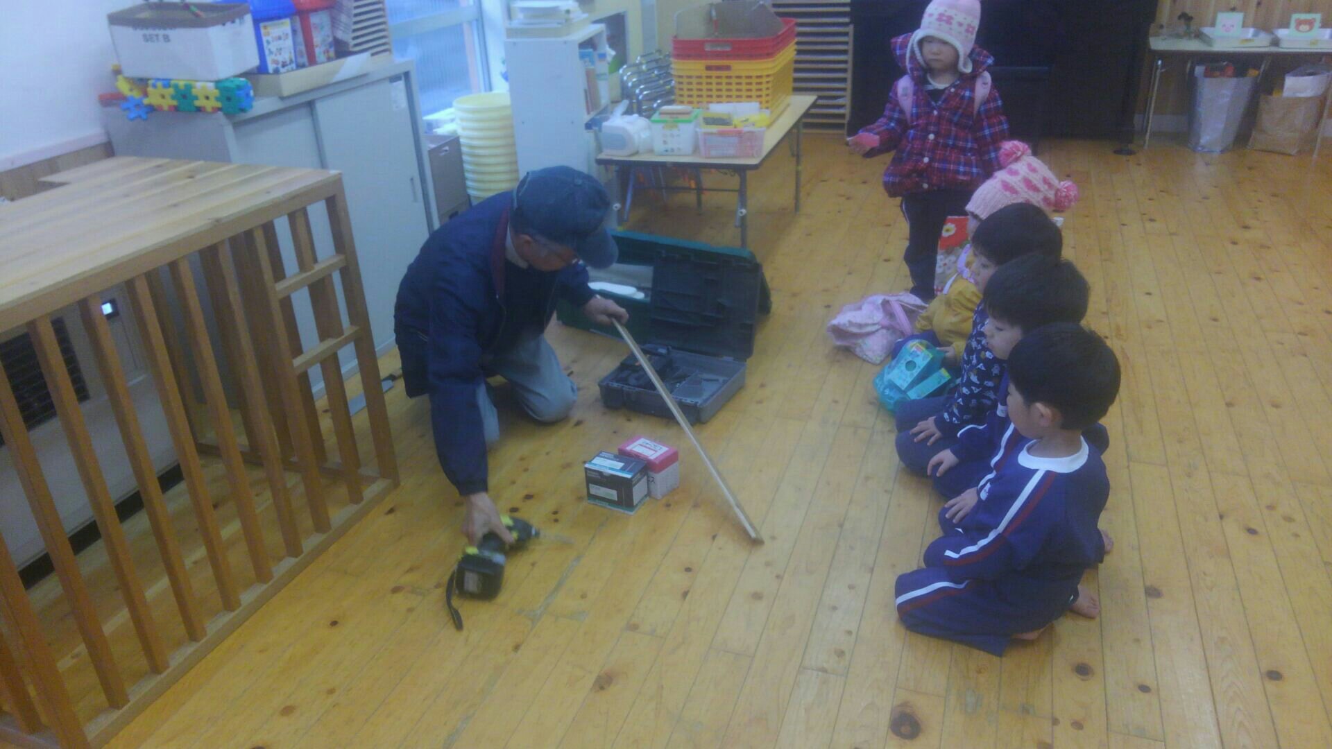 クラスの先生が「さぁ、帰りの集まりしようかな~。絵本読むよ~。」と何度伝えても、その声は子どもたちの耳には全く届かず、建具屋さんの作業から目が離れません。
