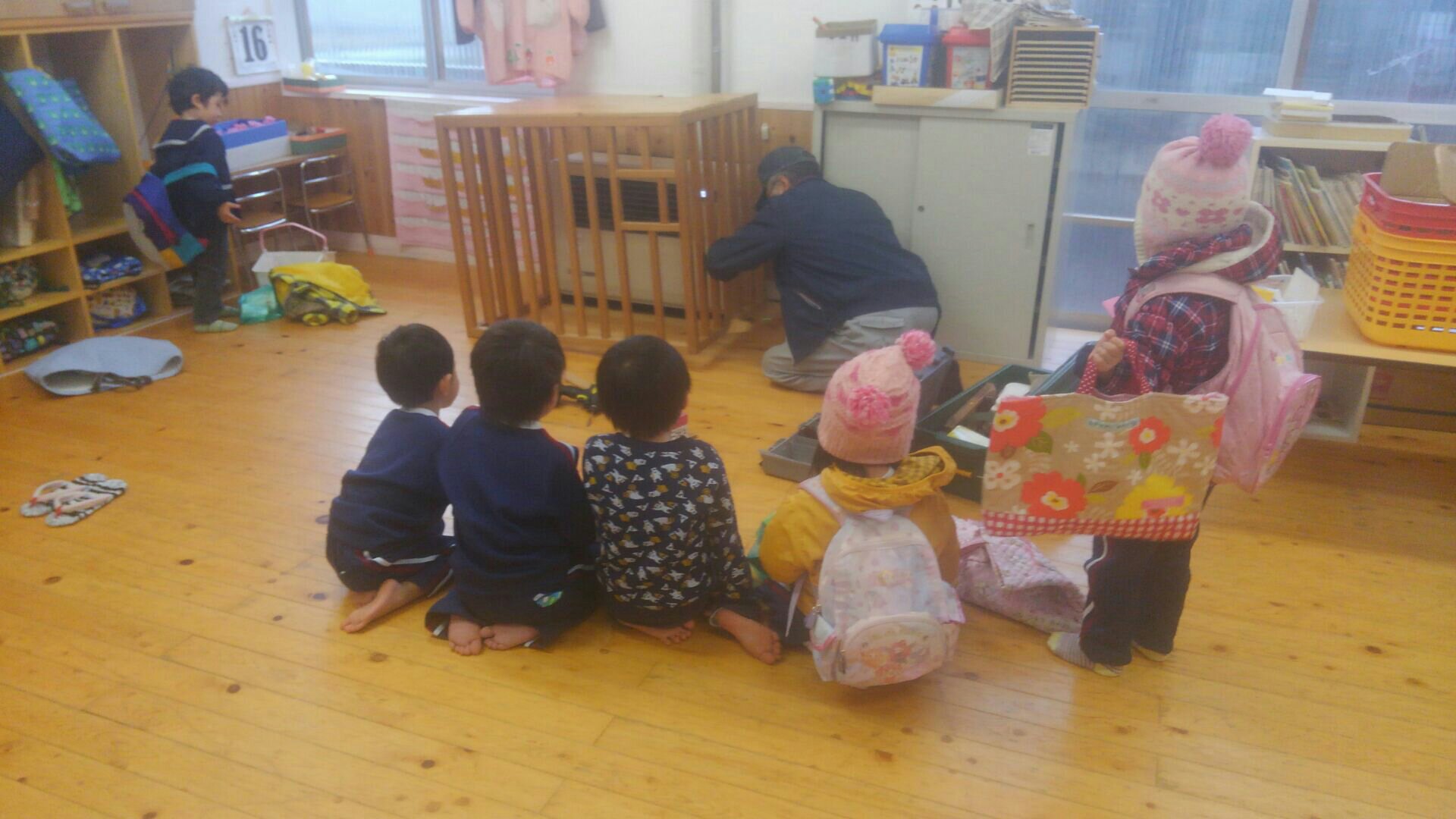 先日、すみれ組とたんぽぽ組のストーブが新調され、それに合うように木の柵も建具屋さんに直していただきました。