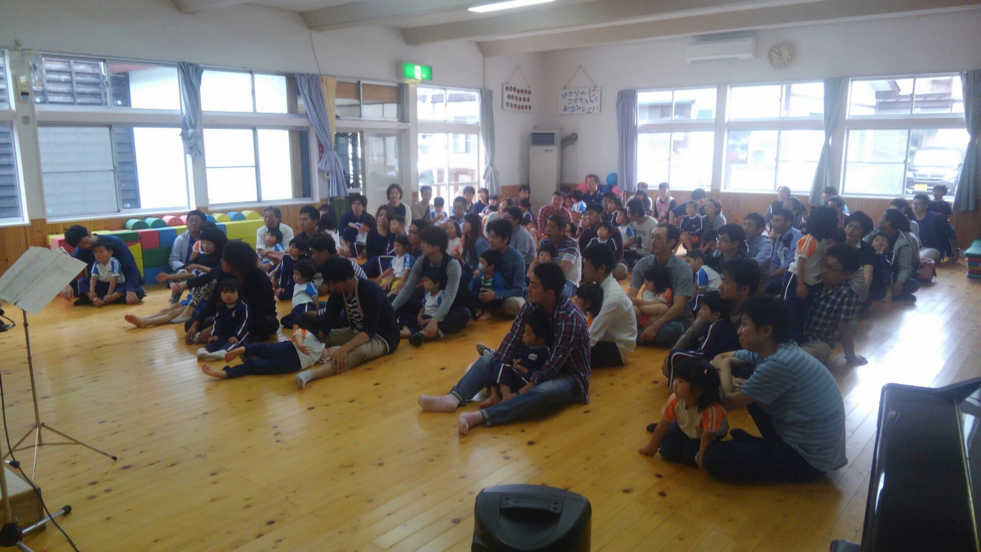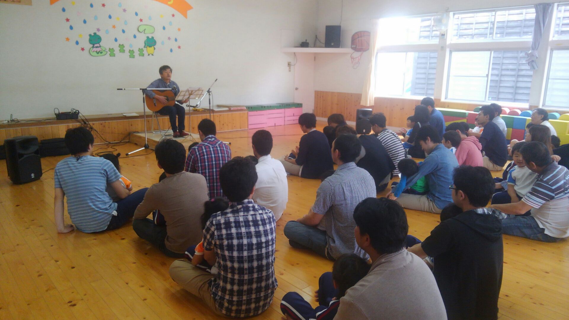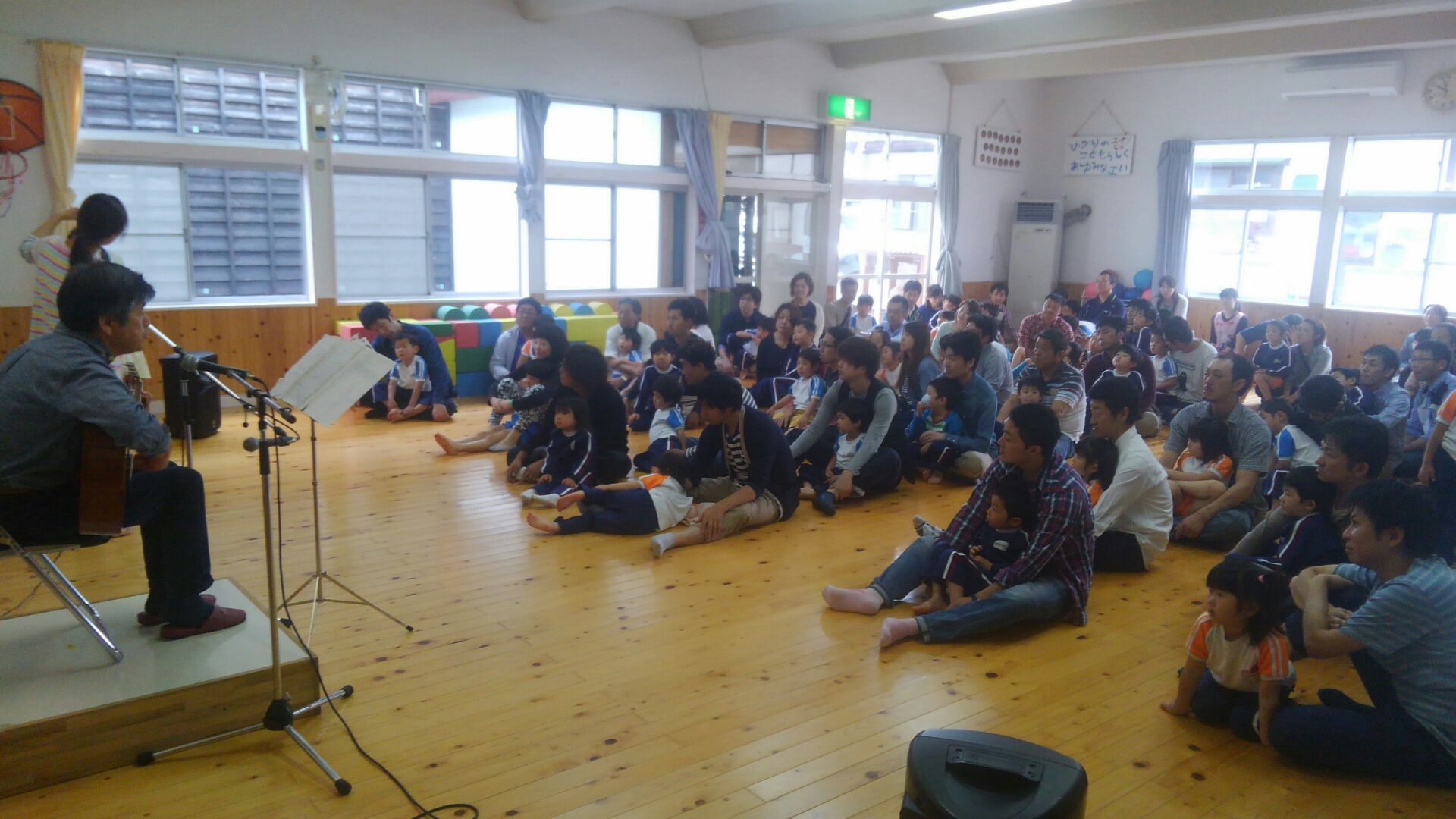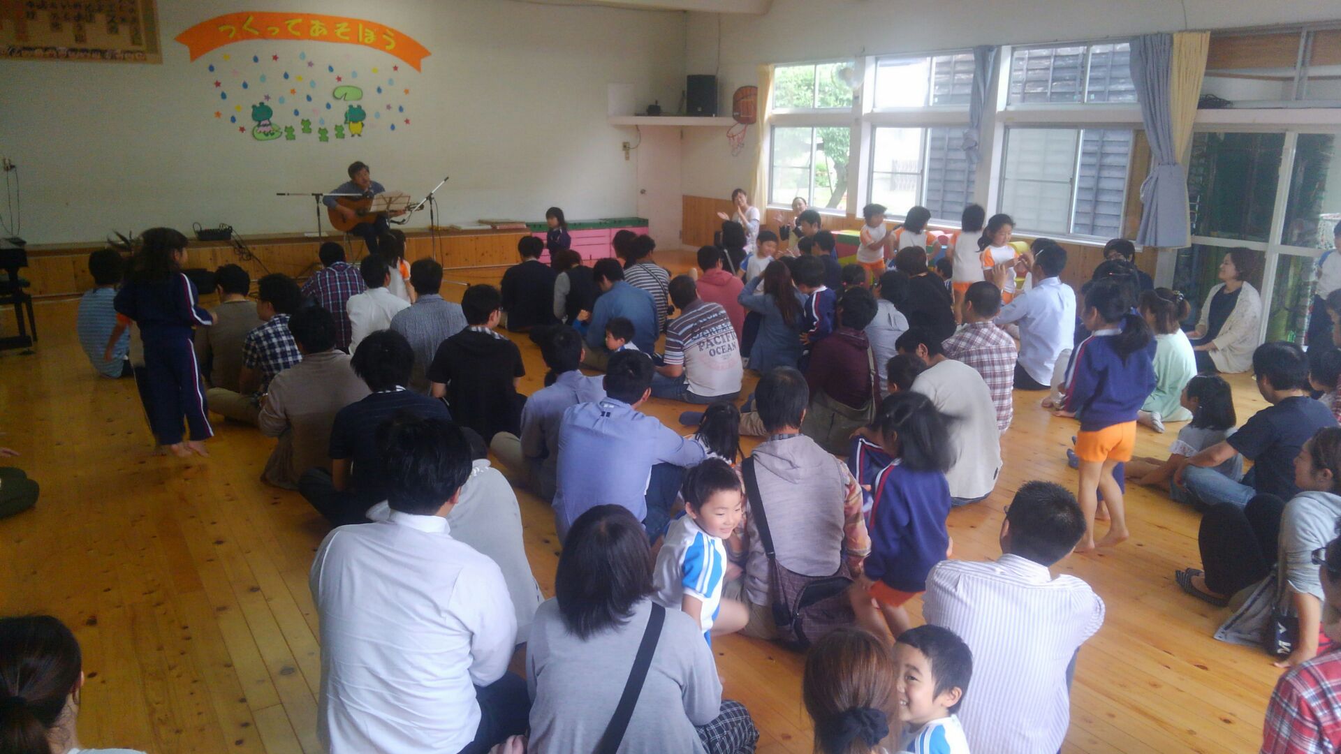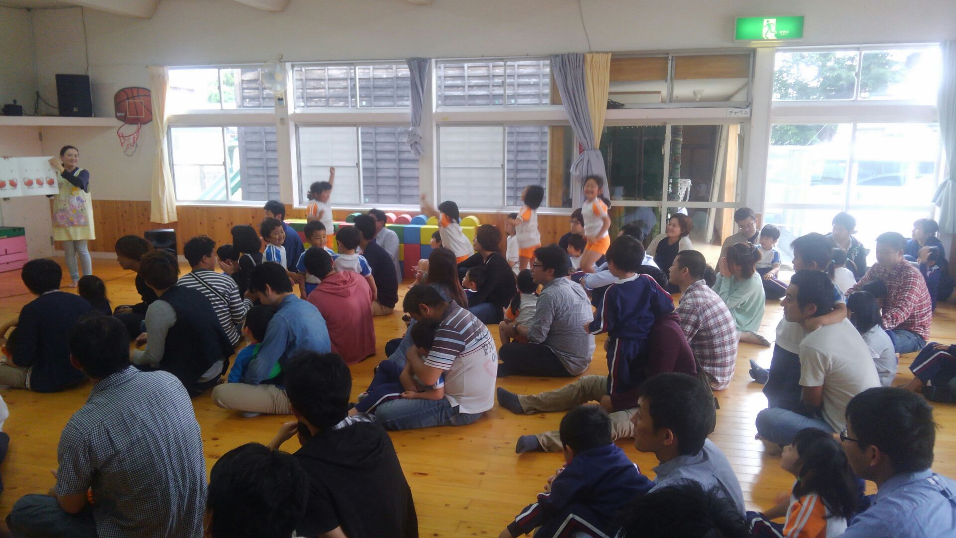 前半は岩手から来てくださった素敵な歌声の「うたのおじさん」がたくさんの楽しい歌を披露してくださり、歌うだけではなく、体を動かしたり、絵本を見たりしながら、お父さんお母さんと一緒に楽しい時間を過ごすことができました。