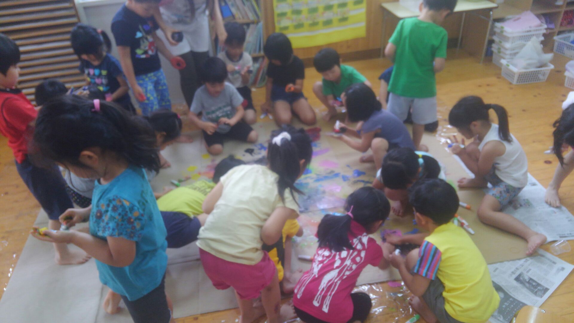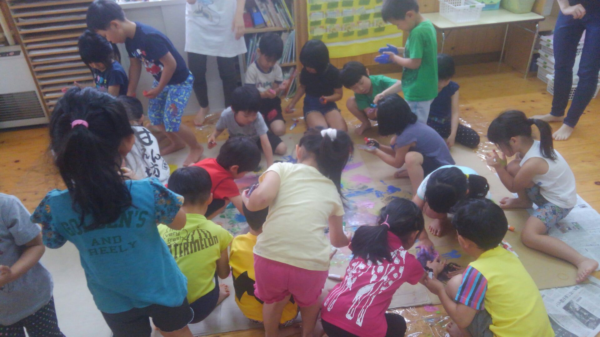 そして今日、刺激を受けた子どもたちは、筆ではなく手のひらを使って、絵の具の感触にわいわいキャーキャーと大興奮しながら、たくさんの色とりどりの絵の具を手のひらにつけて、みんなで大胆に絵を描く楽しさを味わいました。