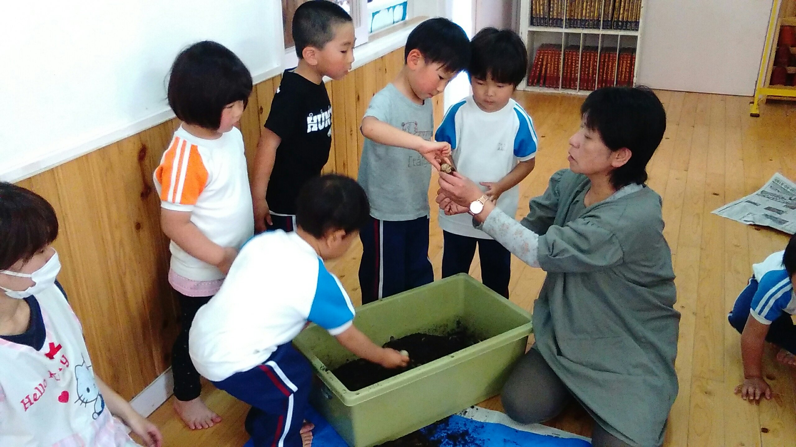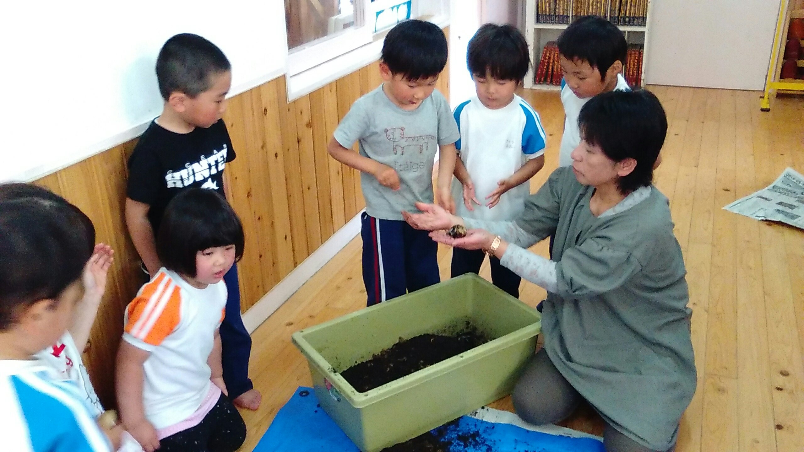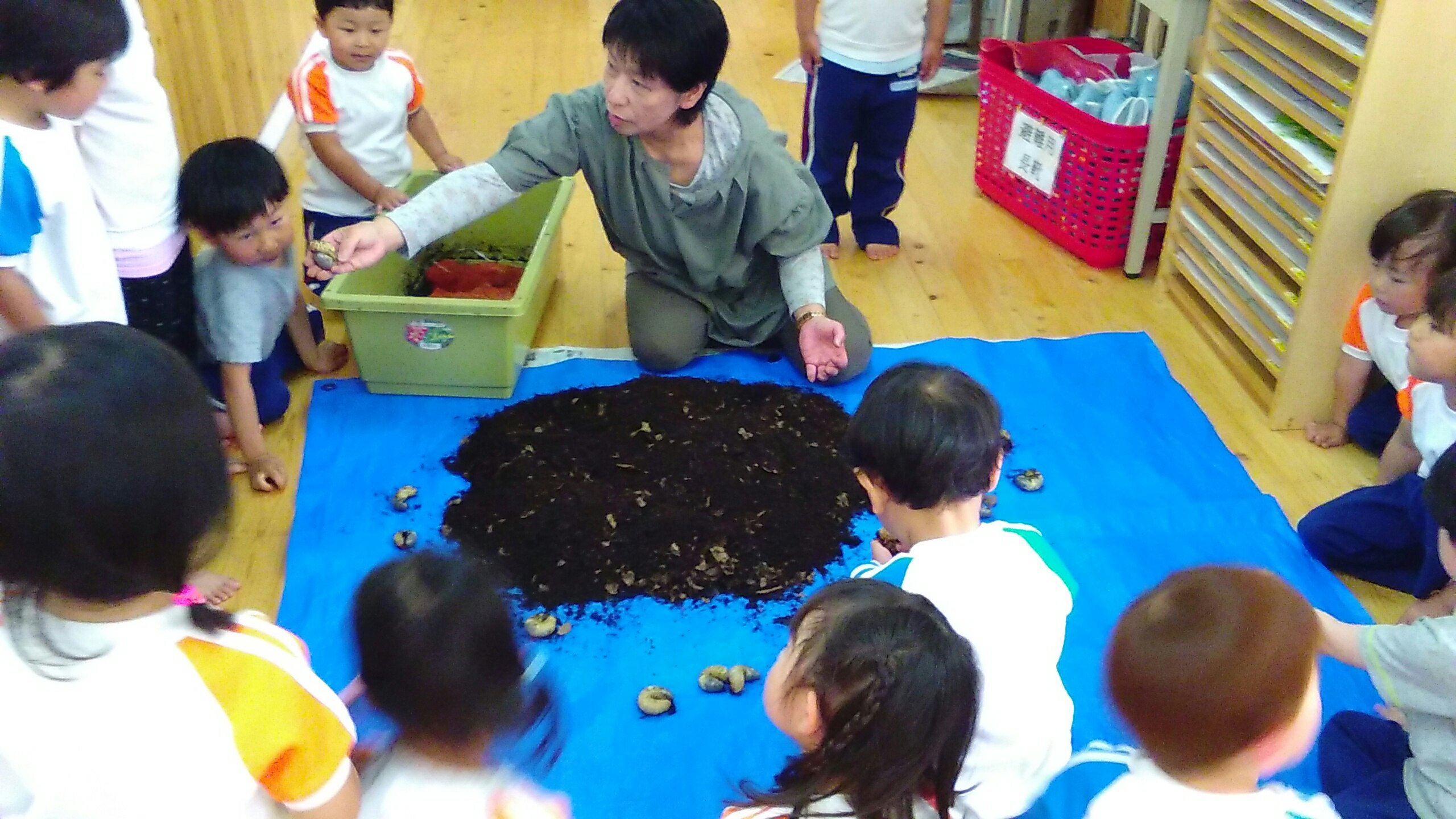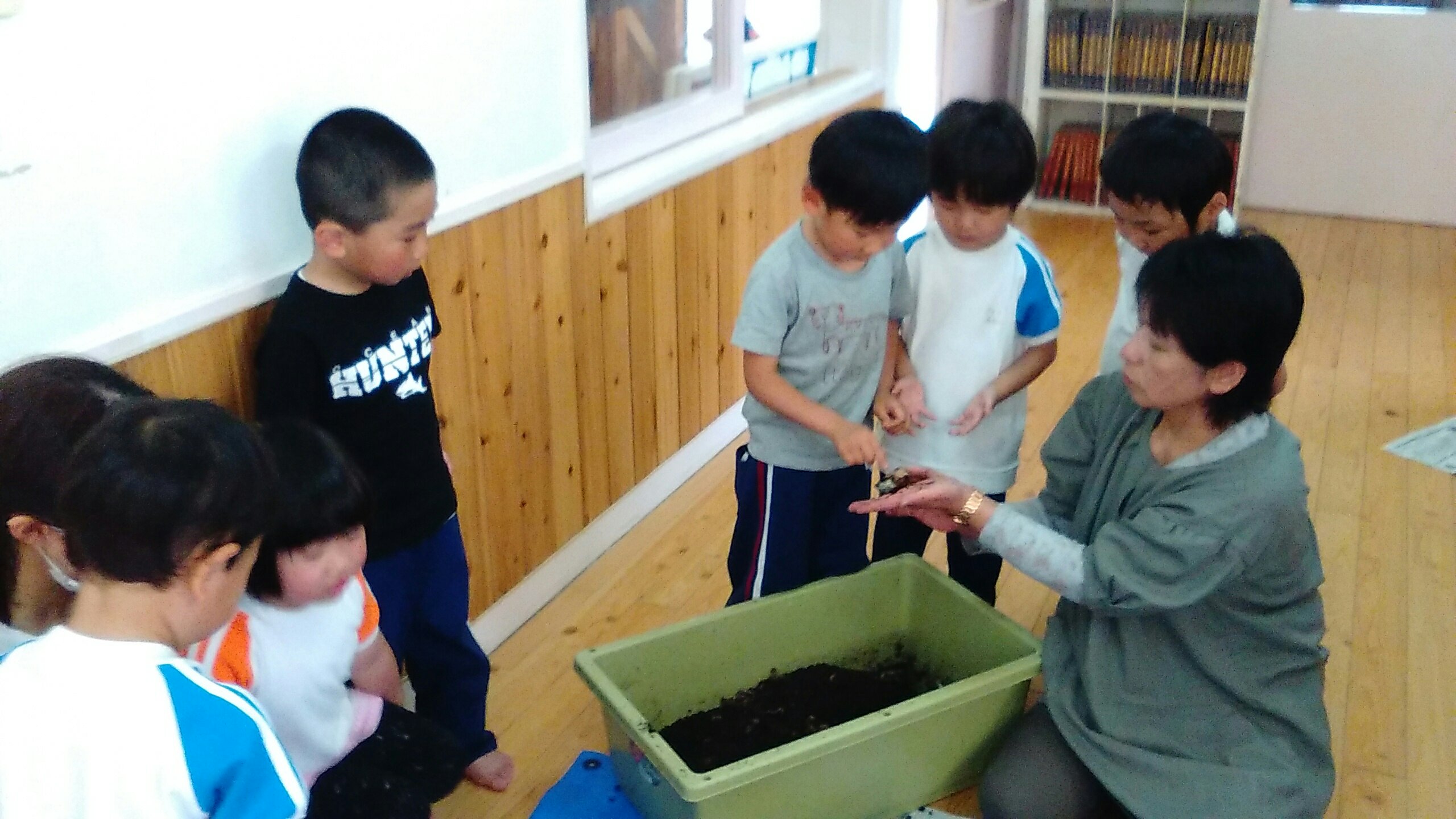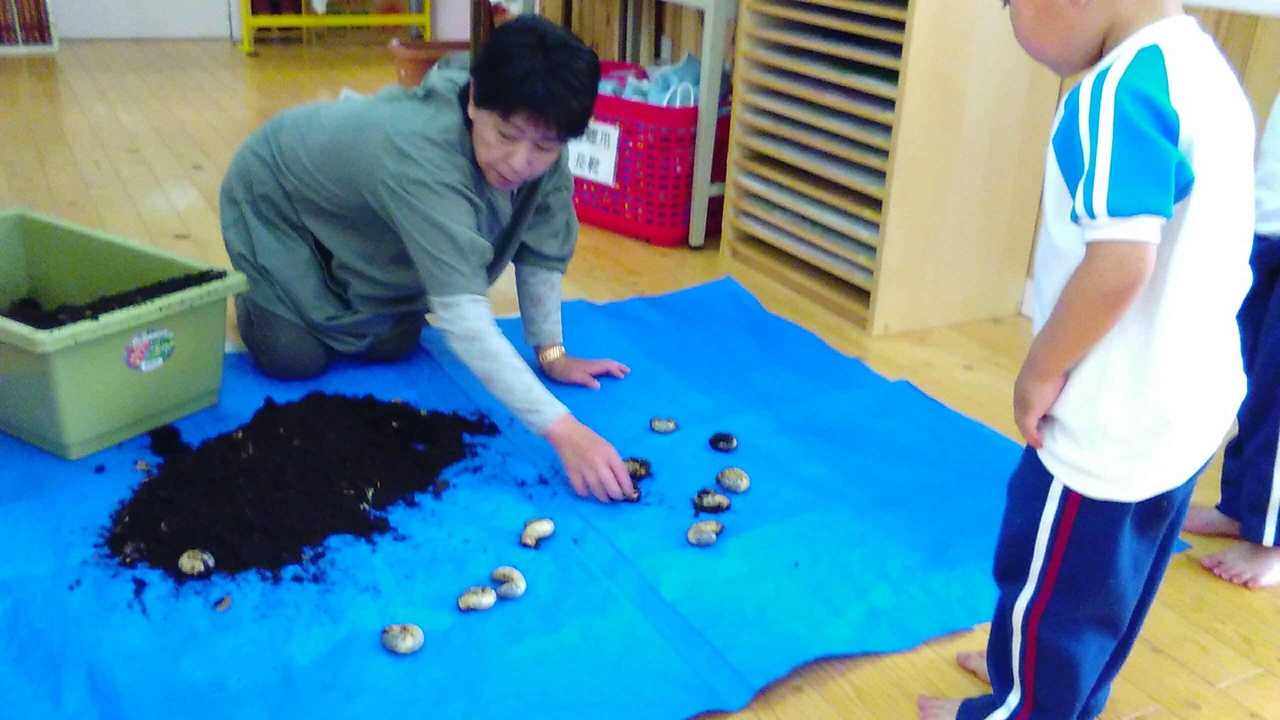 今年もこひつじにたくさんのカブトムシの幼虫がやってきました!!園長先生がたんぽぽ組の子どもたちにその幼虫を見せてくれました。