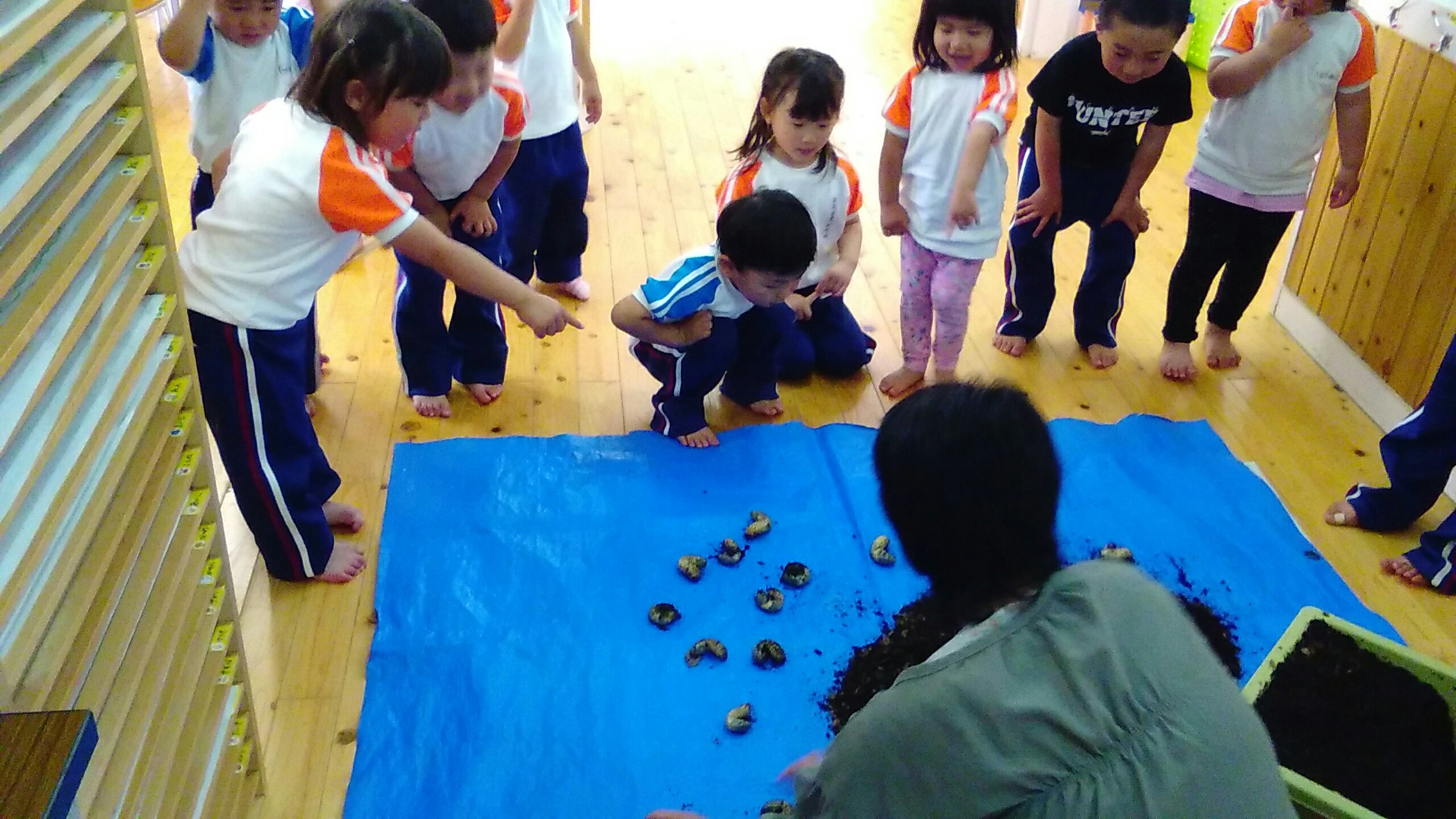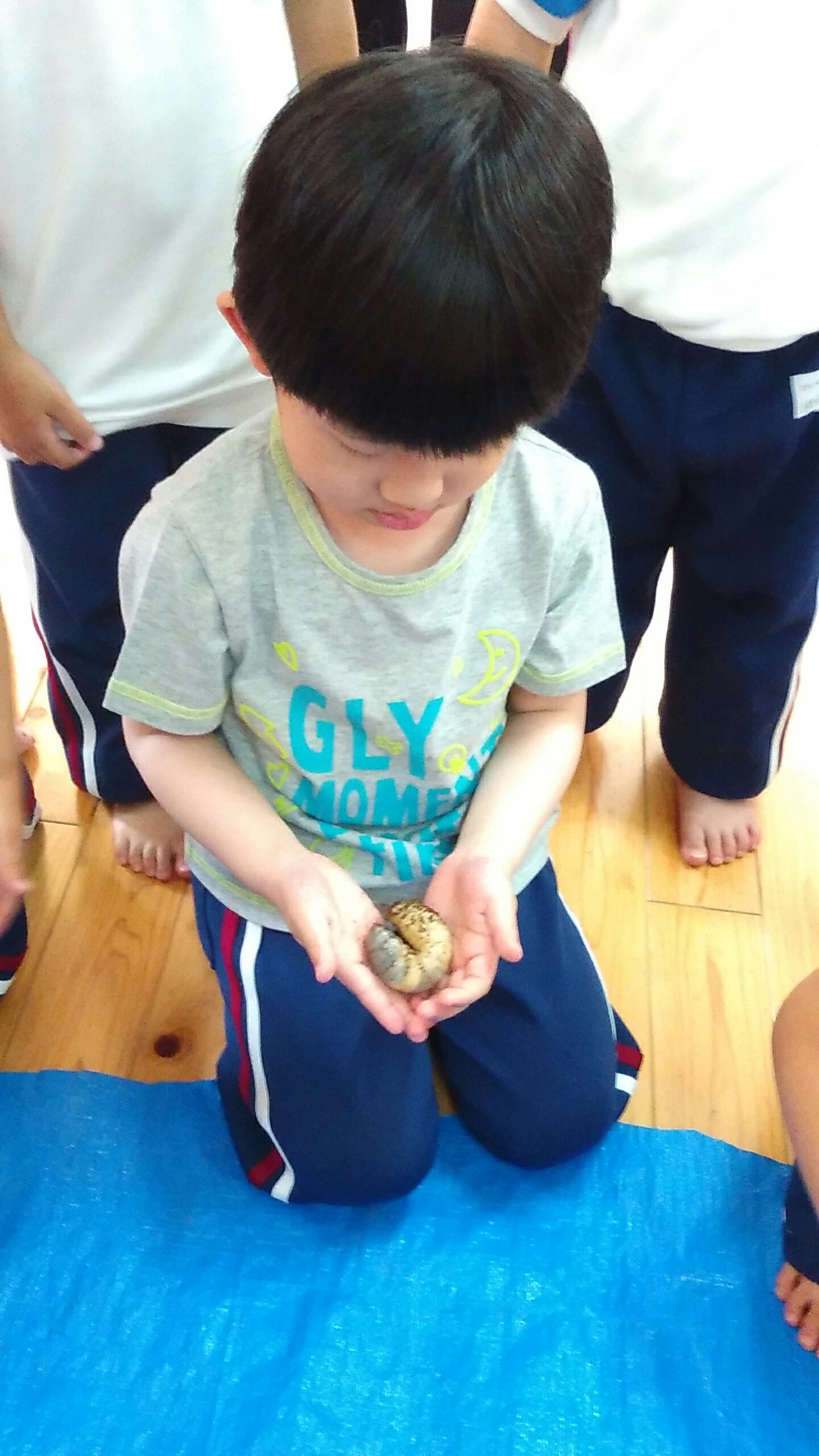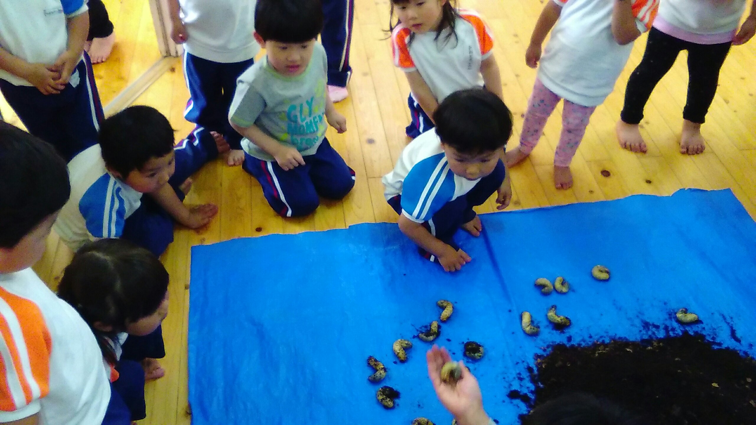 恐る恐る近づく子もいれば、積極的に触る子もいて、カブトムシの幼虫とのふれあいの時間を思い思いに楽しむことができました♪