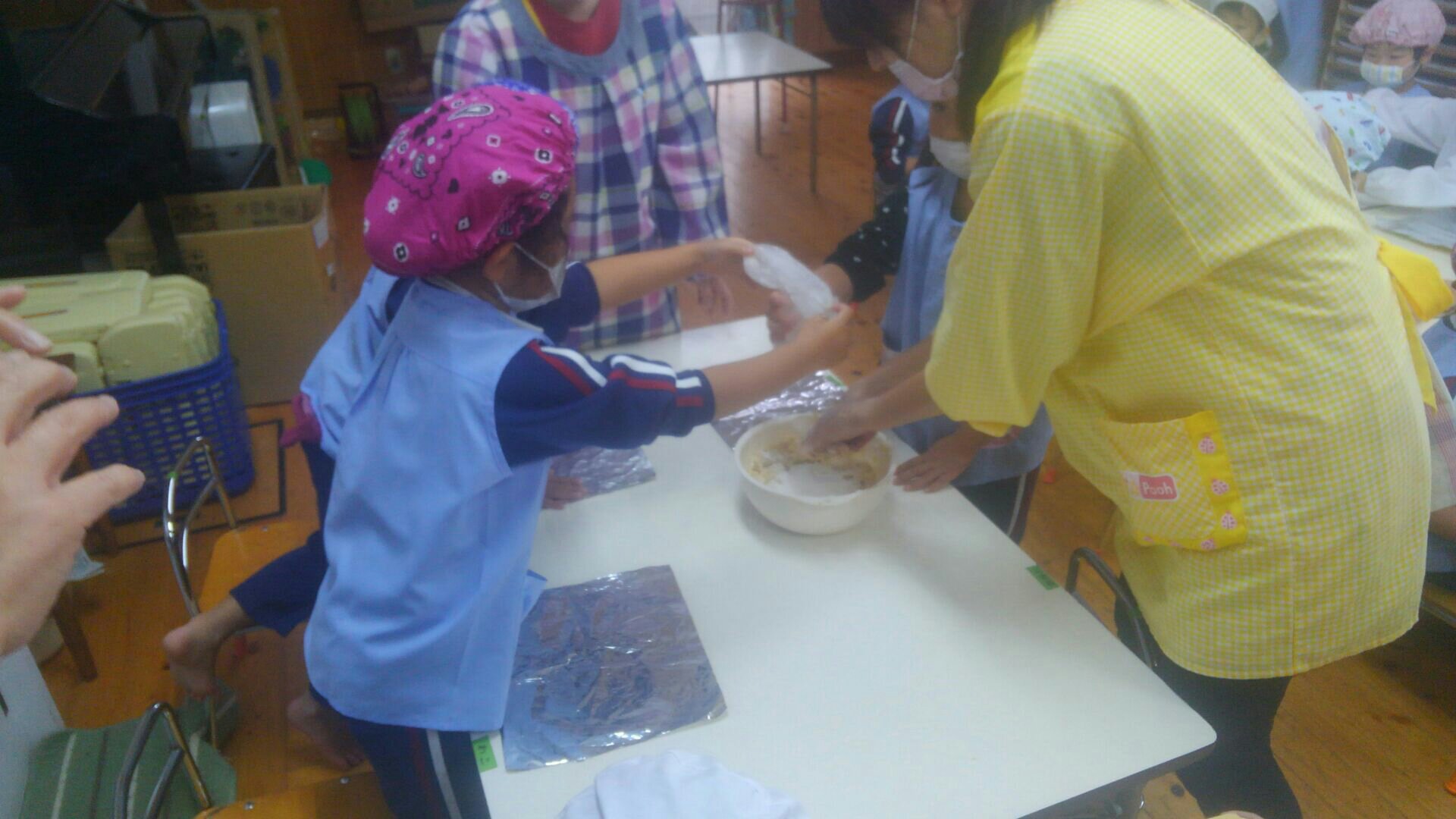 材料を混ぜ合わせ、一人一人に生地が配られ、自分の好きな形を作っていきます♪