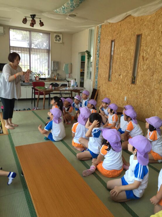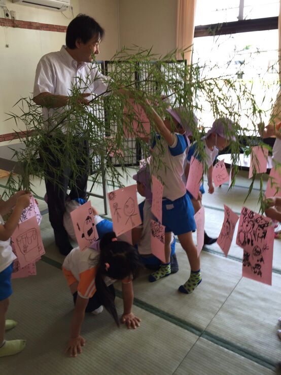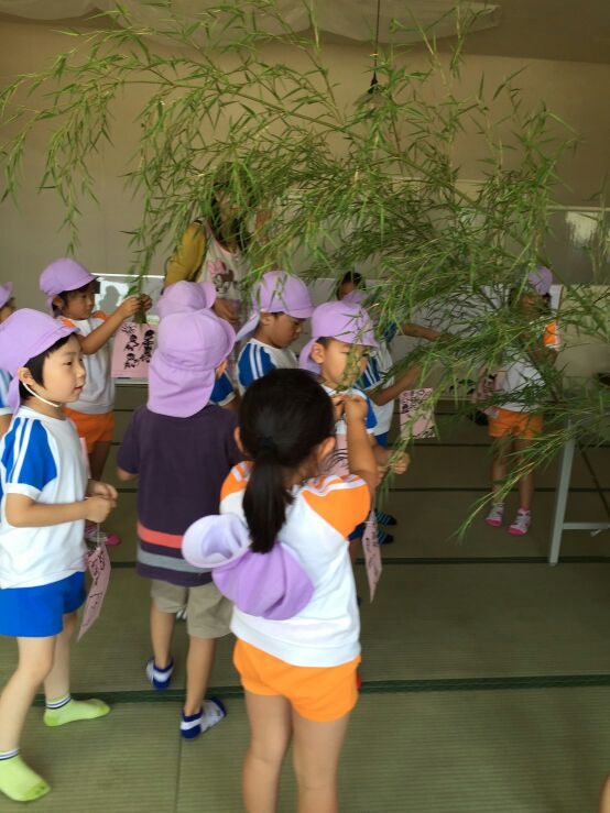そして、畑を借りている(株)和光さんの「輪っこ」に寄ってきました。事前に園で描いた絵や神様へのお願いを書いた短冊を「輪っこ」で用意してくださっていた笹に飾ってきました。