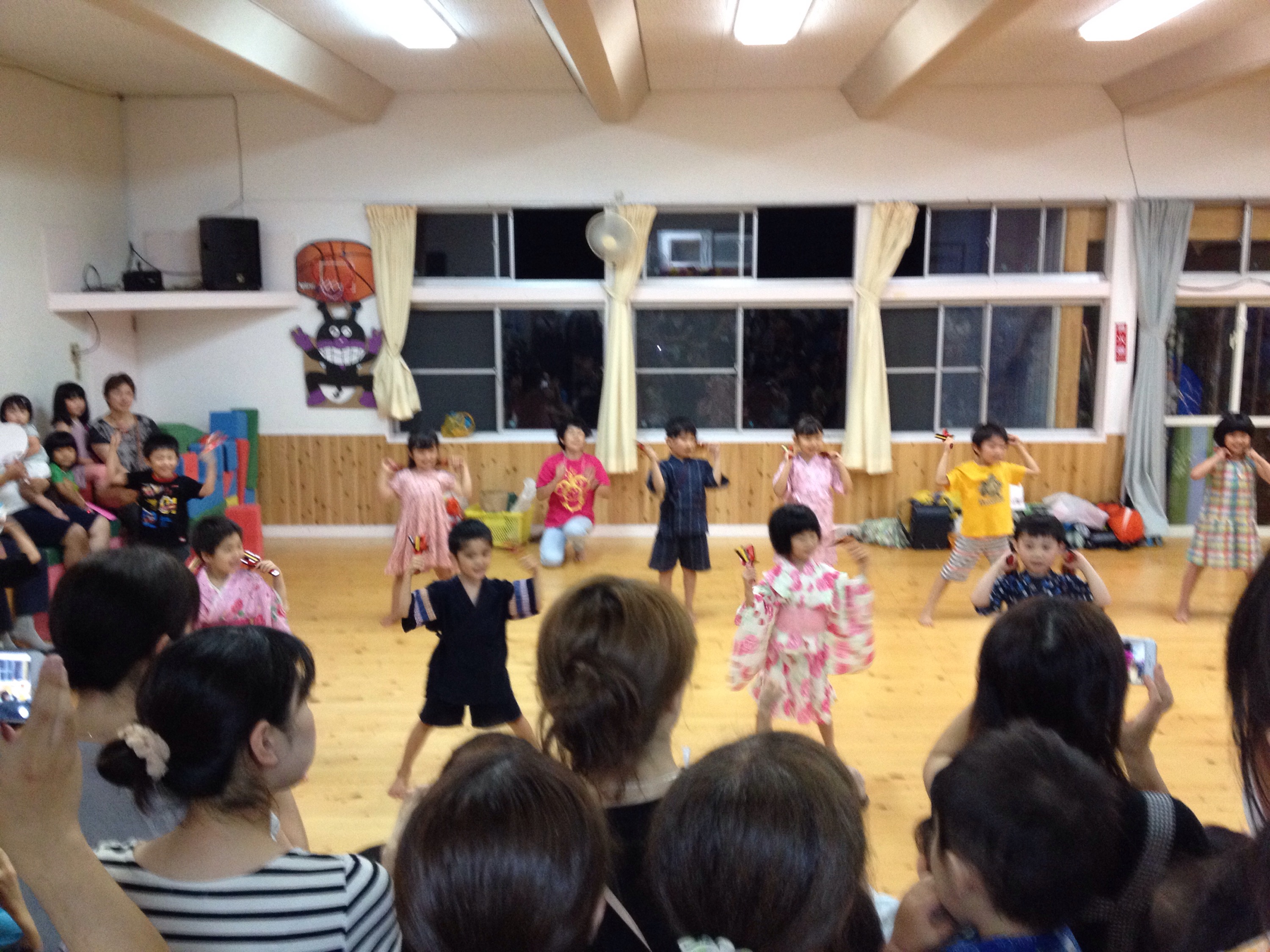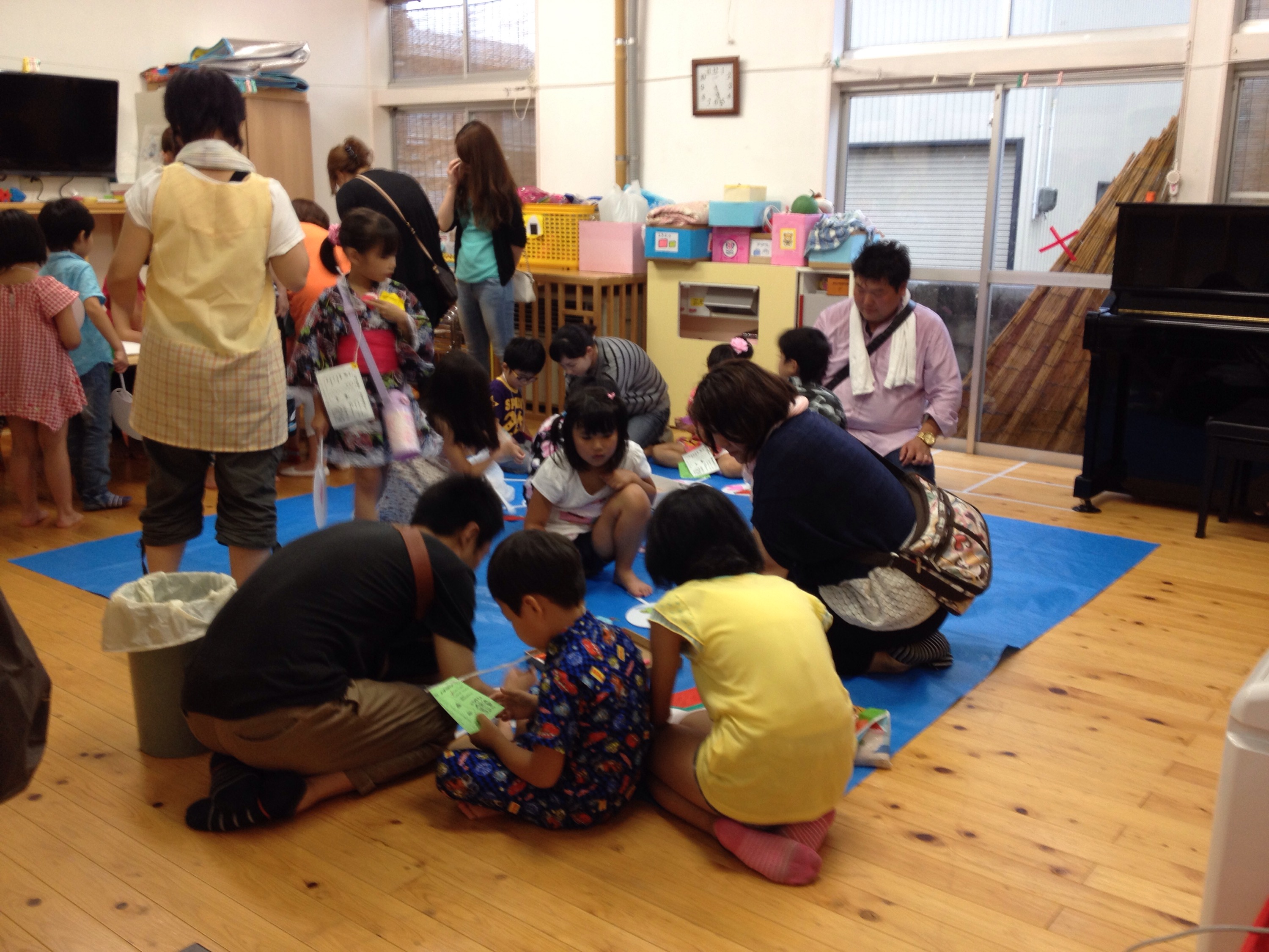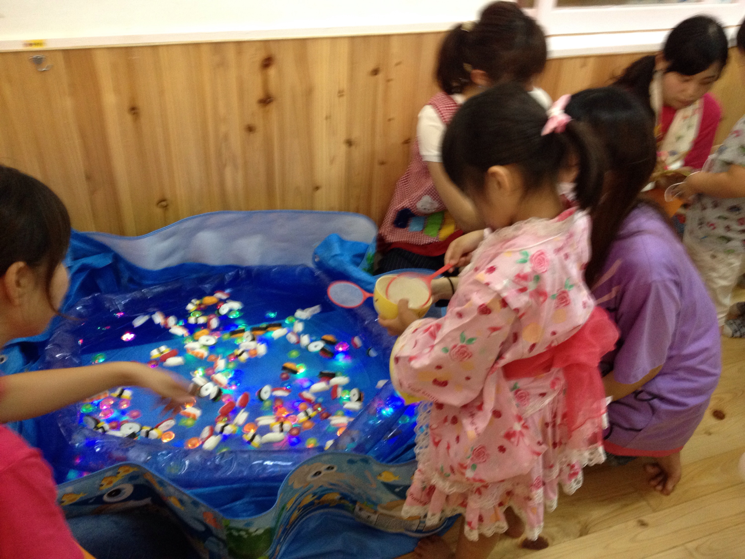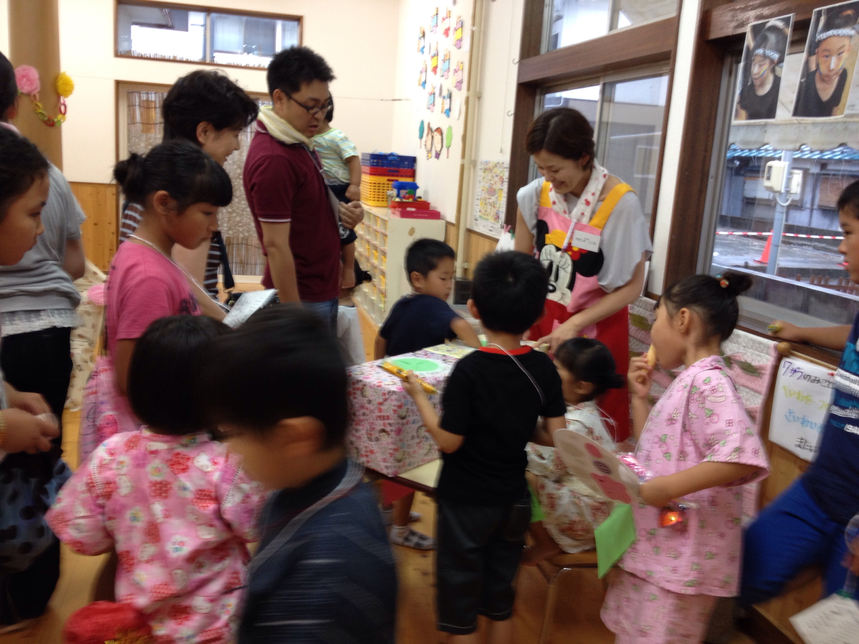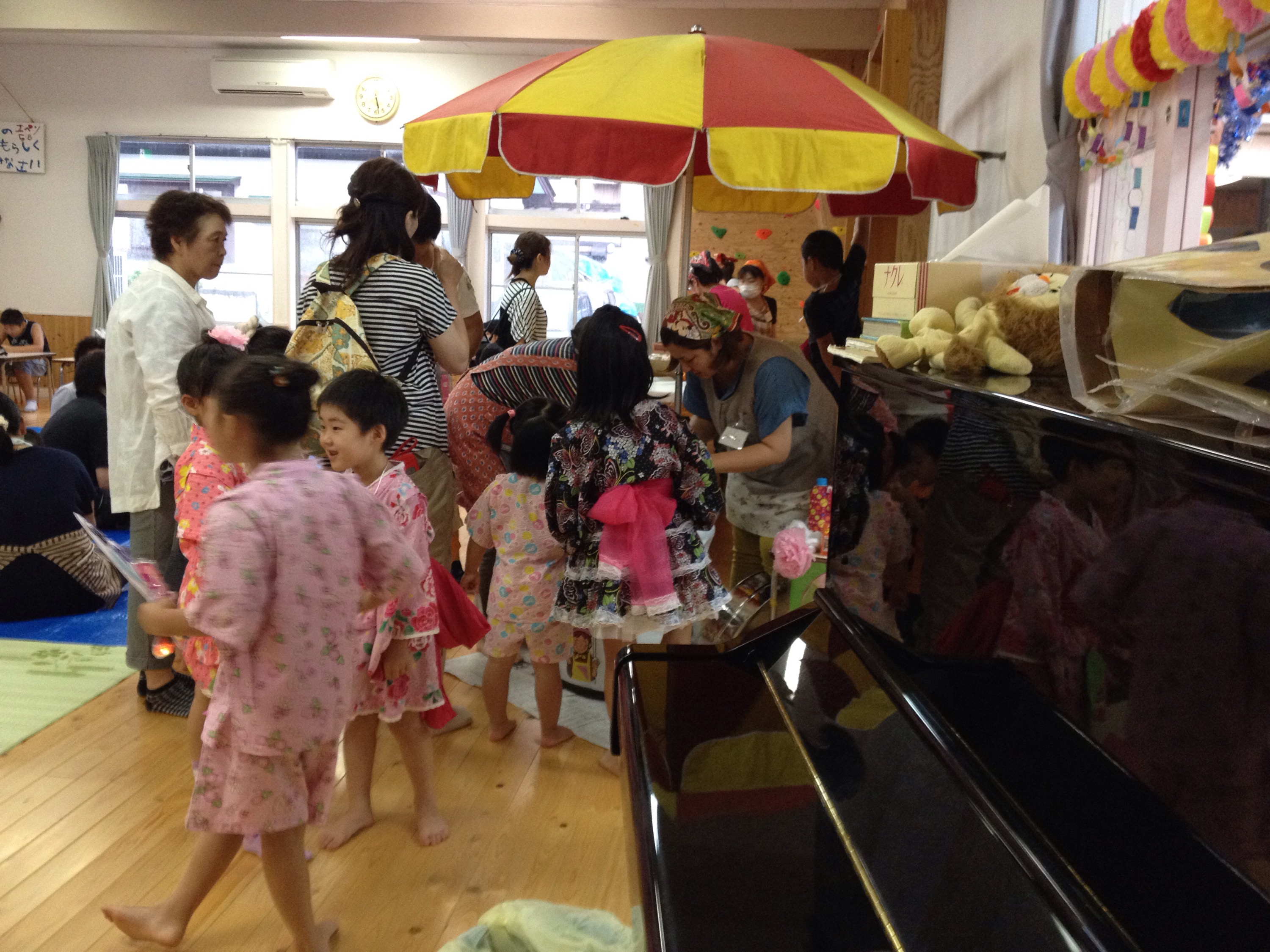 あいにくの天気になってしまい、湿気と子どもたちの元気な熱気で、室内はジメジメと蒸し暑くなりましたが、子どもたちは、お気に入りの服や浴衣、甚平などに身を包み、お母さんたちが一生懸命準備をしてくれたそれぞれのコーナーを楽しむことができました♫