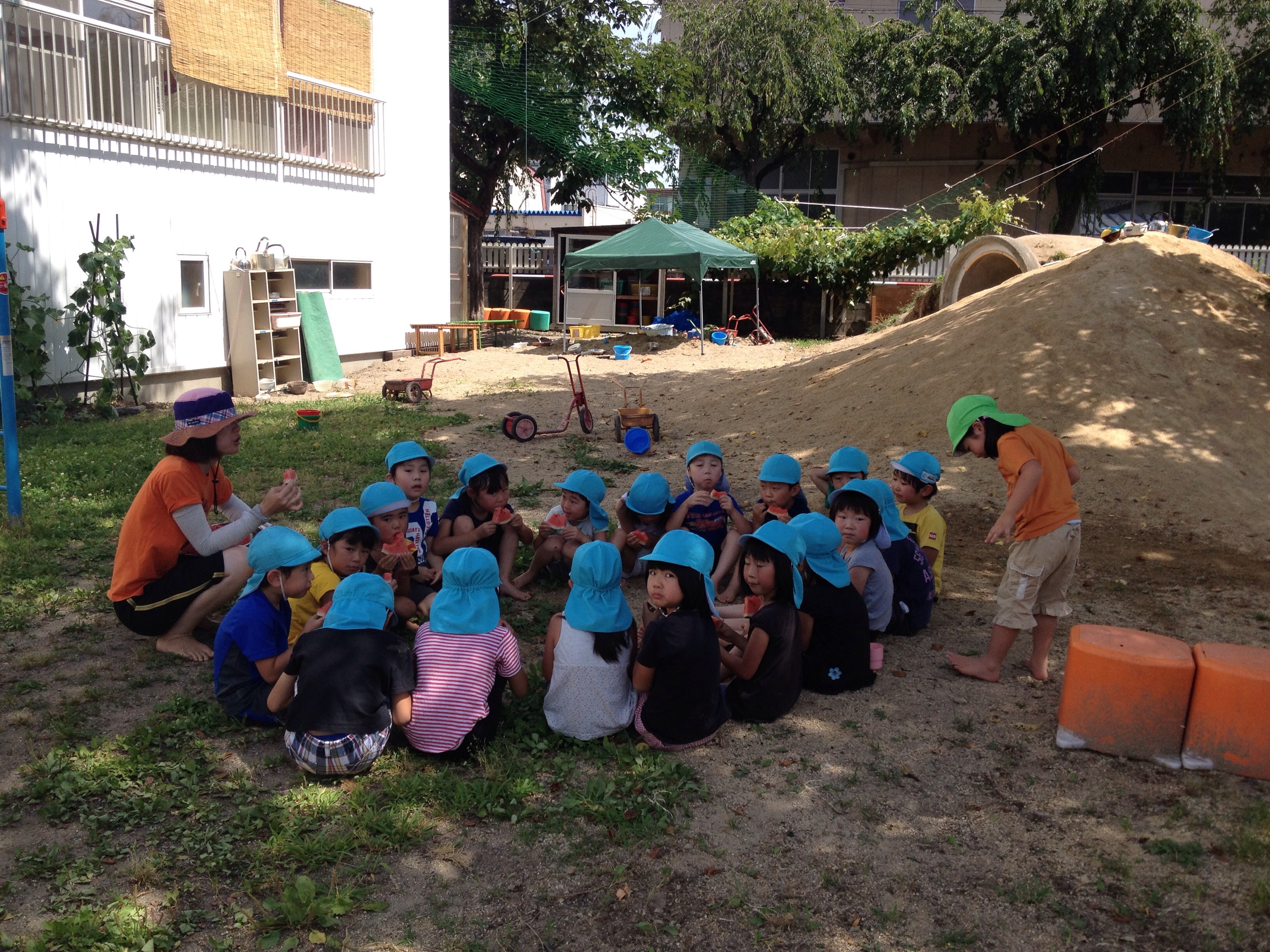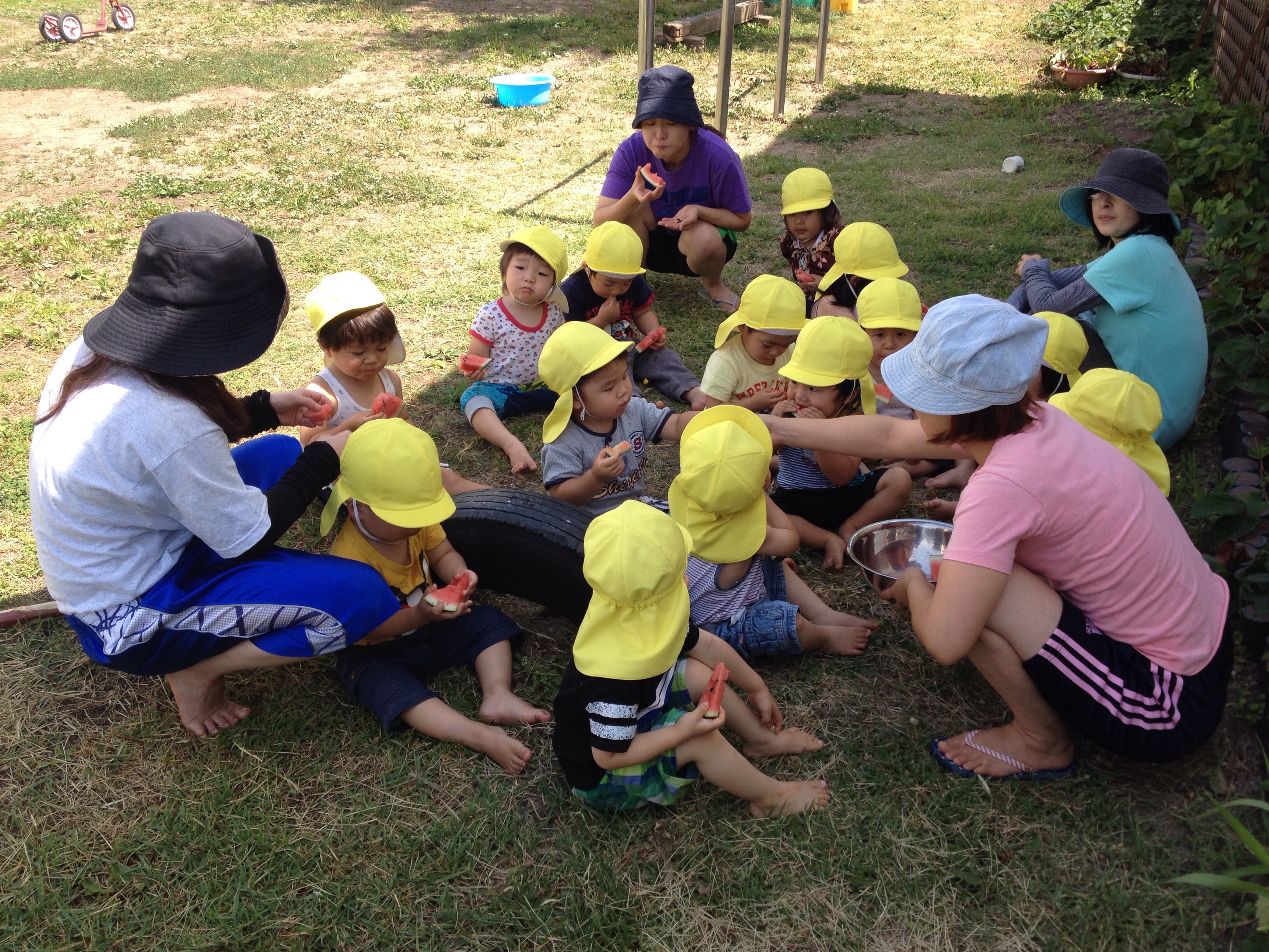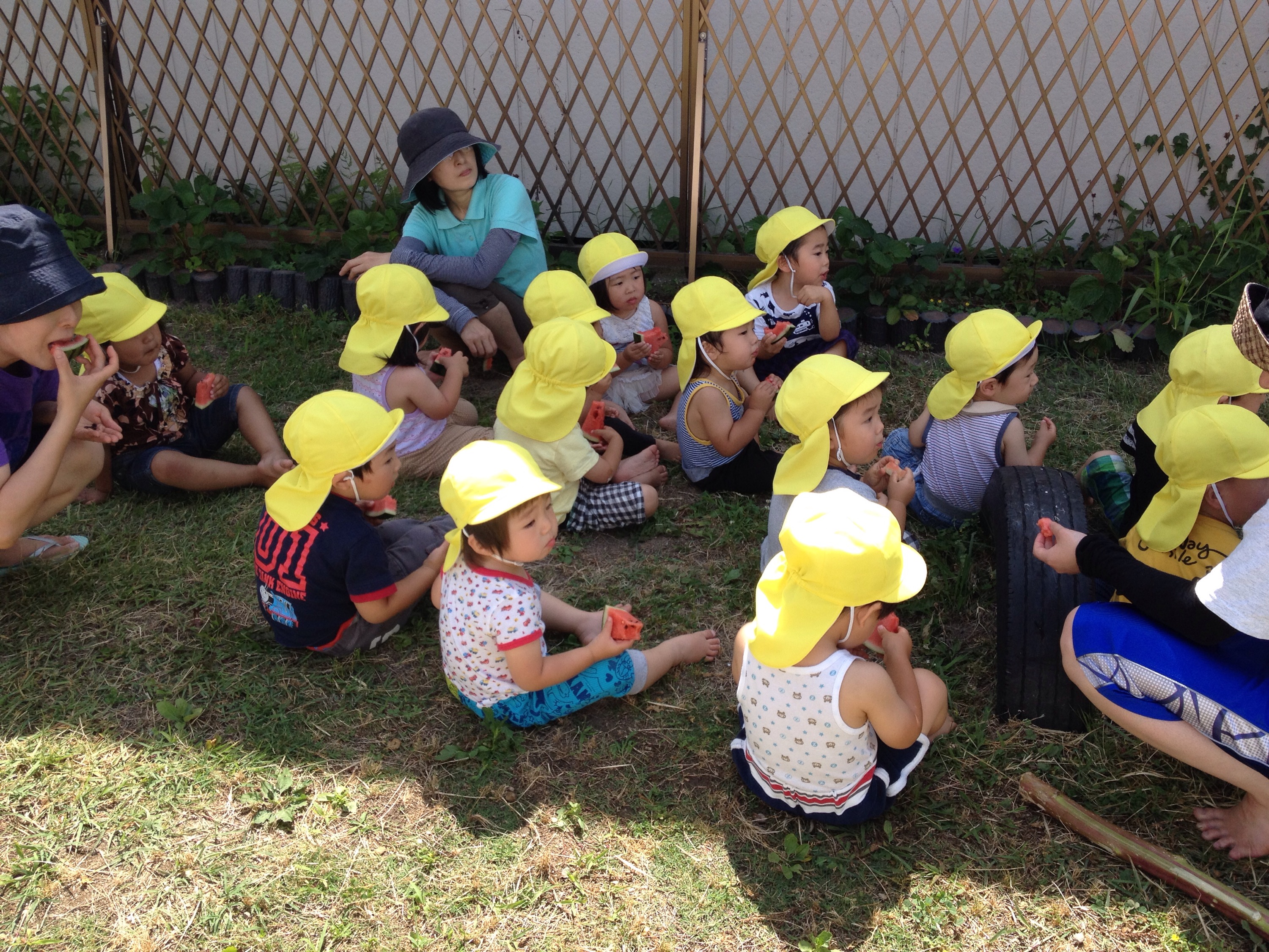今日は、井戸水で冷やした美味しい美味しいスイカを、みんな一緒に園庭で頂きました♫