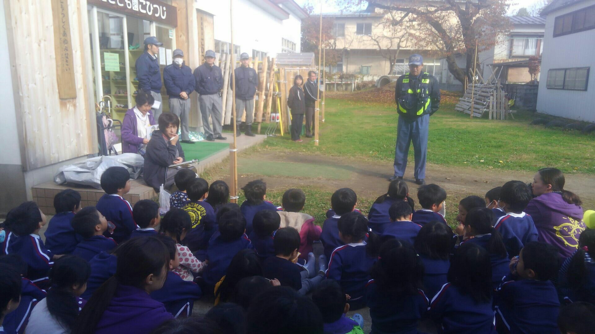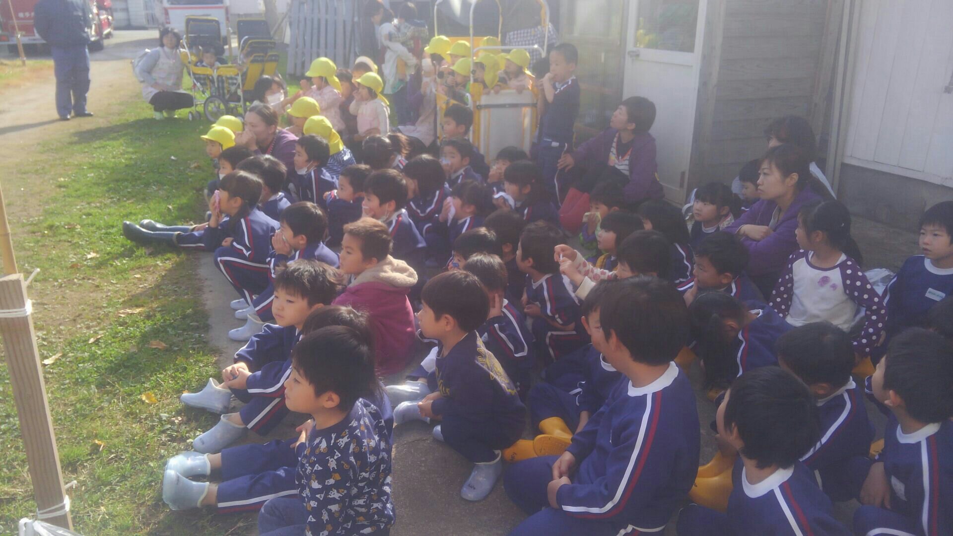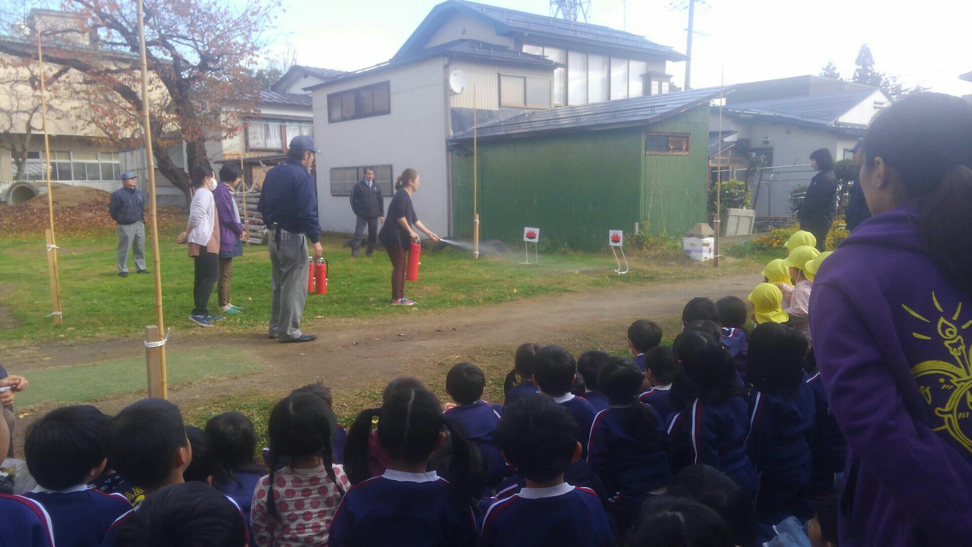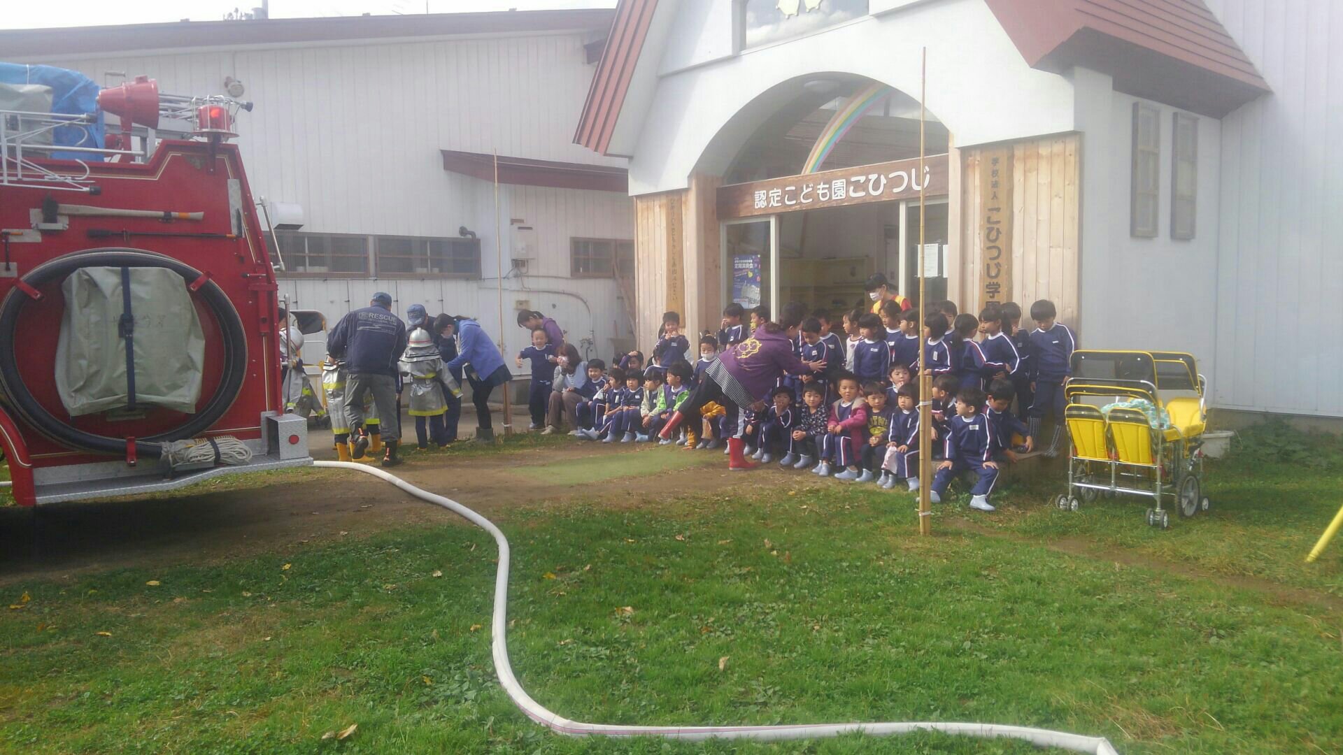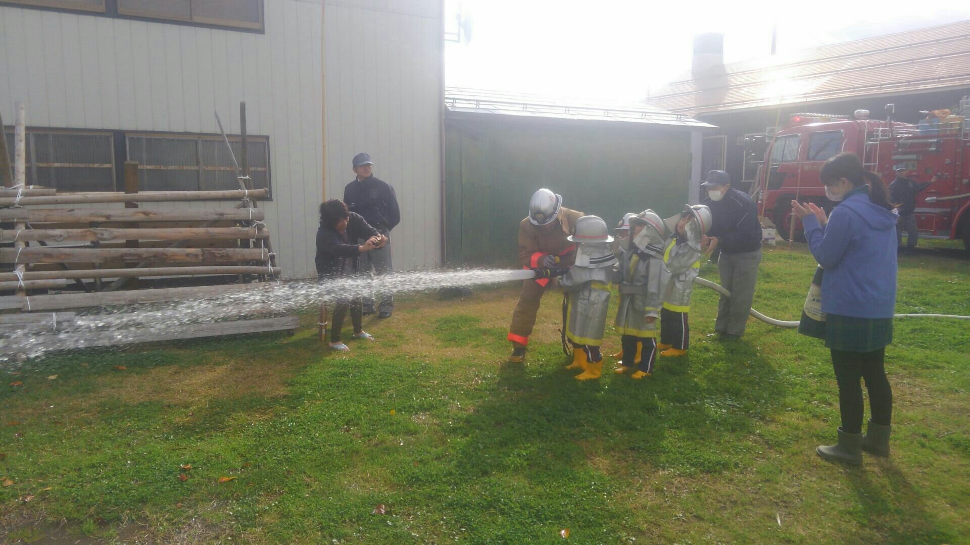 ・年長さんが、消防士さんに変身して、放水体験をした。 と、様々な道具を使い、実際に火災が起きたことを想定した訓練を行うことができました。