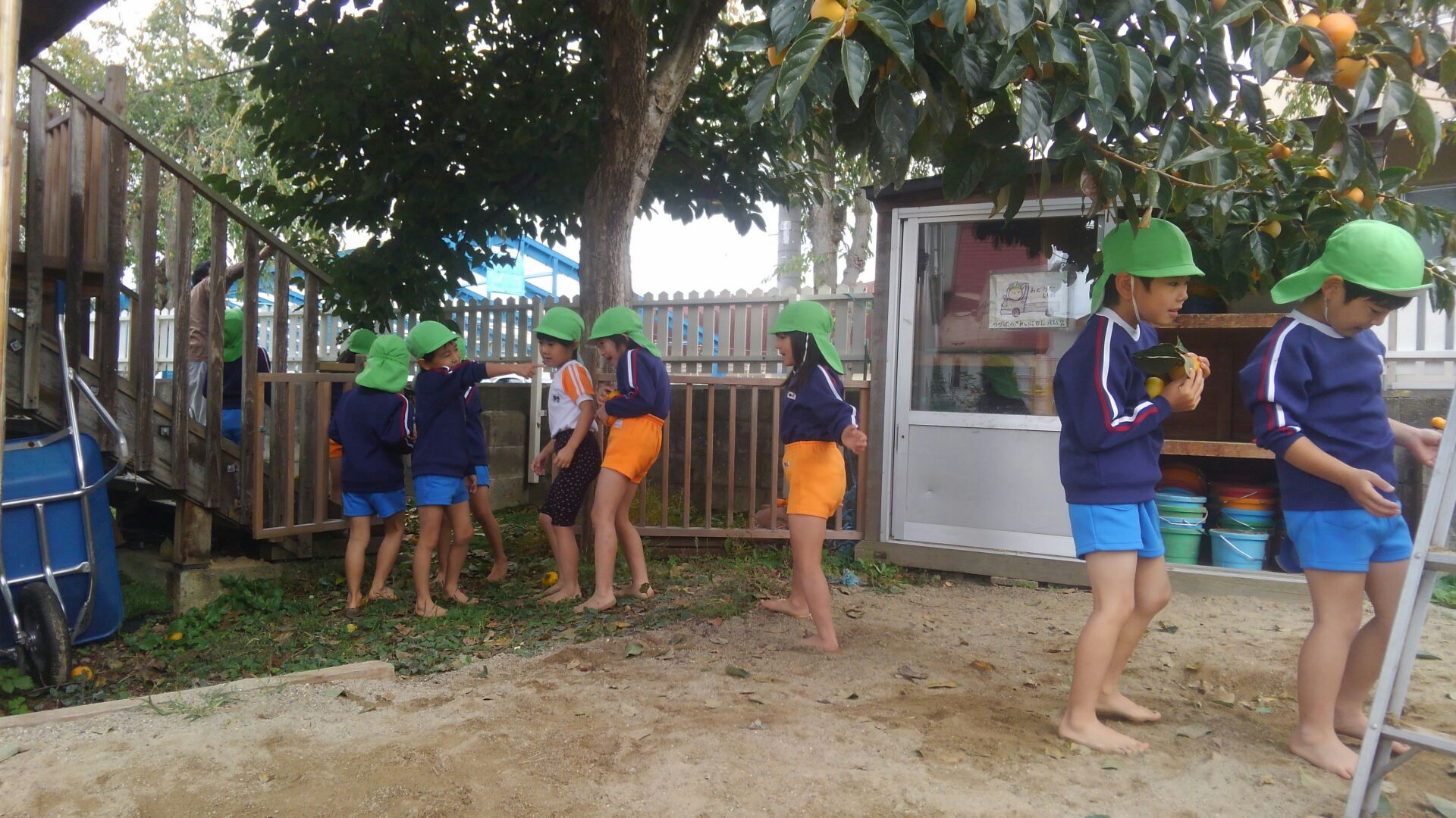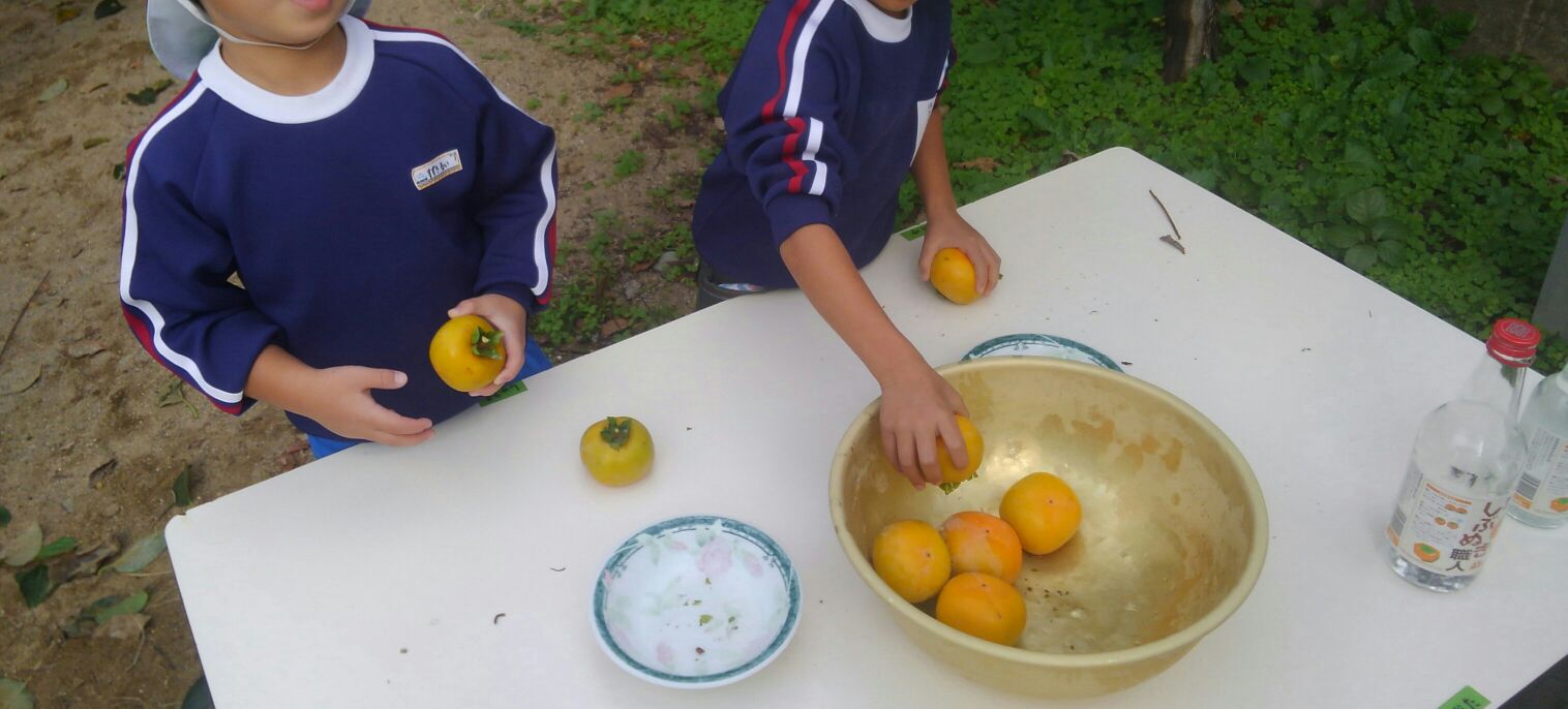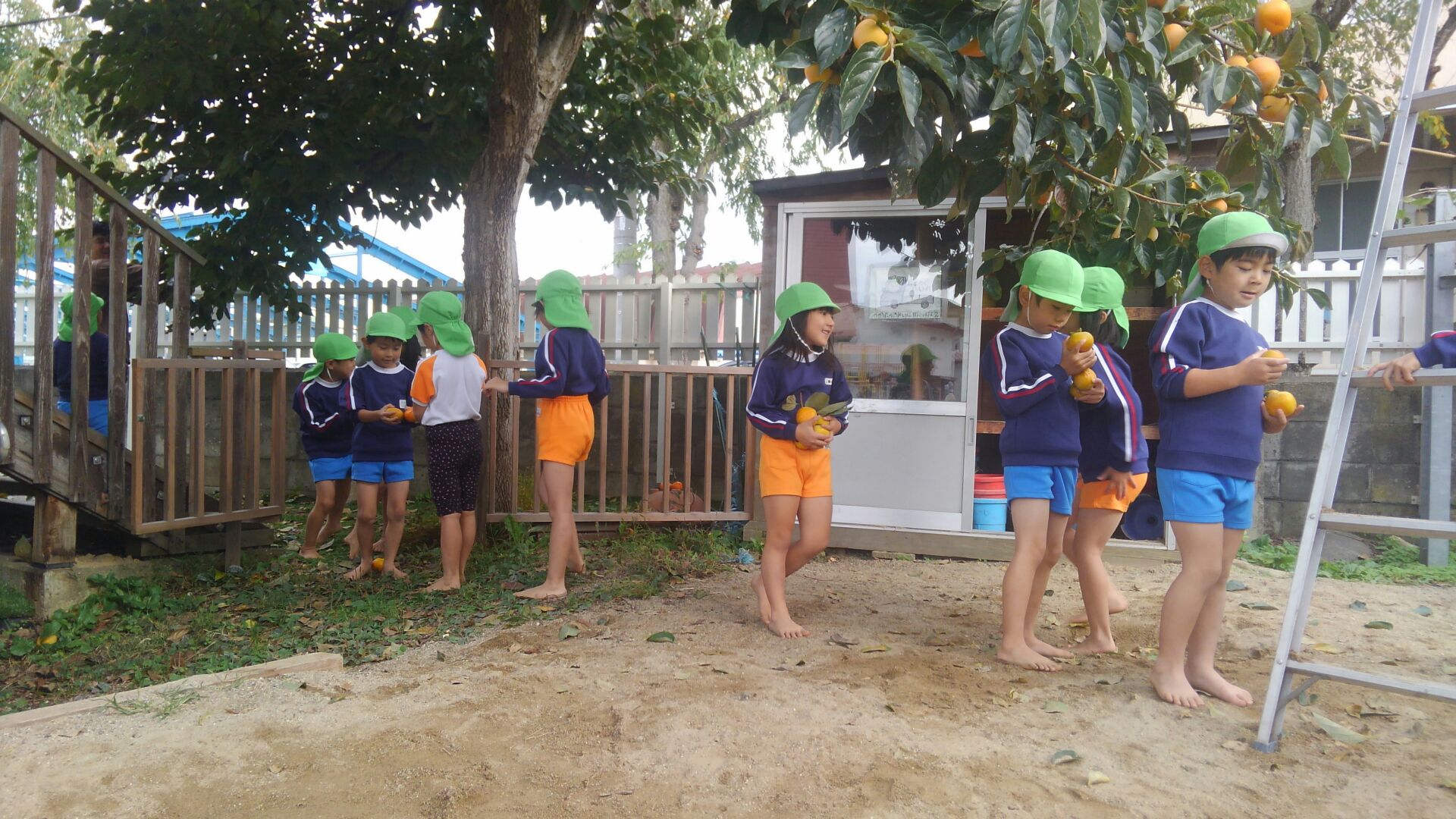 今日は、年長さんが園庭にたわわに実った「柿」の収穫作業を行いました♪