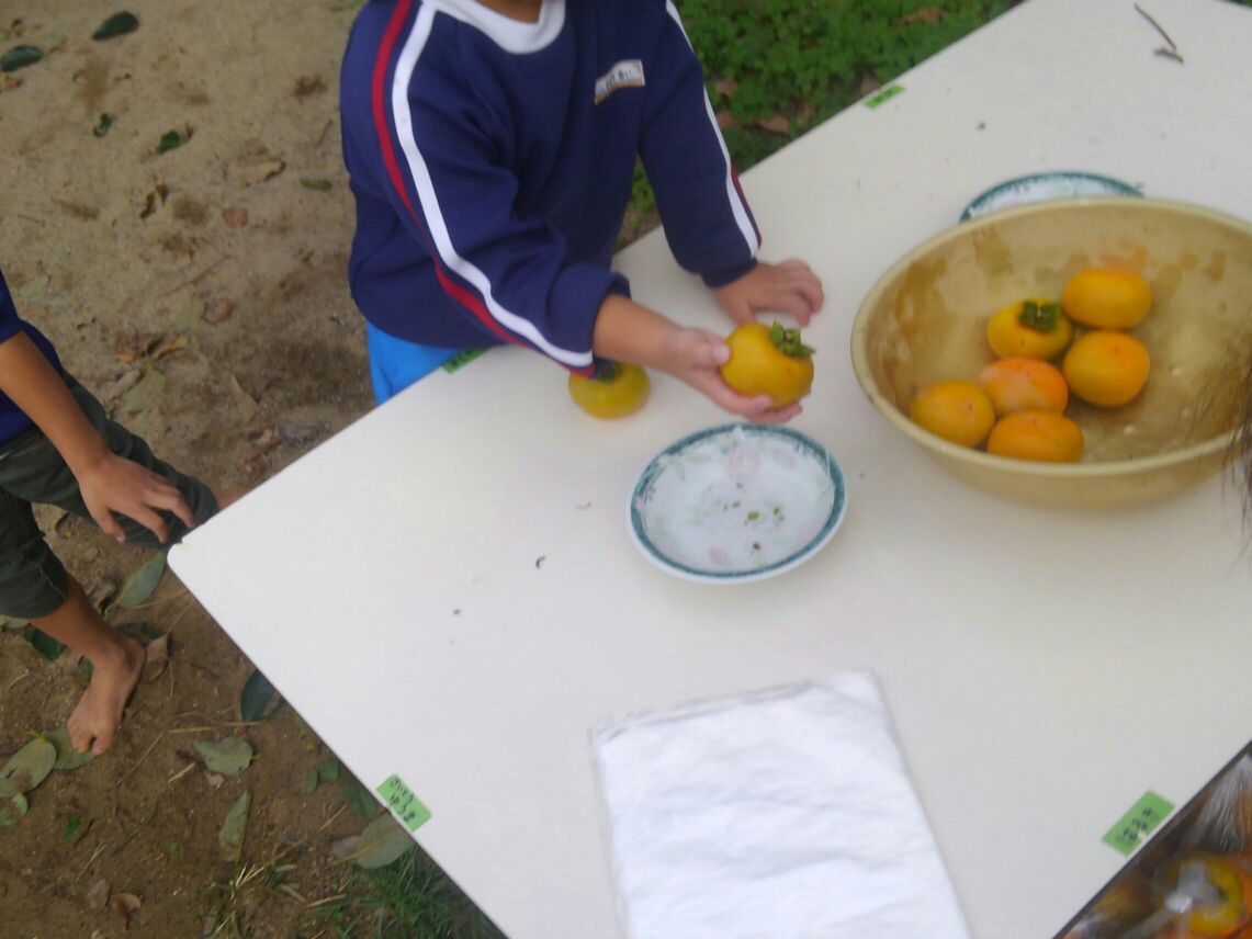 次に次に切り落とされる柿を受け取り、バケツリレーならぬ柿リレーを自分たちで率先して行い、渋抜きをし、袋詰めと言った一連の作業をみんなで協力して、張り切って取り組んでいました。