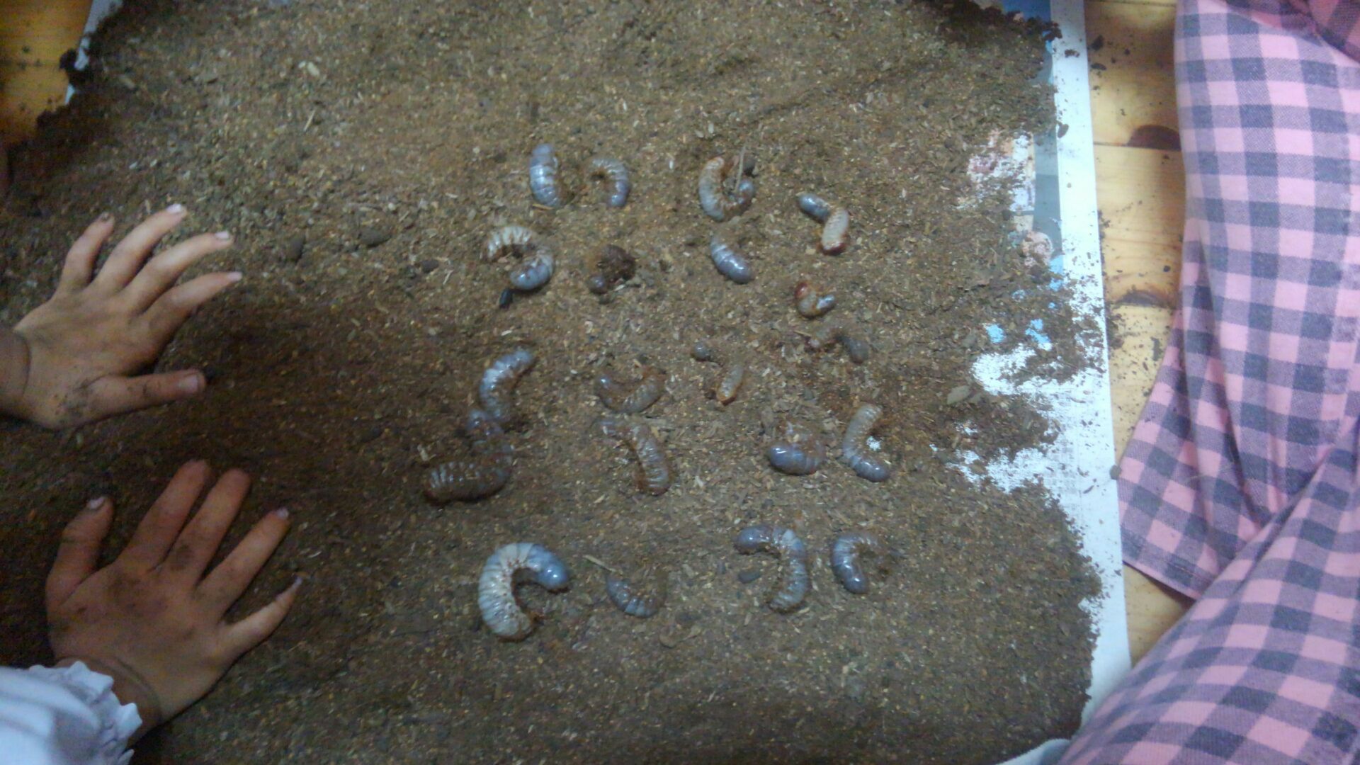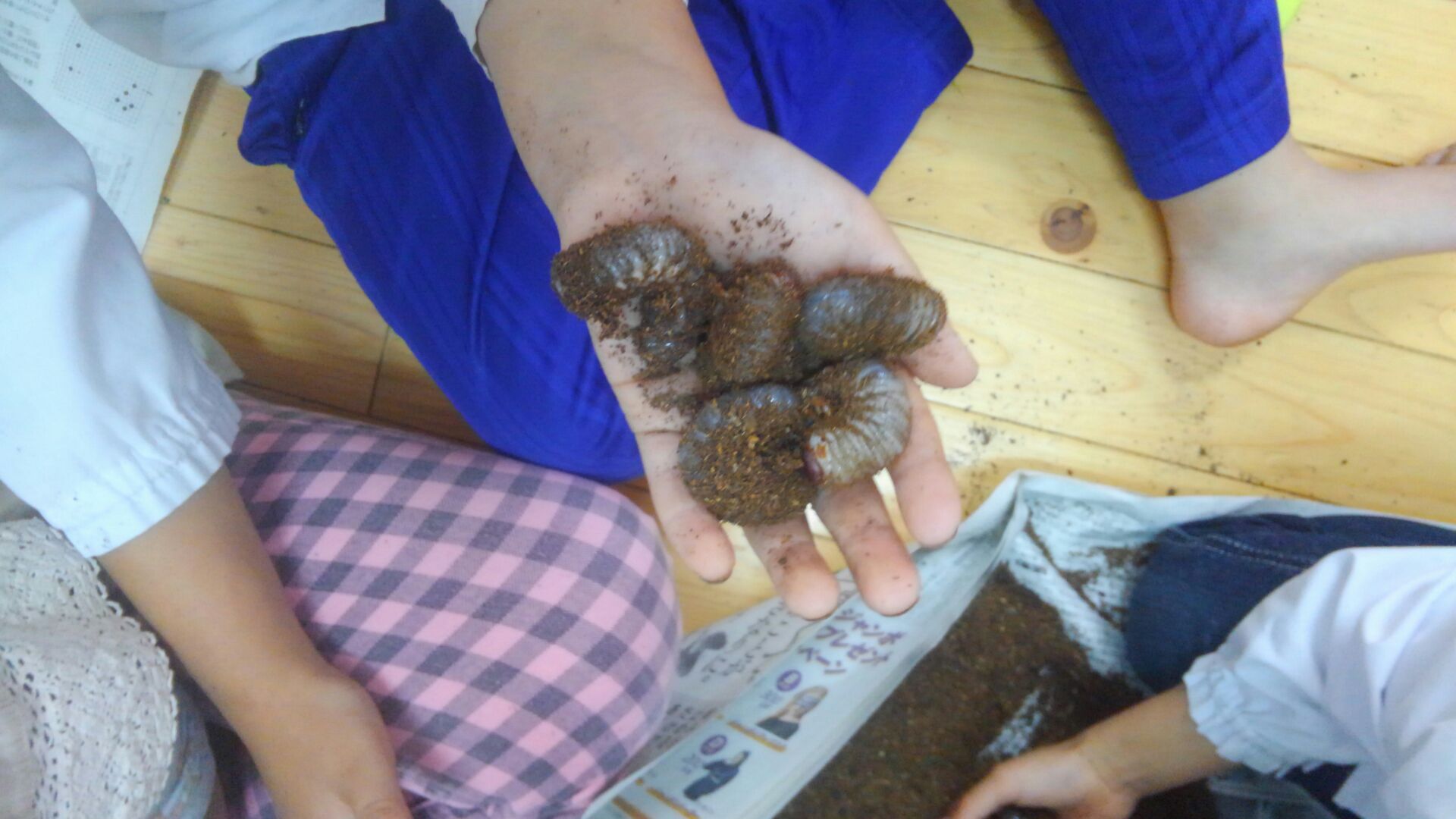 昼食後、廊下がにぎやかになり、覗いてみると、なんとなんと!!夏にみんなのことを楽しませてくれた「カブトムシ」の卵が幼虫へと生長していたのです!その様子に、子どもたちが大興奮し、クラスの友だちをどんどん呼んできて、あっという間に虫かごのまわりは大にぎわい♪