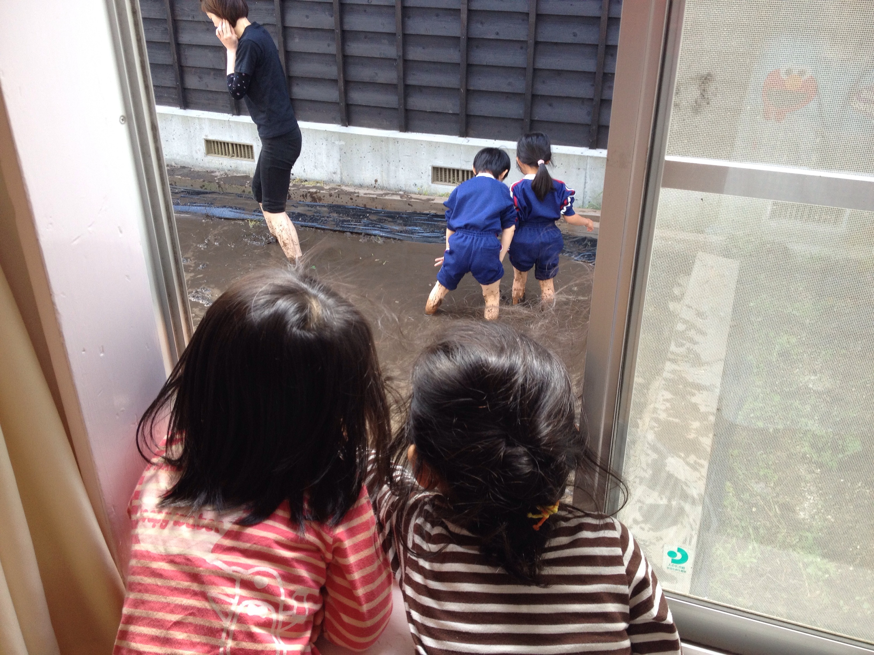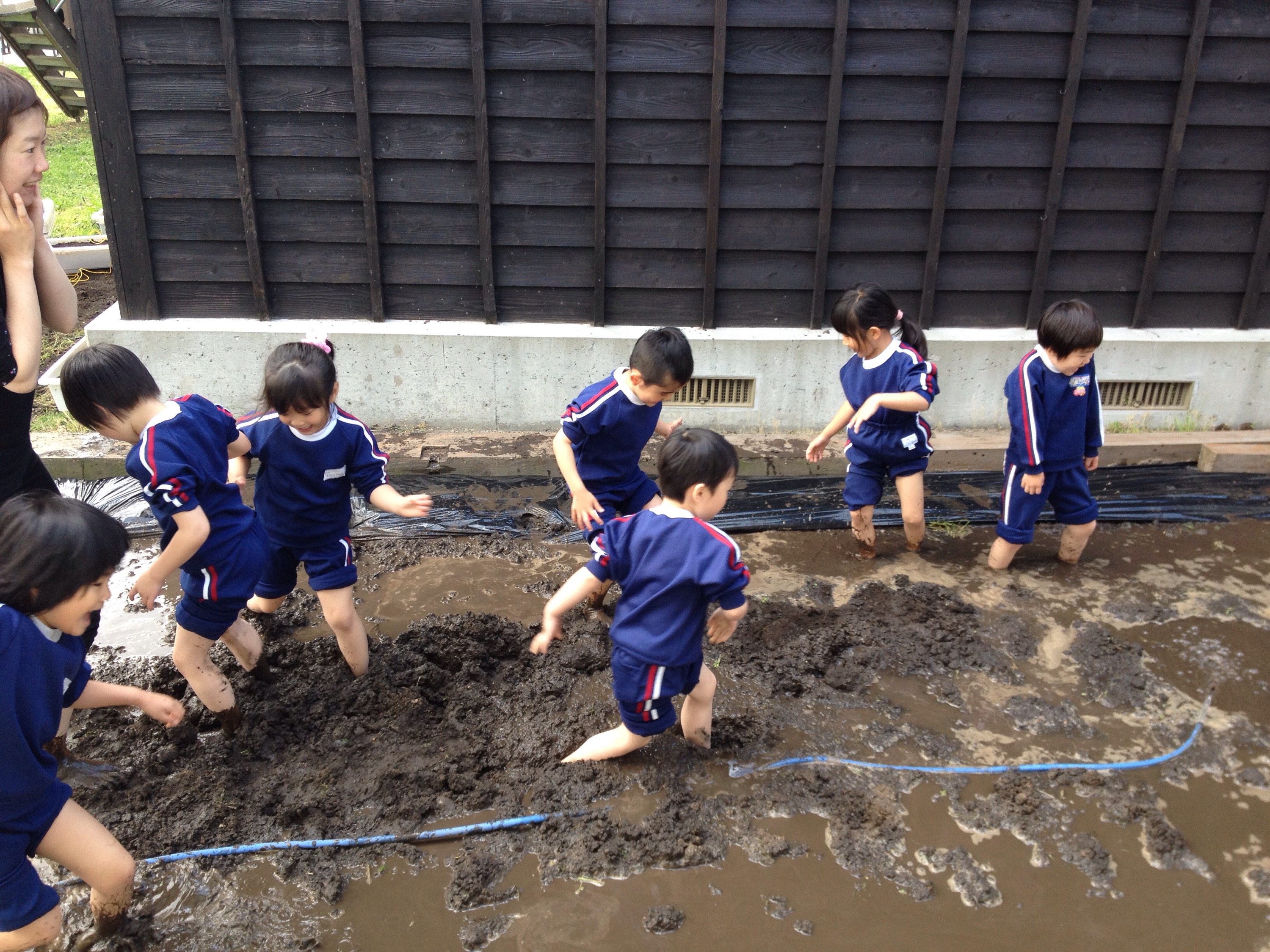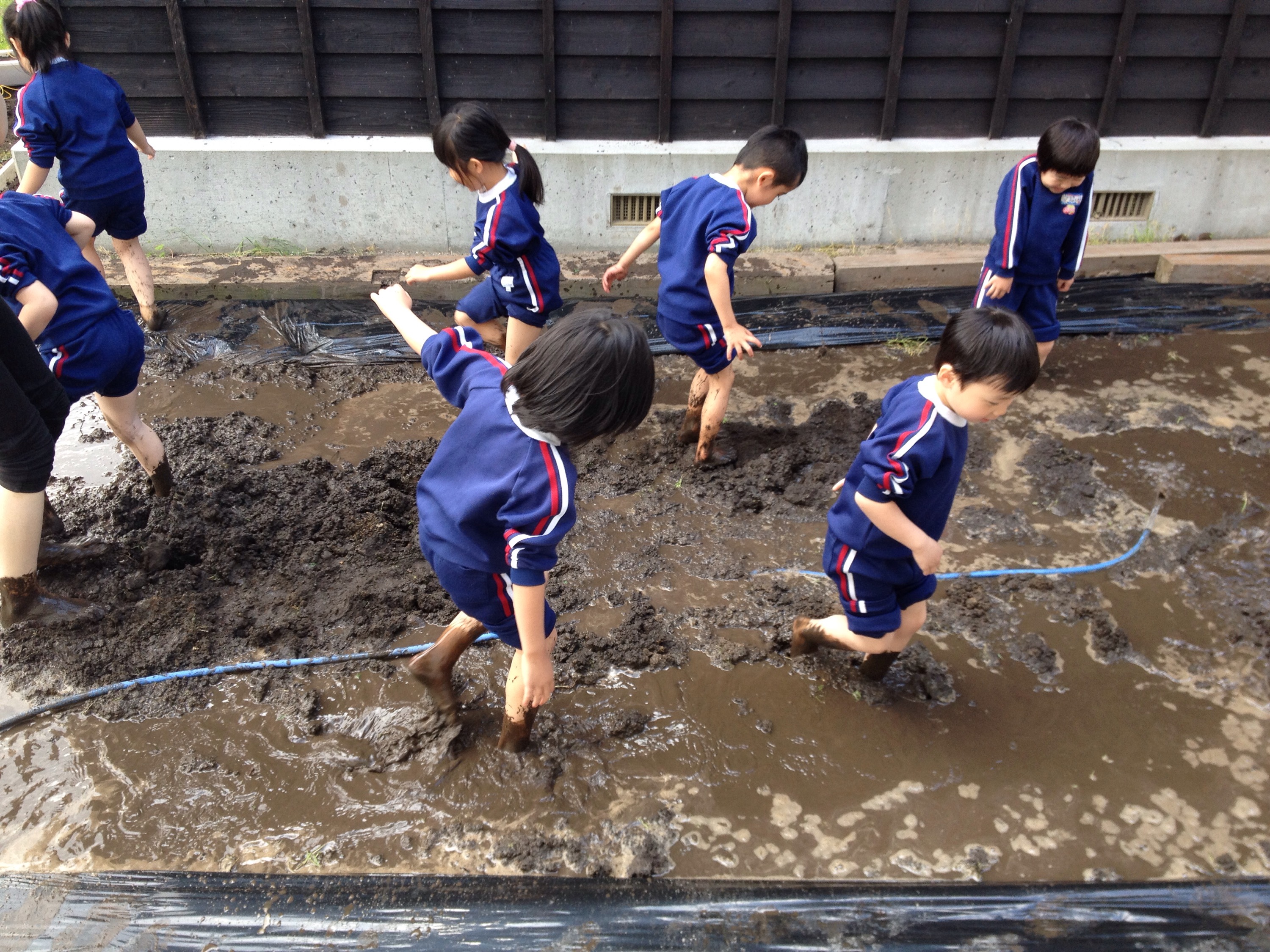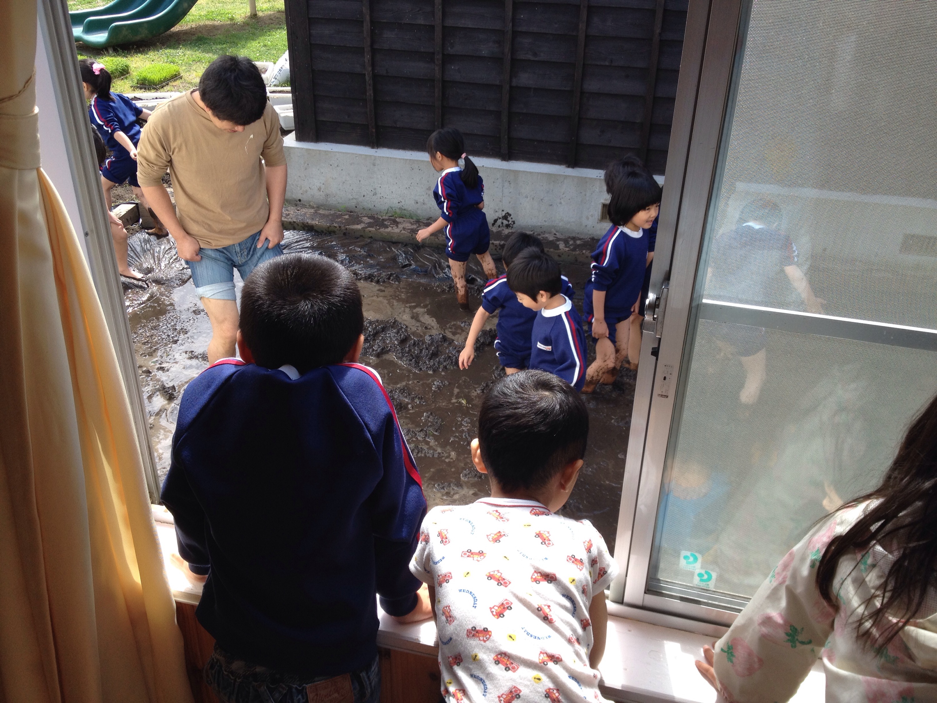 写真は、田植えの準備をする年長さんと、その姿を憧れの眼差しで見守る年中さんと年少さんの後ろ姿です♫