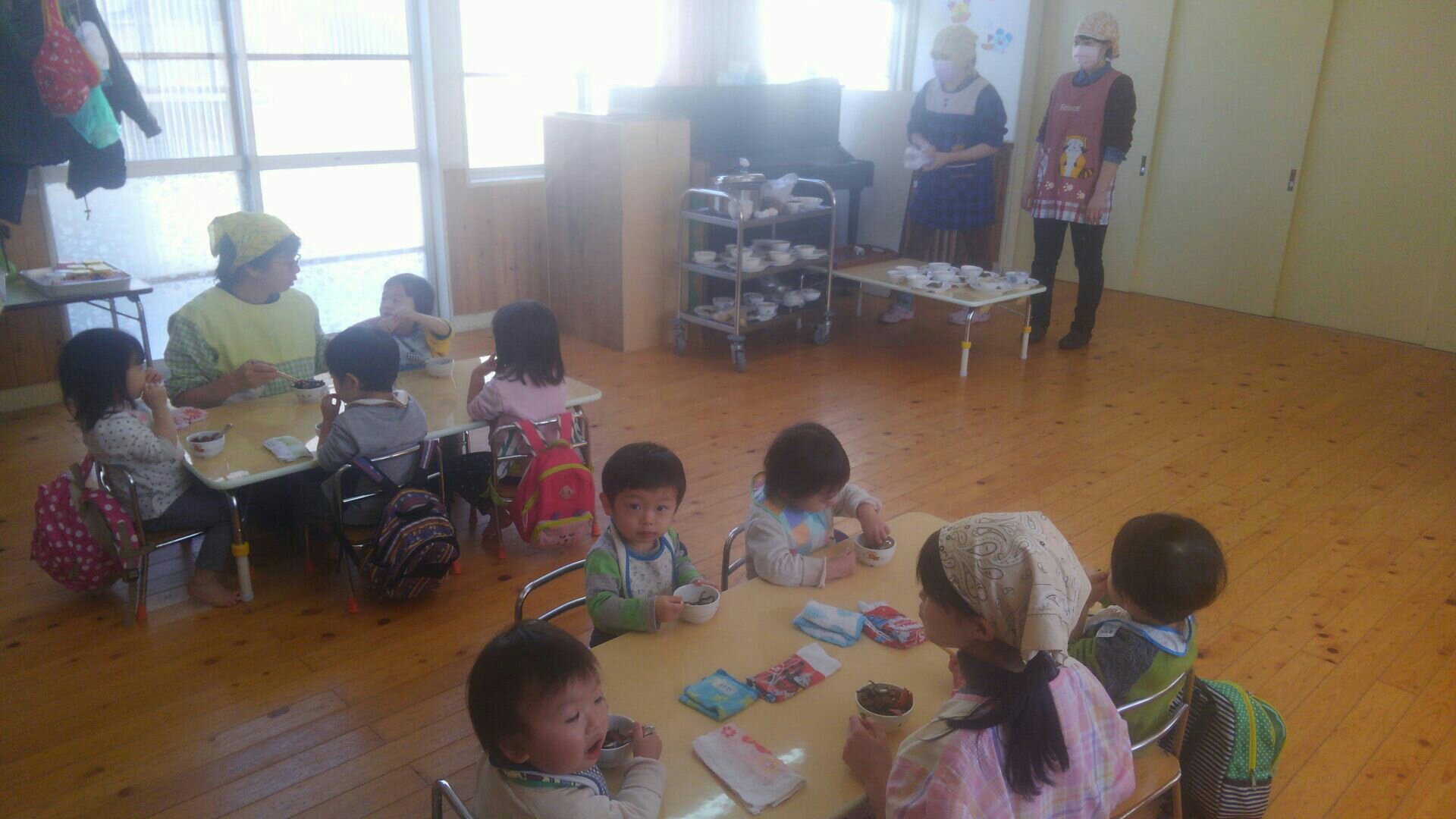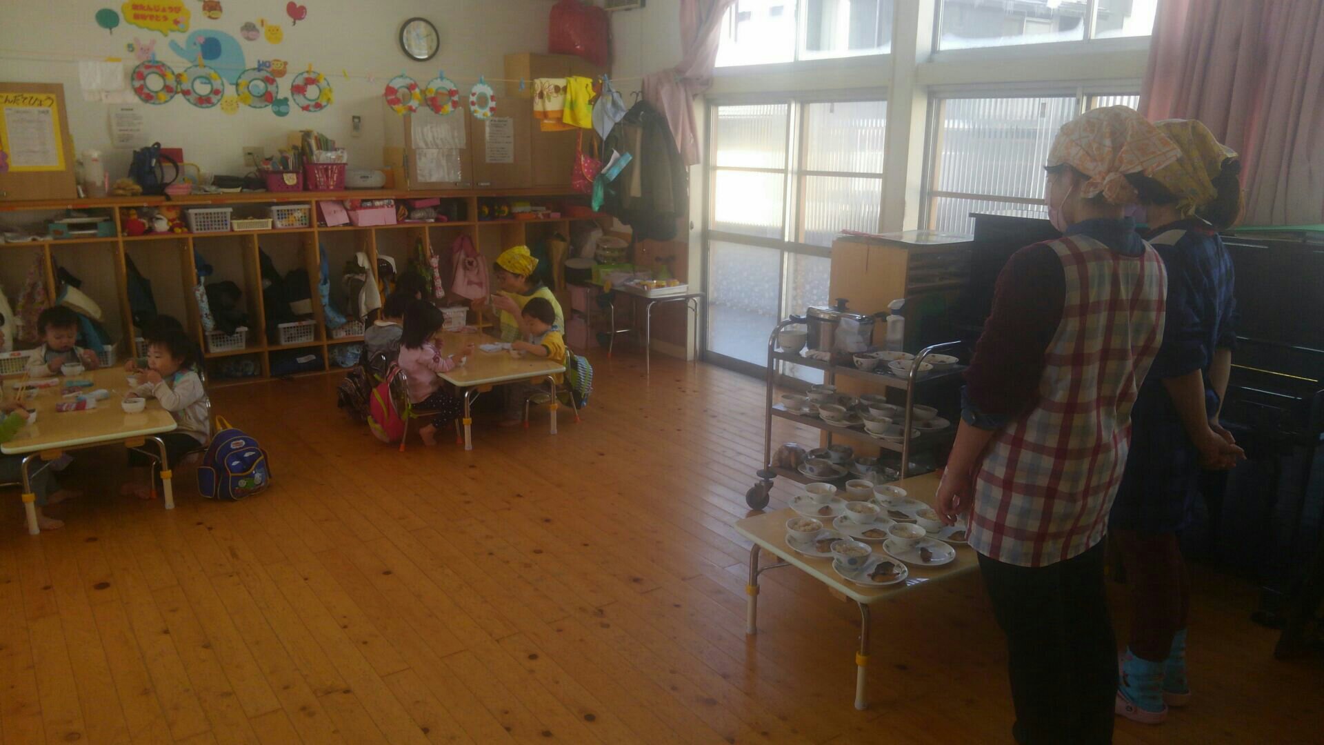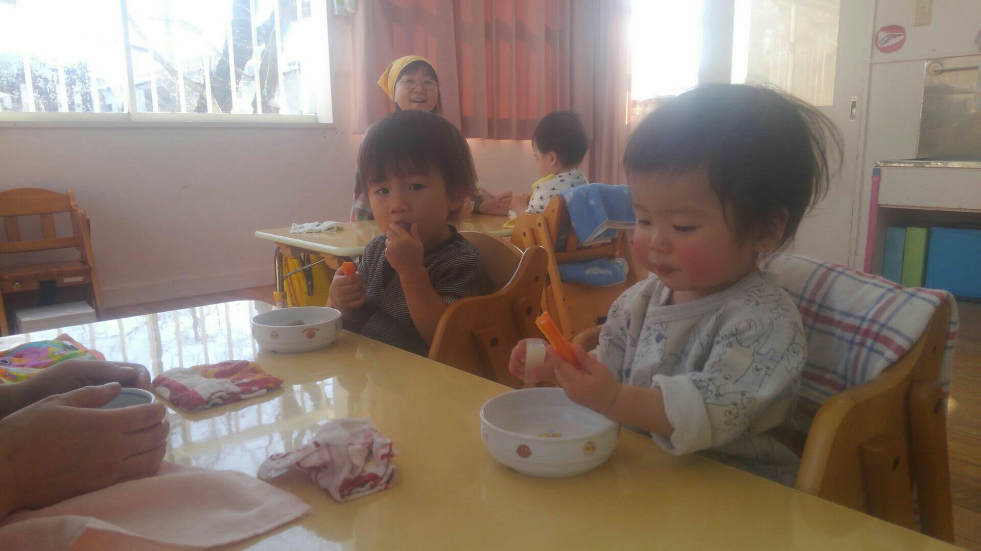 二歳児さんは、散歩から帰ってきて隣で給食の準備中です♪