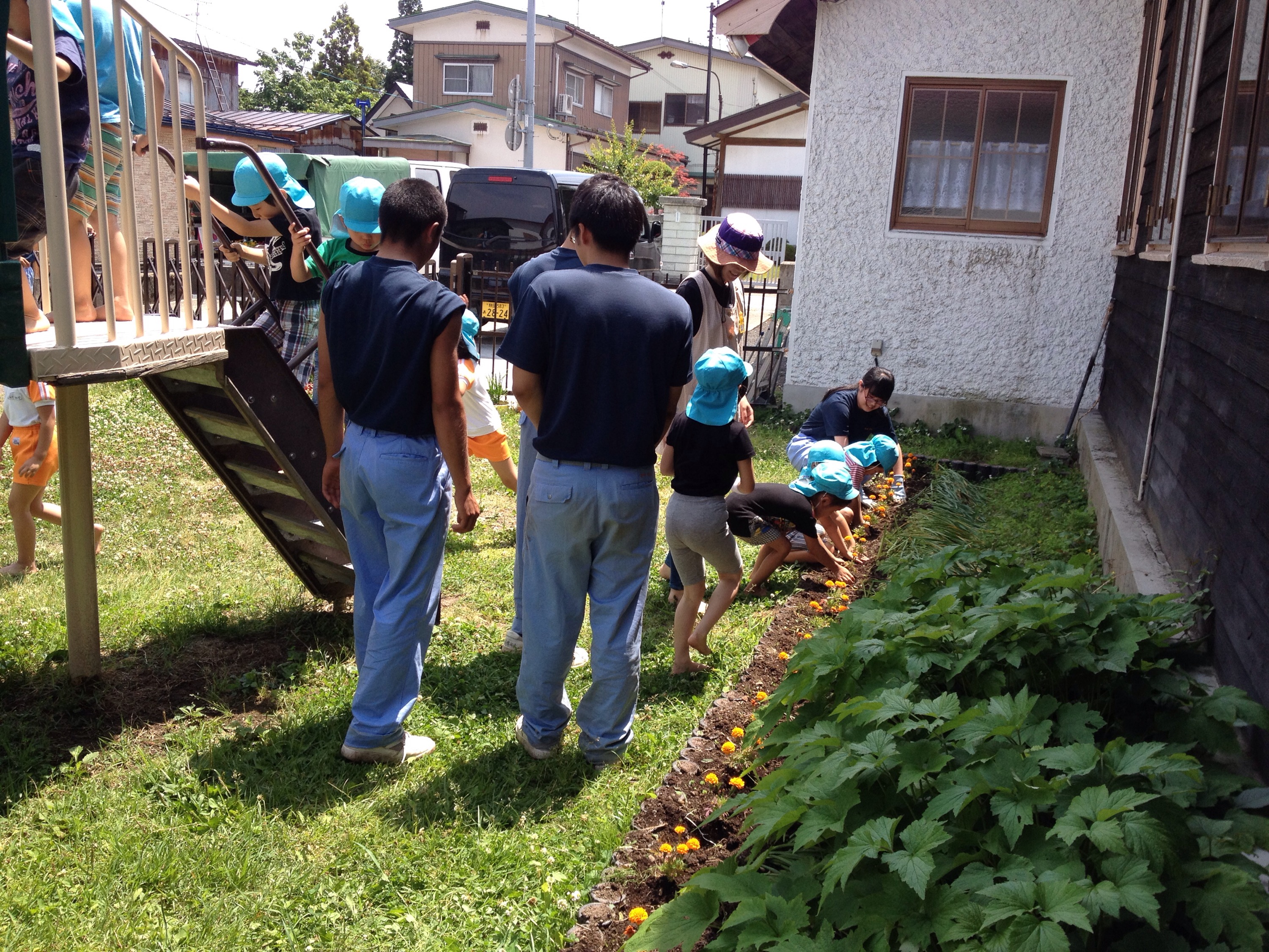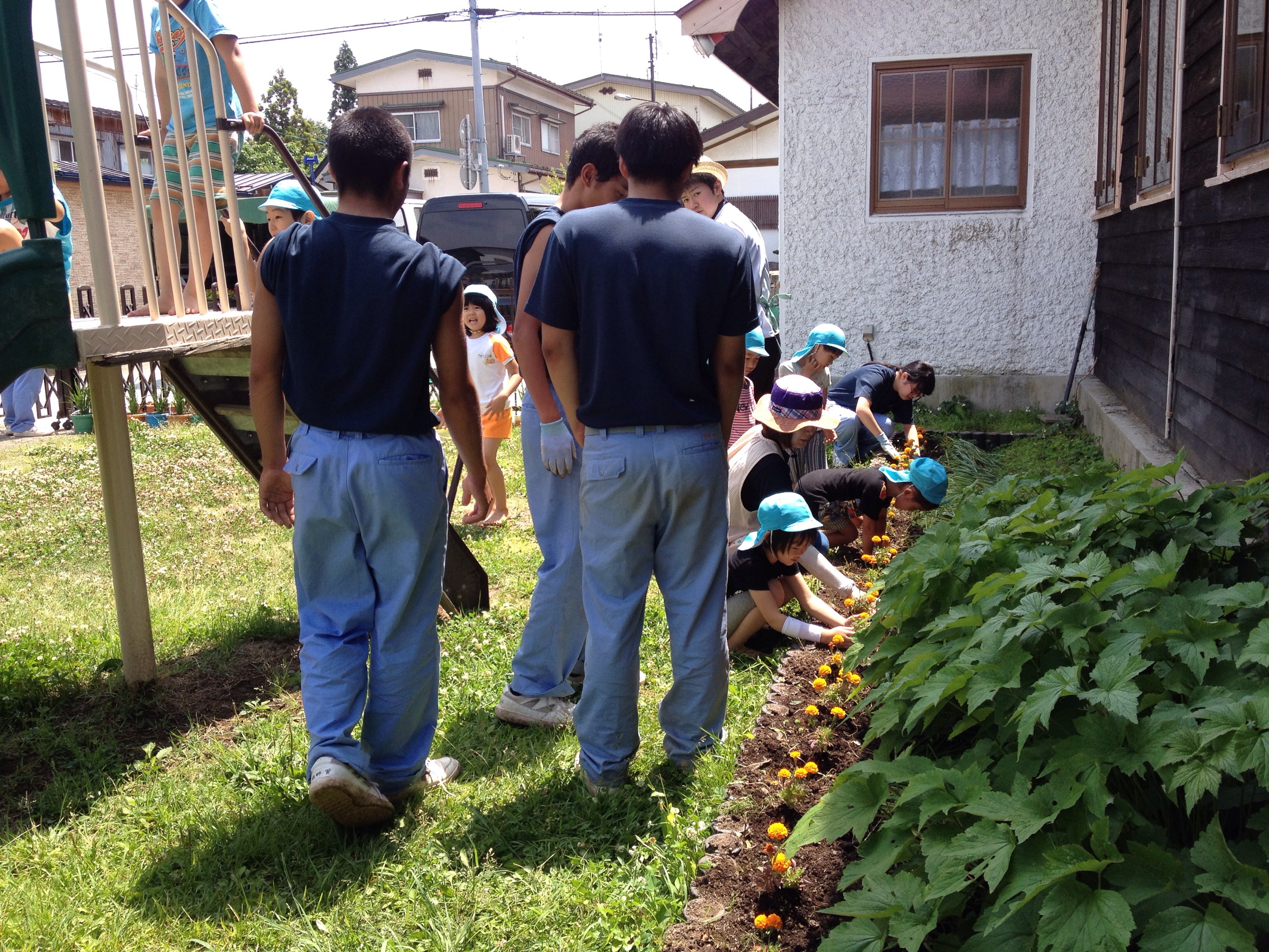 今週はじめ、年長さんが地元の高校生のお兄さんお姉さんたち(卒園生もいました!)と一緒に花壇作りを行いました。