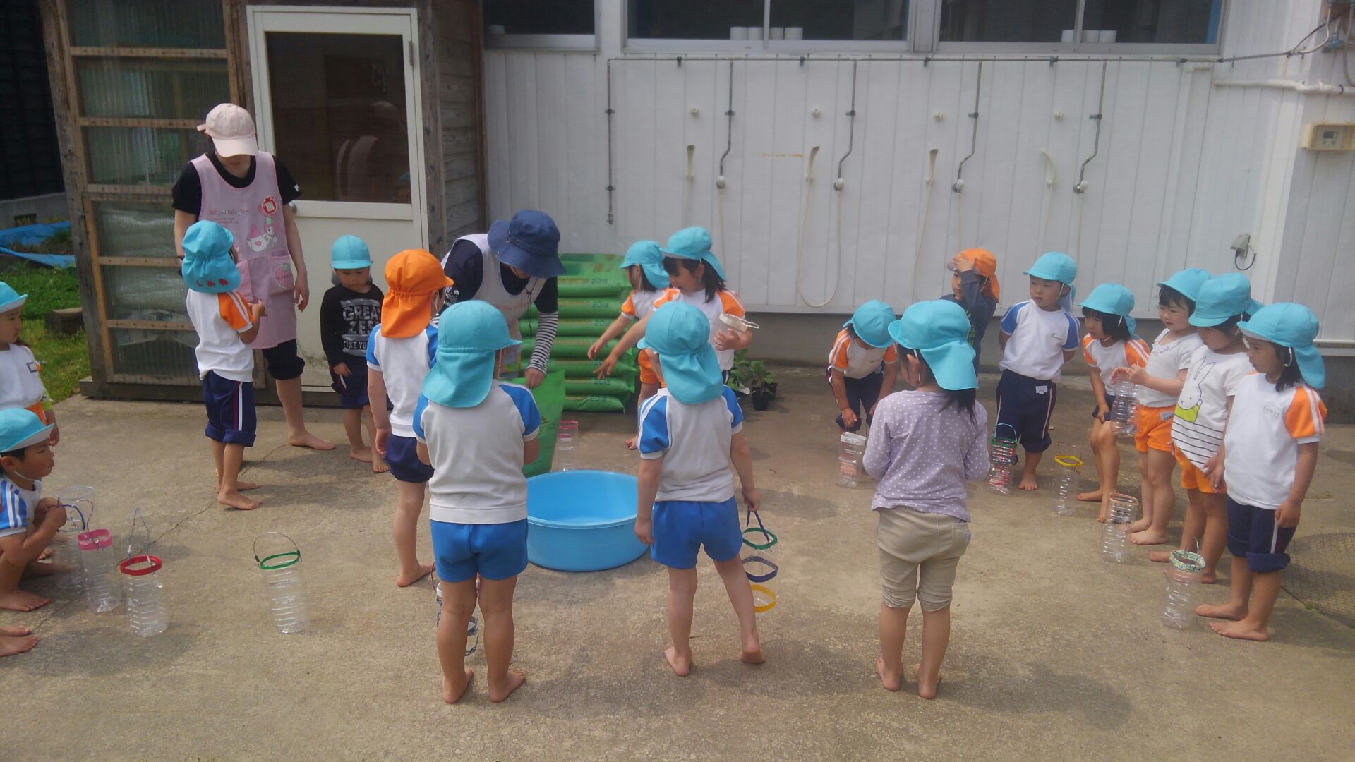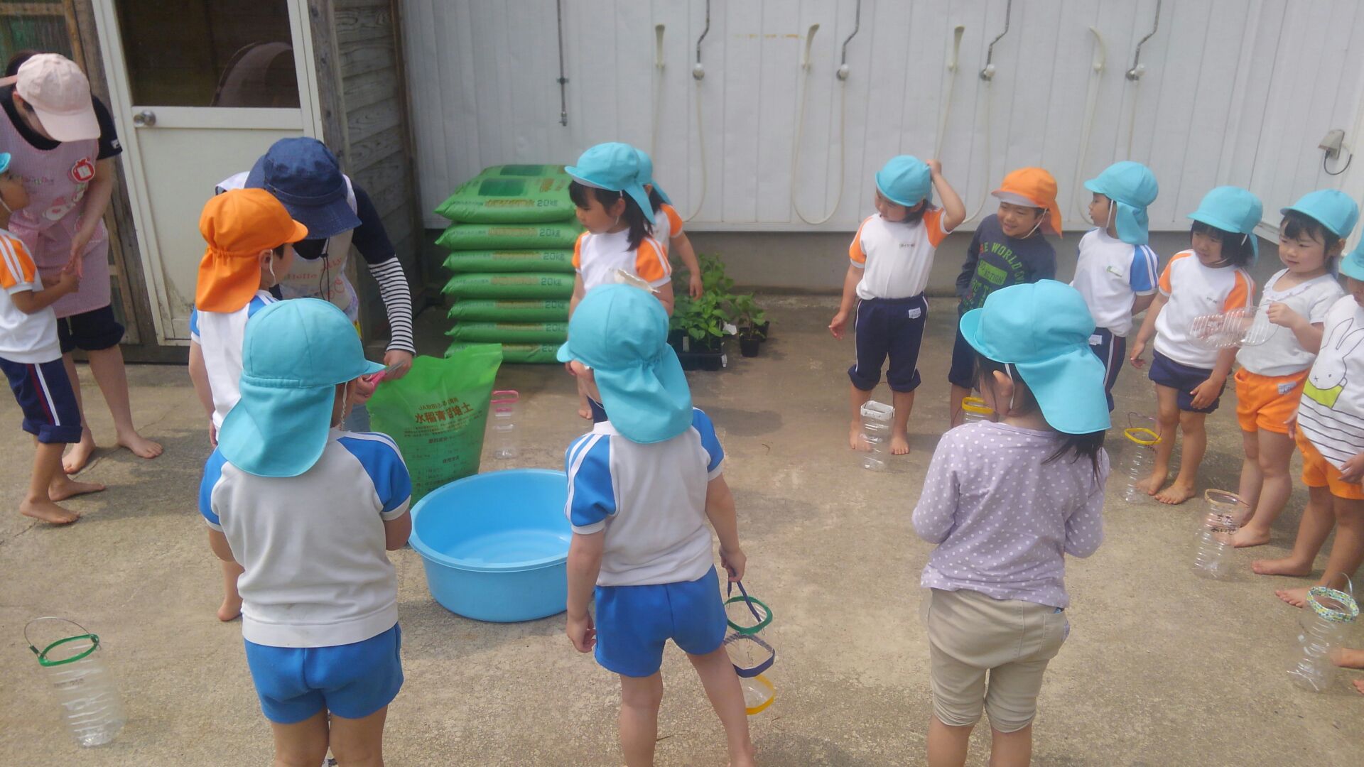 5月30日 ゆり組さんは、広い畑にさつまいもの苗を植えました♪ すみれ組さんは、おうちから持ってきたペットボトルプランターにピーマンの苗を植えました♪ たんぽぽ組さんは、園庭のミニガーデンにトマトとナスときゅうりの苗を植えました♪