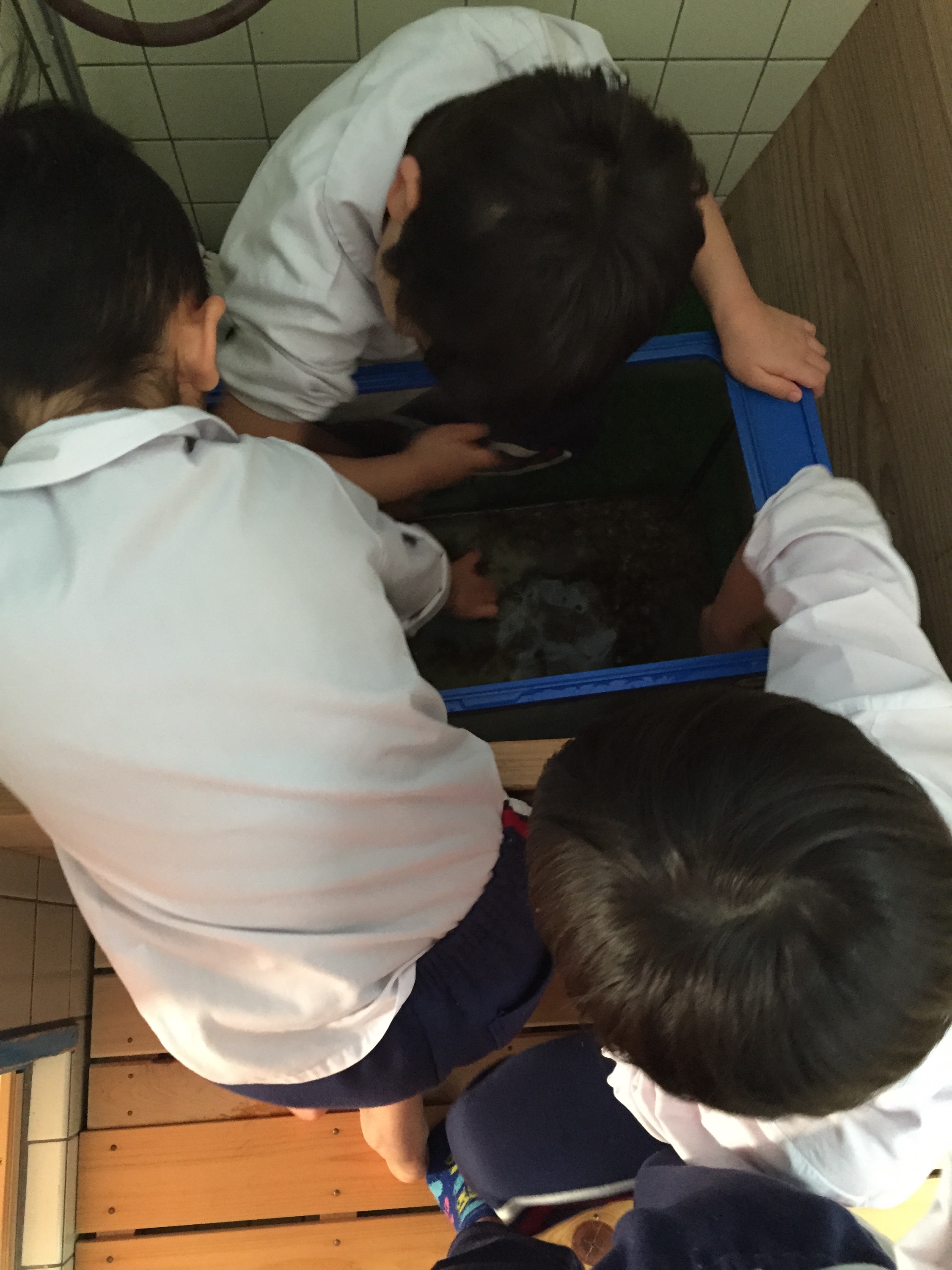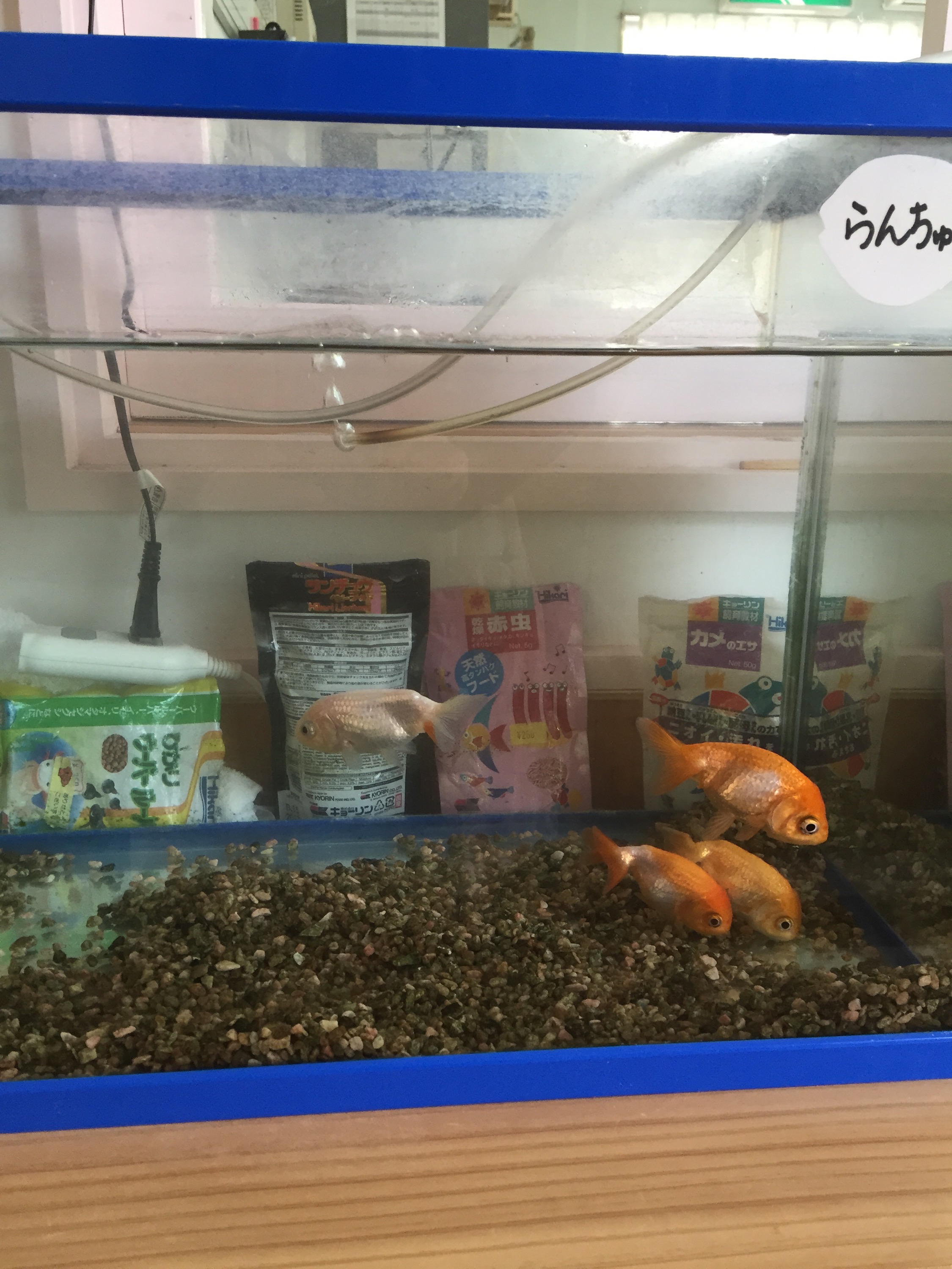 この間から年長さんの男の子が水槽の汚れに気がついて、はやくきれいにしないと金魚さんかわいそうだよー!!の声にやっと今日、きれいにできました。