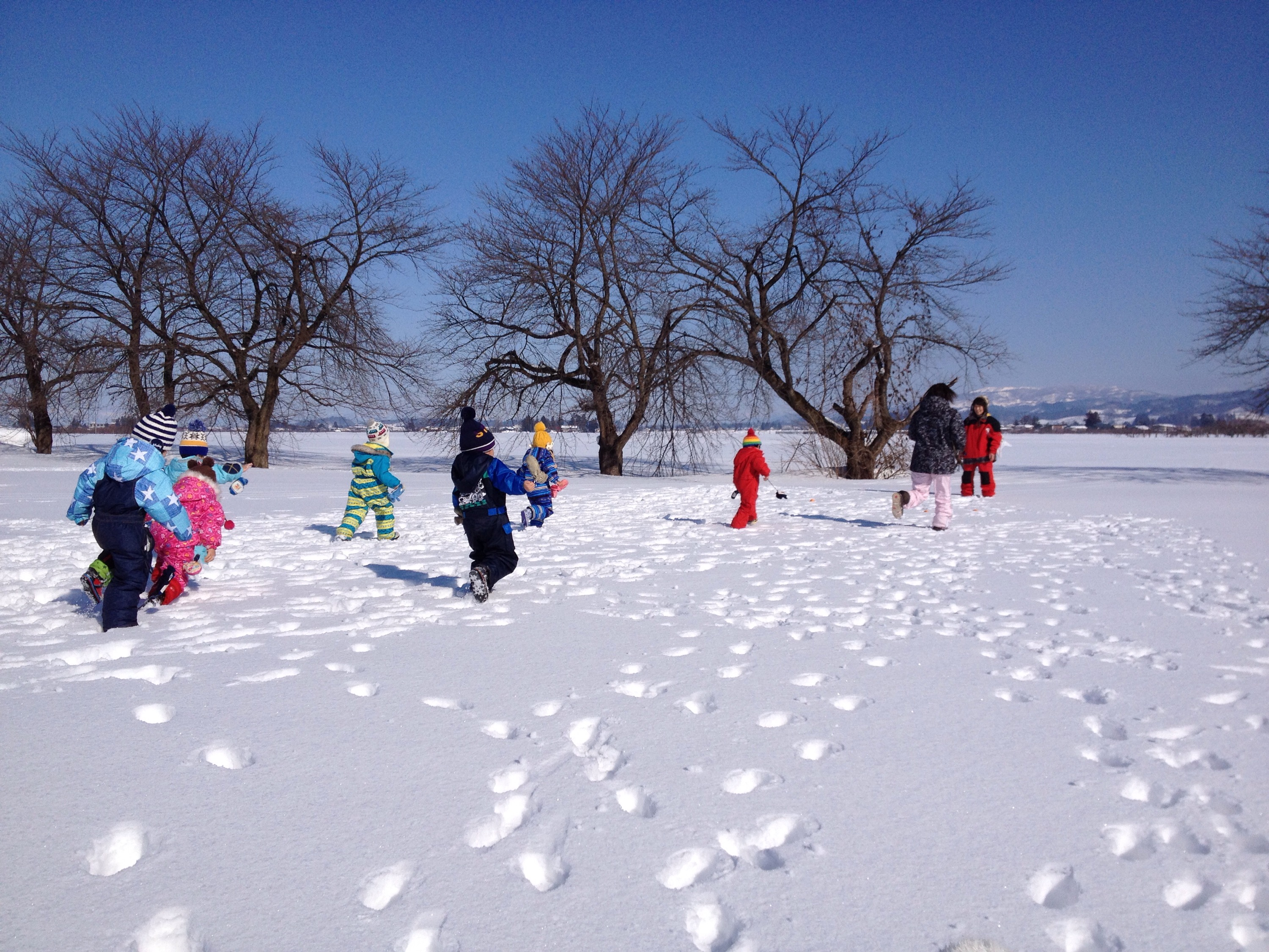 雪遊びの途中に水分補給を兼ねて、みかんのおやつをいただきました♫ でも、タダでは食べられません! 足がズボズボ埋まる雪の上を走り、雪の上に置かれたみかんを取りに行かなくていけません。しかも、そこから、遠くで見守ってくれている園長先生にタッチをしに行ってから、担任の先生のところに帰らなくてはいけません! 足がズボズボ埋まるので、思うように走れませんが、みかんのためにがんばりました(^^)