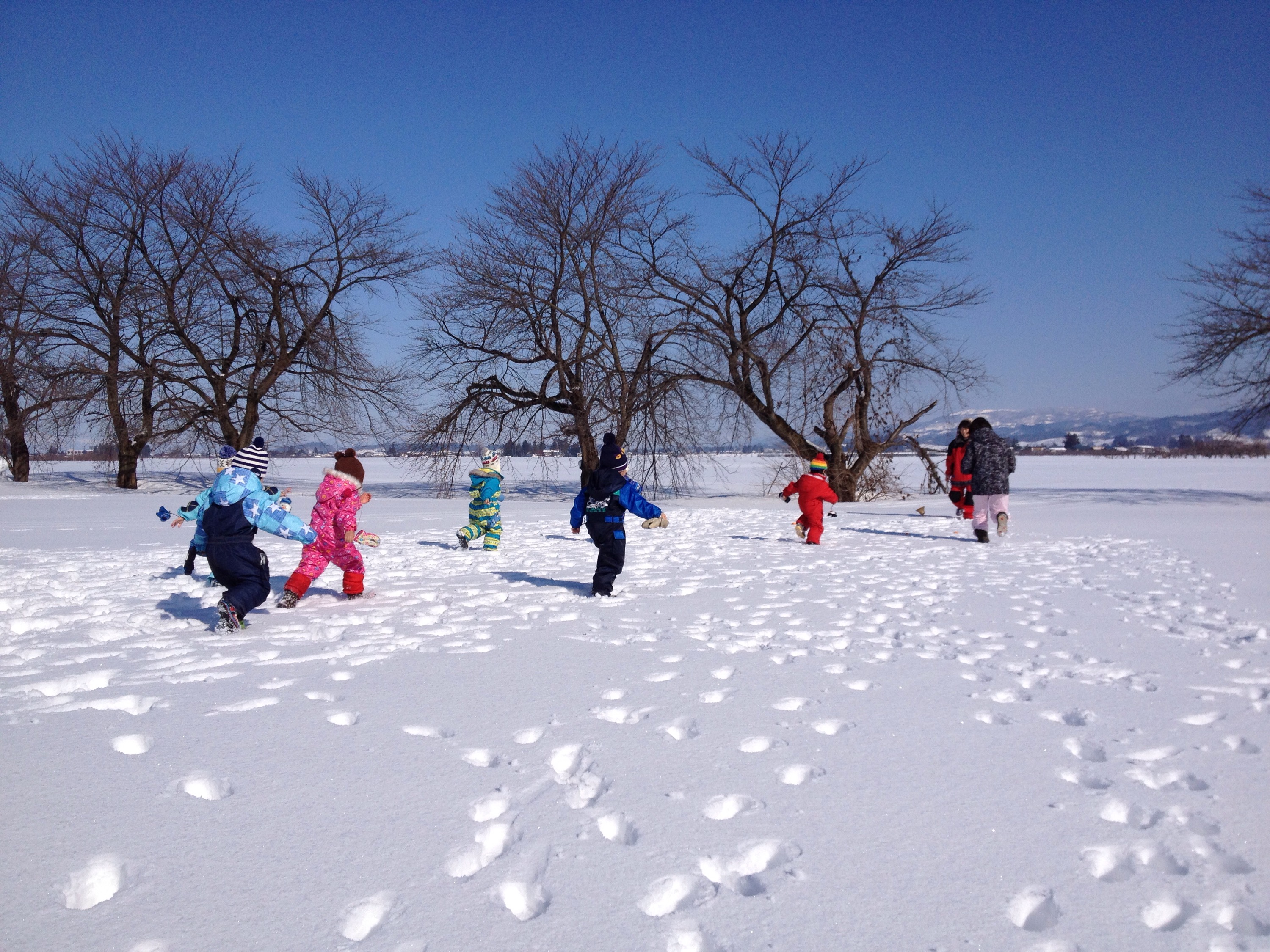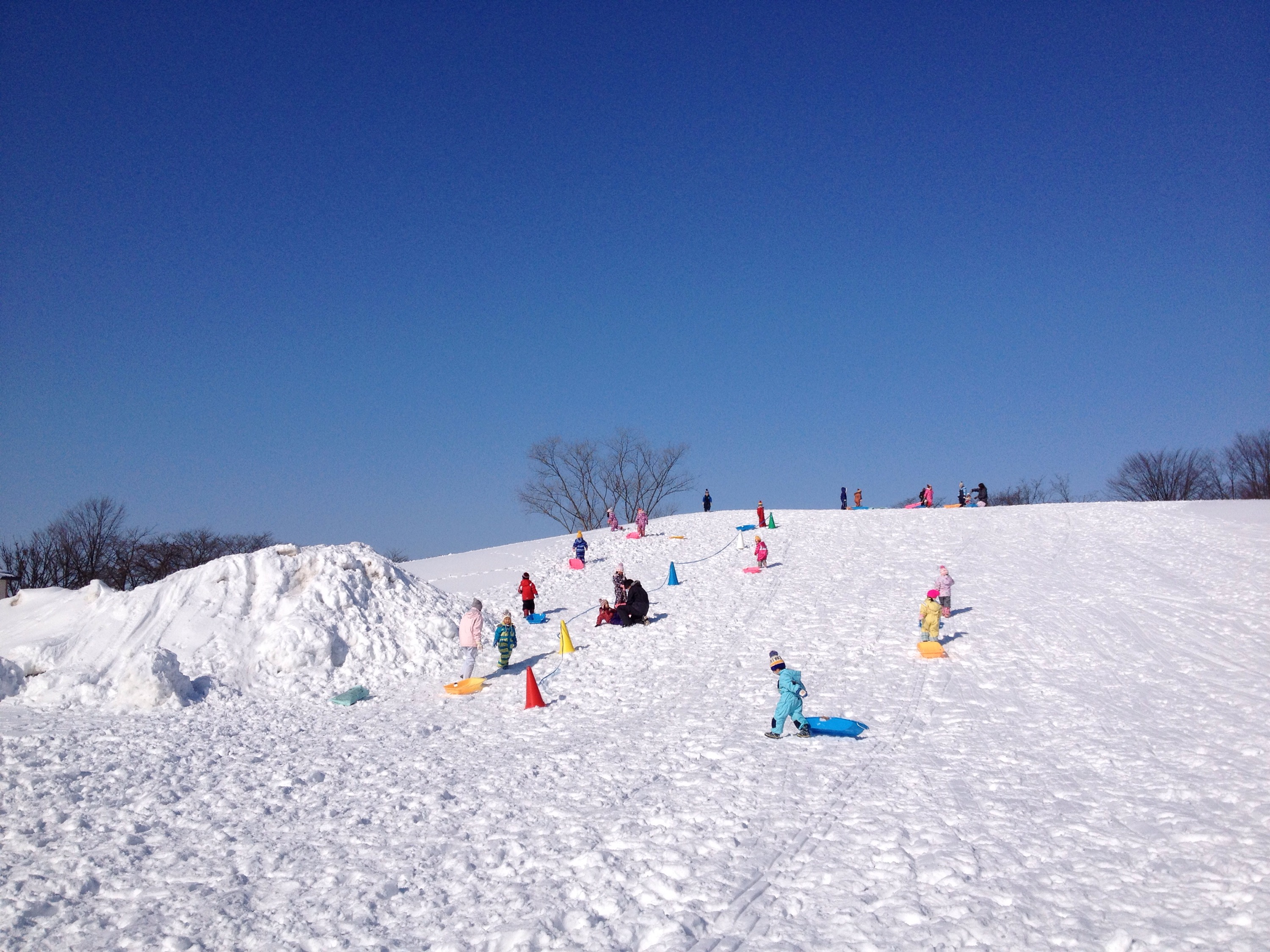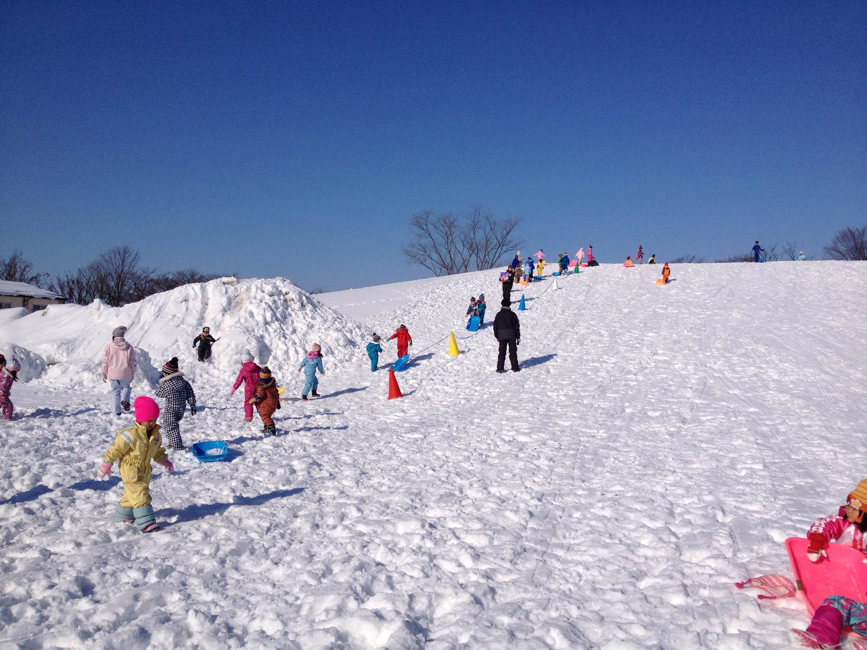 きれいな青空が広がり、雪遊びには最高の天気の中、今日は、全クラス、上掵団地にそり遊びに行ってきました♫