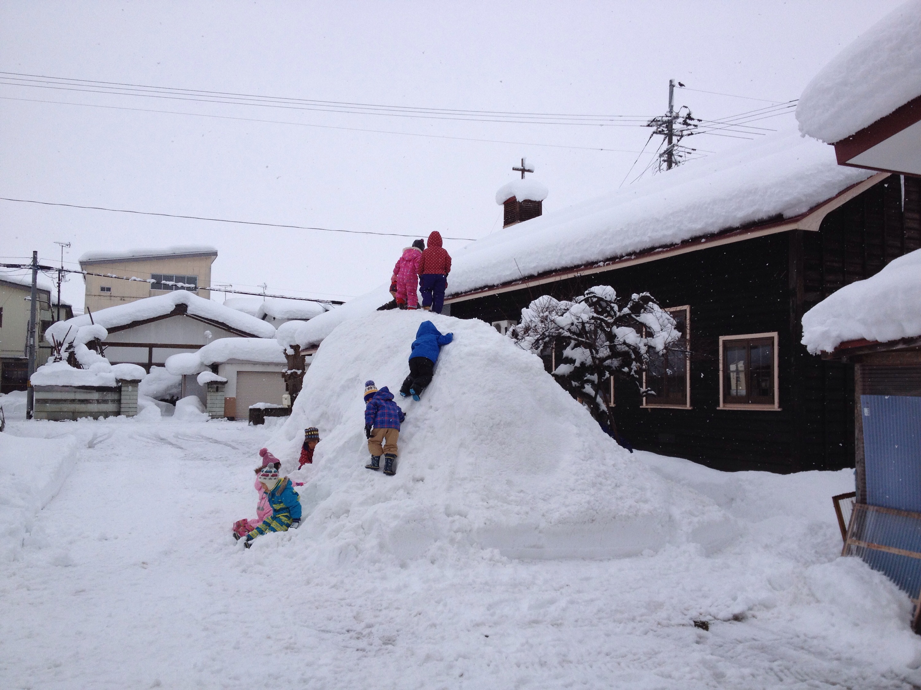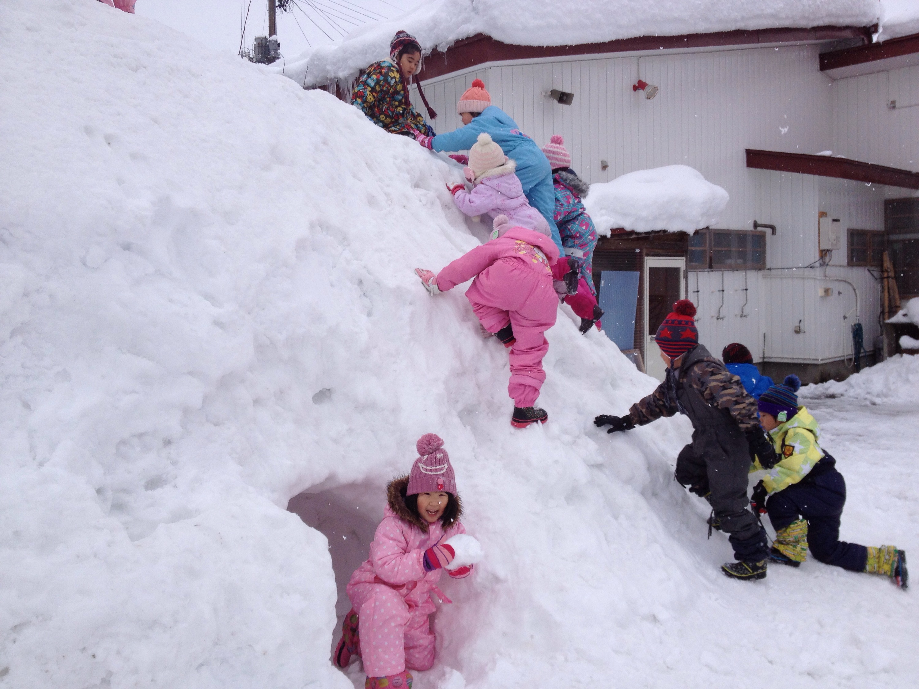 除雪で出来た大きな雪山に登る子どもたち。昨年、力がうまく入らずにか登れなった男の子が、今年は両手両足を上手に移動させながら、果敢に挑む姿がありました。