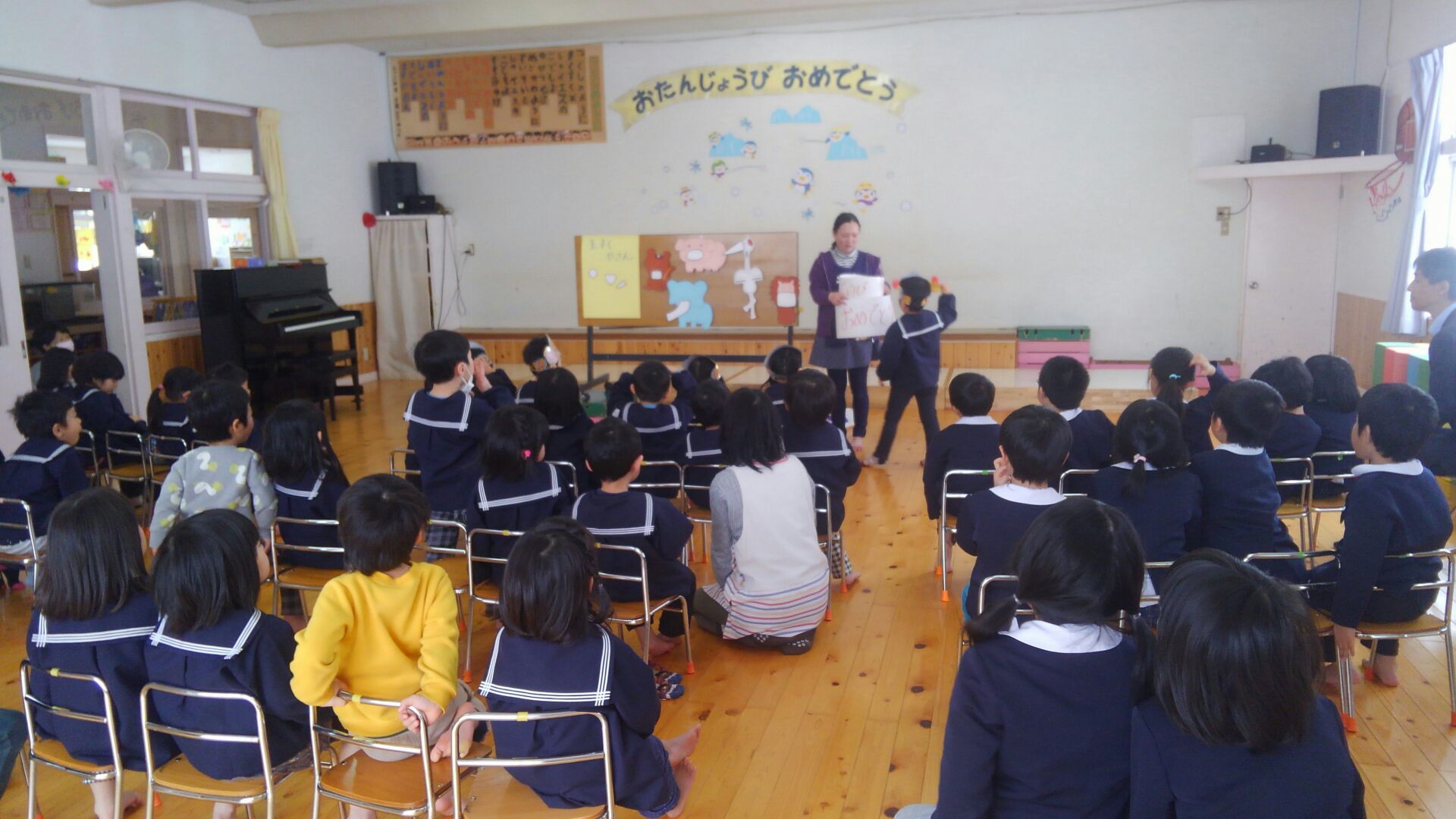 お楽しみタイムは、季節の歌でもある「コンコンクシャン」の歌に合わせた楽しいペープサートで、登場してくる動物たちに合ったマスクを誕生児の子どもたちに選んでもらう楽しい時間となりました♪