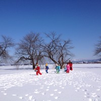 雪遊びの途中に水分補給を兼ねて、みかんのおやつをいただきました♫ でも、タダでは食べられません! 足がズボズボ …